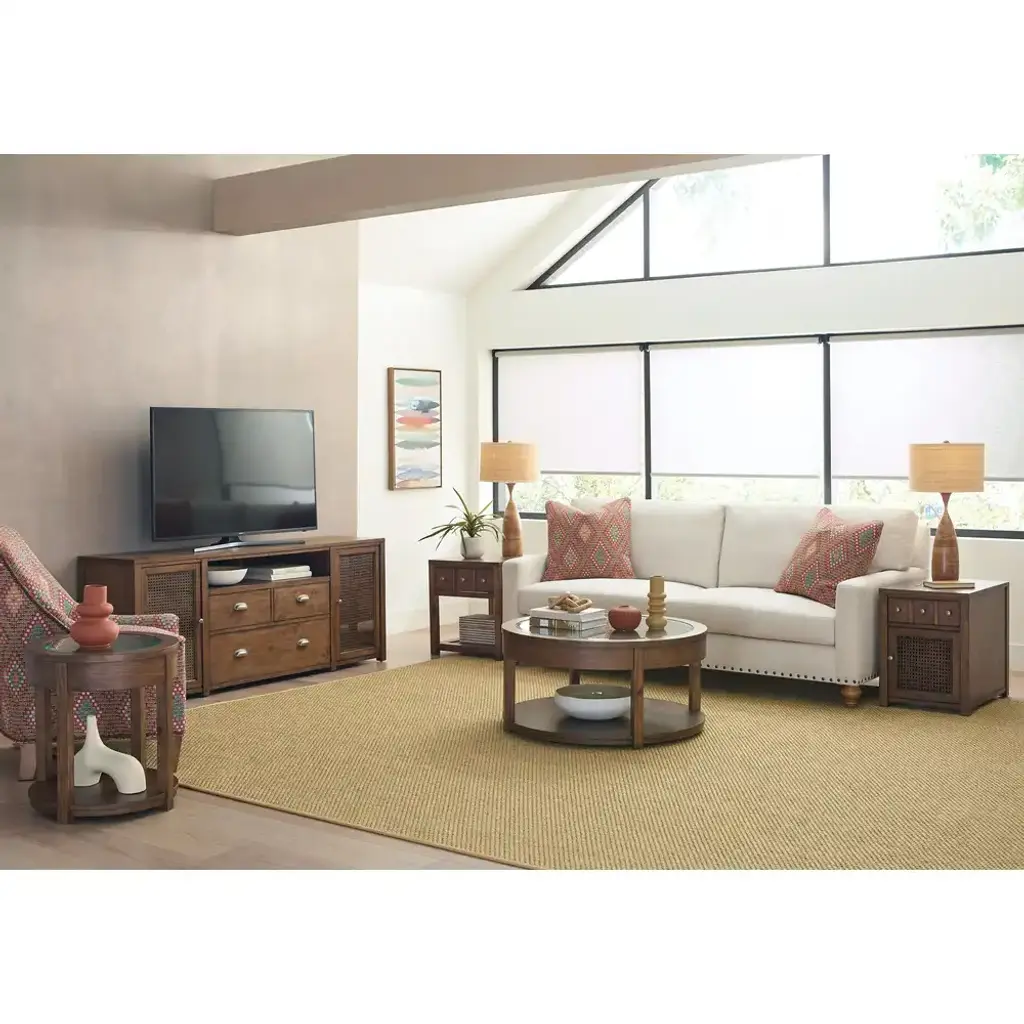 The Foster Round Coffee Table embodies refined tropical elegance with its distinctive British West Indies-inspired design. This exquisite piece showcases a sophisticated glass top that provides an unobstructed view of the table's most captivating feature—intricate cane accents that introduce organic texture and visual interest to your living space. Crafted from premium Alder veneers in a warm Hazel finish, the table exudes a timeless quality that complements various interior styles. A thoughtfully designed lower shelf offers additional display space for books, decorative objects, everyday essentials, enhancing the table's functionality. For ultimate versatility, the Foster includes discreet casters that provide effortless mobility.