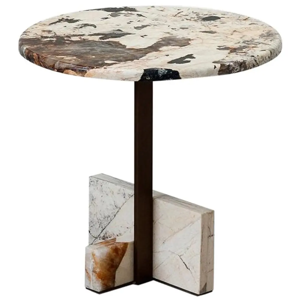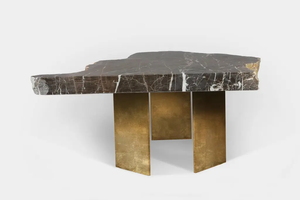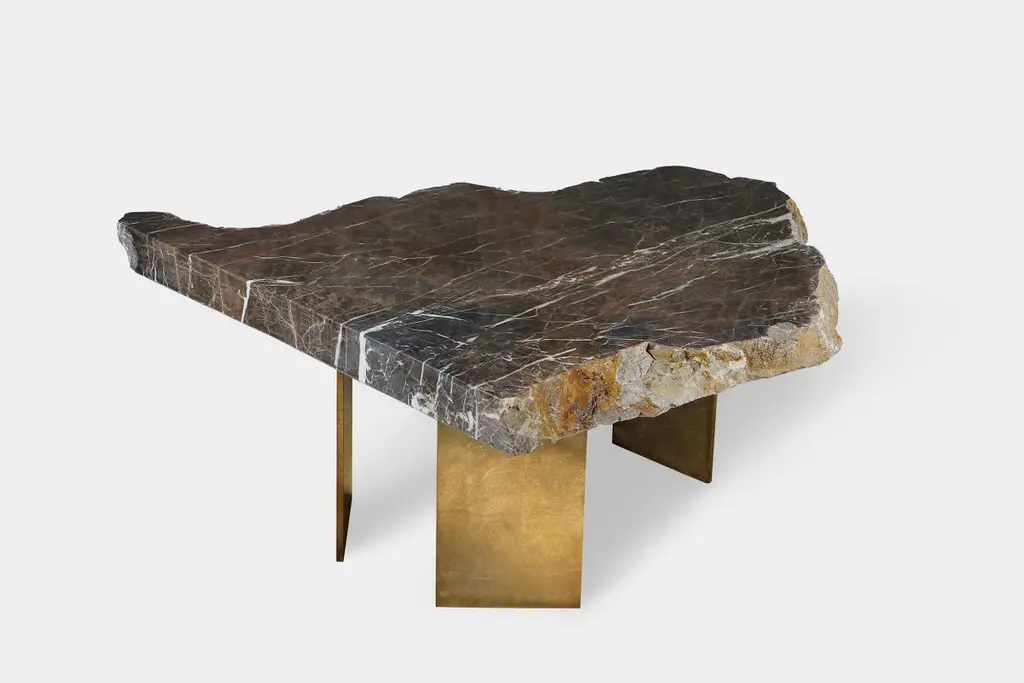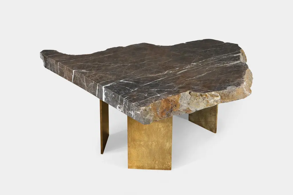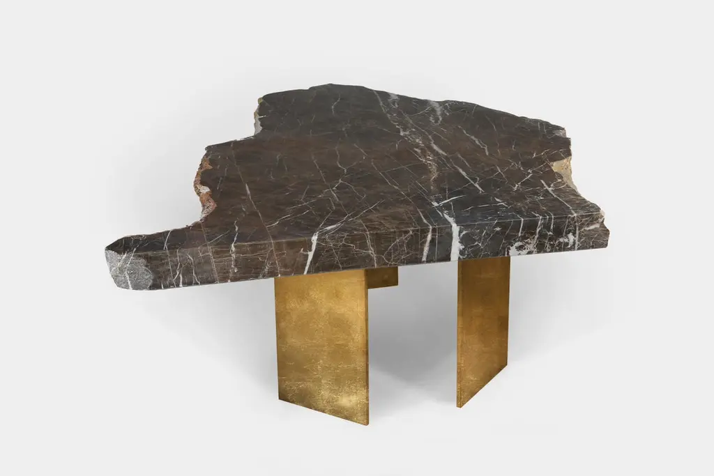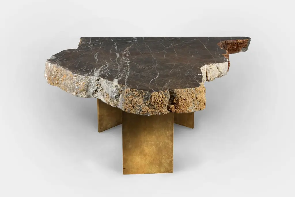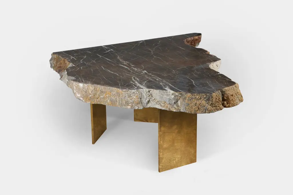 Found I coffee table No.1 by A SpaceDimensions: D 64 x W 69 x H 43 cmMaterials: Marble, steel, gold leaf.FOUND I collection centers around the power of the medium to dictate the final form that art objects take. Each piece of marble was hand-picked at a small family-owned quarry in the South of Turkey with an intention to work around its imperfections. This collection exposes the rough texture of natural stone, celebrating its beauty and reminding of the mountains that the stone came from.A S P A C E is a New York-based design & art studio, co-founded by Anna Aristova and Roza Gazarian in 2016. Their collaborative pieces are an attempt to bring in the timeless beauty of nature to contemporary lifestyle, whether it’s functional furniture or a decorative object. The essence of each of their creations is a sense of a vast open space, where ideas, thoughts or feelings spontaneously arise, evolve through experimentation and ultimately manifest as a functional art piece. Each object is a one-of-a-kind creation that beckons to look beyond mere form and material, and to connect to the primordial nature of the elements. Their work is a constant balance of opposites -- improvisation and thoughtful planning, intuition and knowledge, organic and geometric, timelessness and impermanence.