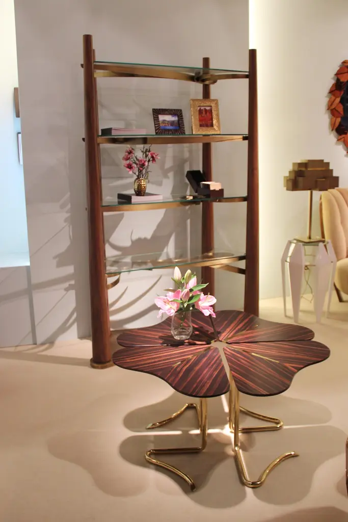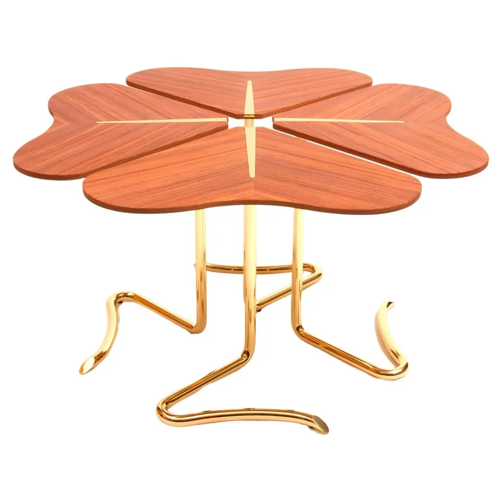 Four… for Luck is an interpretation of the Legend of the four-leaf clover, in which each petal represents a meaning.The concept of independence was explored so that the four parts, hope, faith, love and luck, can play a free role whenever necessary. Slender and projected in the air, each petal has a thin nickel detail that divides the two parts finished in listed ebony, walnut or rosewood.The excellence of materials combined with the accuracy of the small handcrafted details made by Portuguese artisans transform this nature inspired design in a true refined and elegant coffee table.Product detailsTop: wood structure finished in walnut veneer in high gloss varnish. Plate recessed into the wood in polished nickel.Base: handcrafted feet in solid polished stainless steel.Product optionsTop: other veneers or lacquered in any Ral Classic color finished in matt, half gloss or high gloss varnish.Base: polished, brushed, oxidized brushed or aged brushed brass/copper/nickel.Weight 24kg 53 lbsMade to order. Custom sizes and other finishes are available under request. Designed by Joana Santos Barbosa, 2013. Handmade in Portugal.