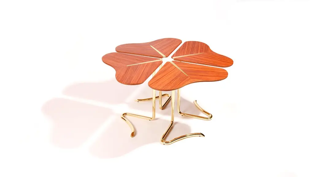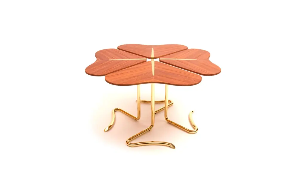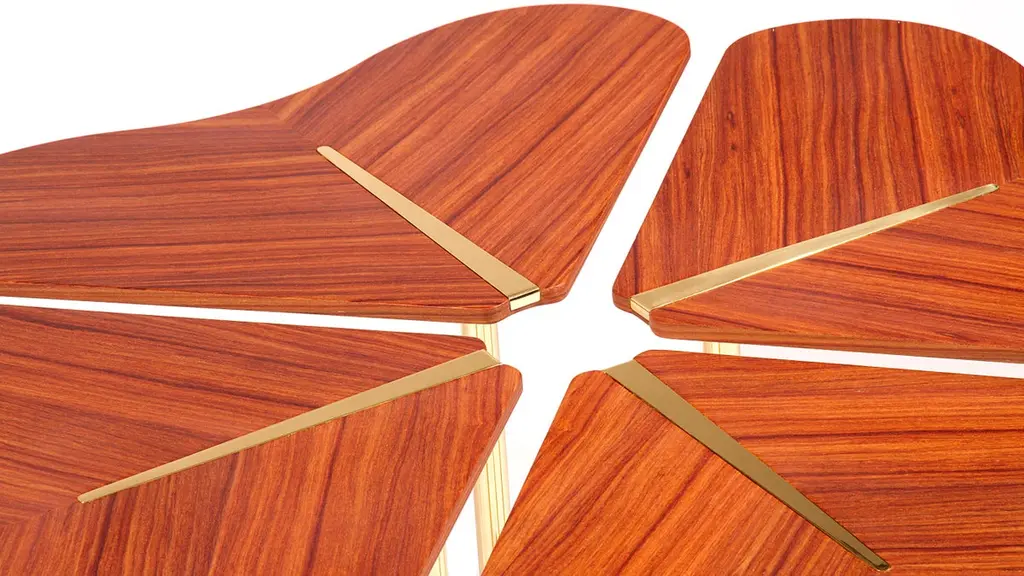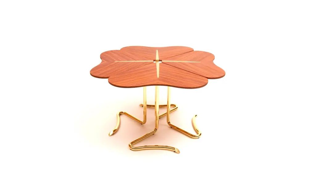 Four... For Luck Rosewood Coffee Table by InsidherLandDimensions: D 80 x W 80 x H 48 cm.Materials: marquetry work in rosewood veneer, solid polished brass.24 kg.Also available in ebony or walnut.Four... for Luck is a special clover with a creative process based on the interpretation of the Legend of the 4 leaf clover, in which each petal represents a meaning. The concept of total independence was explored so that the four constituent parts of the whole - Hope, Faith, Love and Luck - can play a free specific role whenever necessary.Slender and projected in the air, each petal finished in listed rosewood veneer is like a real leaf in which the organic thin stem rises dividing it into two parts. This detail of separation that creates the continuity between petal and stem is emphasized in polished brass.The excellence of materials and finishes combined with the accuracy of the small details makes this center table a true refined and elegant furniture piece.A Legend gains strength through belief and each legend is contested by disbelief. Winston Churchill said "I don’t believe in luck, I believe in attention to detail." Stories, legends and memories take shape over time.We don’t know the true power of this legend but just in case Joana Santos Barbosa created Four... for Luck, through the attention to detail.Created by Architect Joana Santos Barbosa in 2012, InsidherLand is a Portuguese brand of exclusive design. Drawn with the signature of the creator, the impressive range of contemporary luxury furniture, lighting, upholstery and accessories are connected to her personal memories and have been highlighted for their innovative and soulful designs.Joana explores several influences from travels around the world to define her own Land as a place that allows her to translate her perceptions into objects of art.The essence of InsidherLand is presented by two inspiring collections. Beyond Memory Collection is deeply influenced by organic forms of nature, legends and traditional cultures, as for the Identity Collection is molded by forms of Architecture and Art. Both collections are designed as a dialog in which nature meets strong architectural lines to create relaxed and sophisticated interiors surrounded by natural materials and meaningful art pieces.Being positioned in strategic markets of high-end luxury decoration, InsidherLand team is proud of working with the best architects and interior design studios from all over the world who seek for handmade exclusive objects that arouse emotions and stand out in exquisite spaces.We are dedicated with love and enthusiasm into every creation to surprise a sensitive but demanding public. Using the expertise of traditional craft techniques, all creations are made by the hands of Portuguese master craftsmen and jewelers who wisely sculpt them in noble materials, finalizing every detail with elegance and perfection.