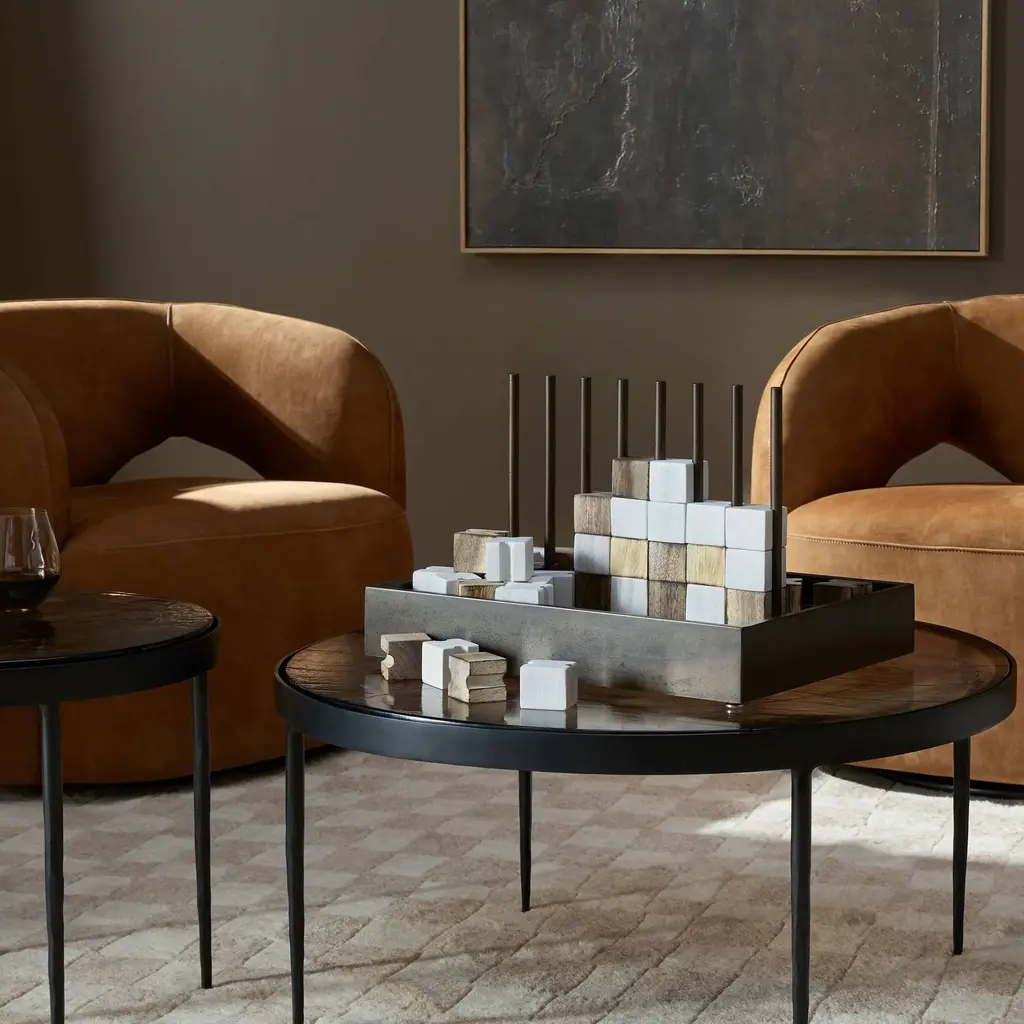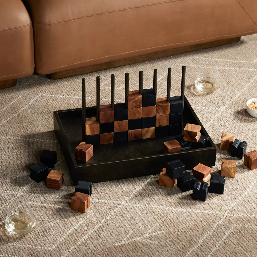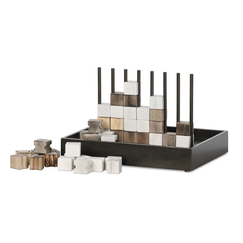 This unique Four in a Row game from Four Hands, crafted from solid recycled wood and iron in a rustic finish, adds a touch of elegance to any home. The decorative yet functional design of this eye-catching game is highlighted by its geometric lines and clean shape, making it a perfect addition to any shelf or coffee table. Highlights