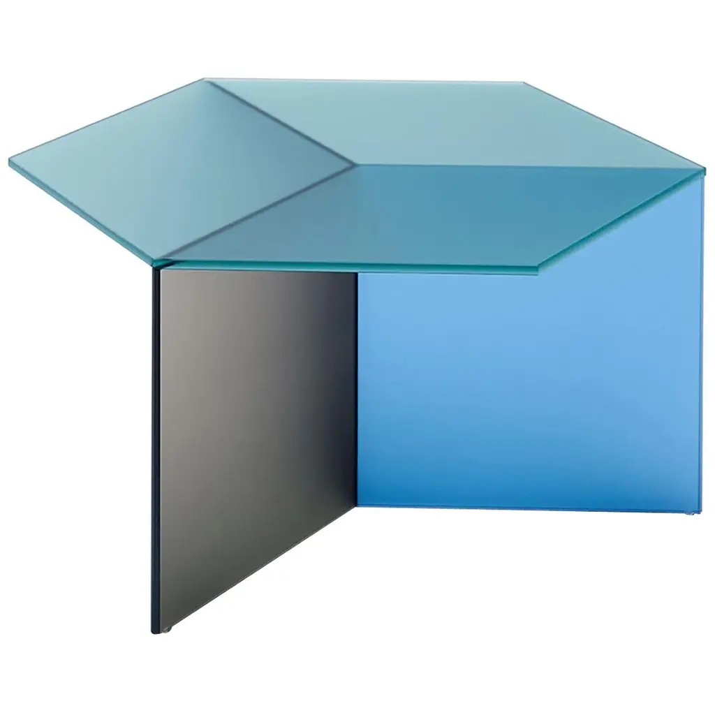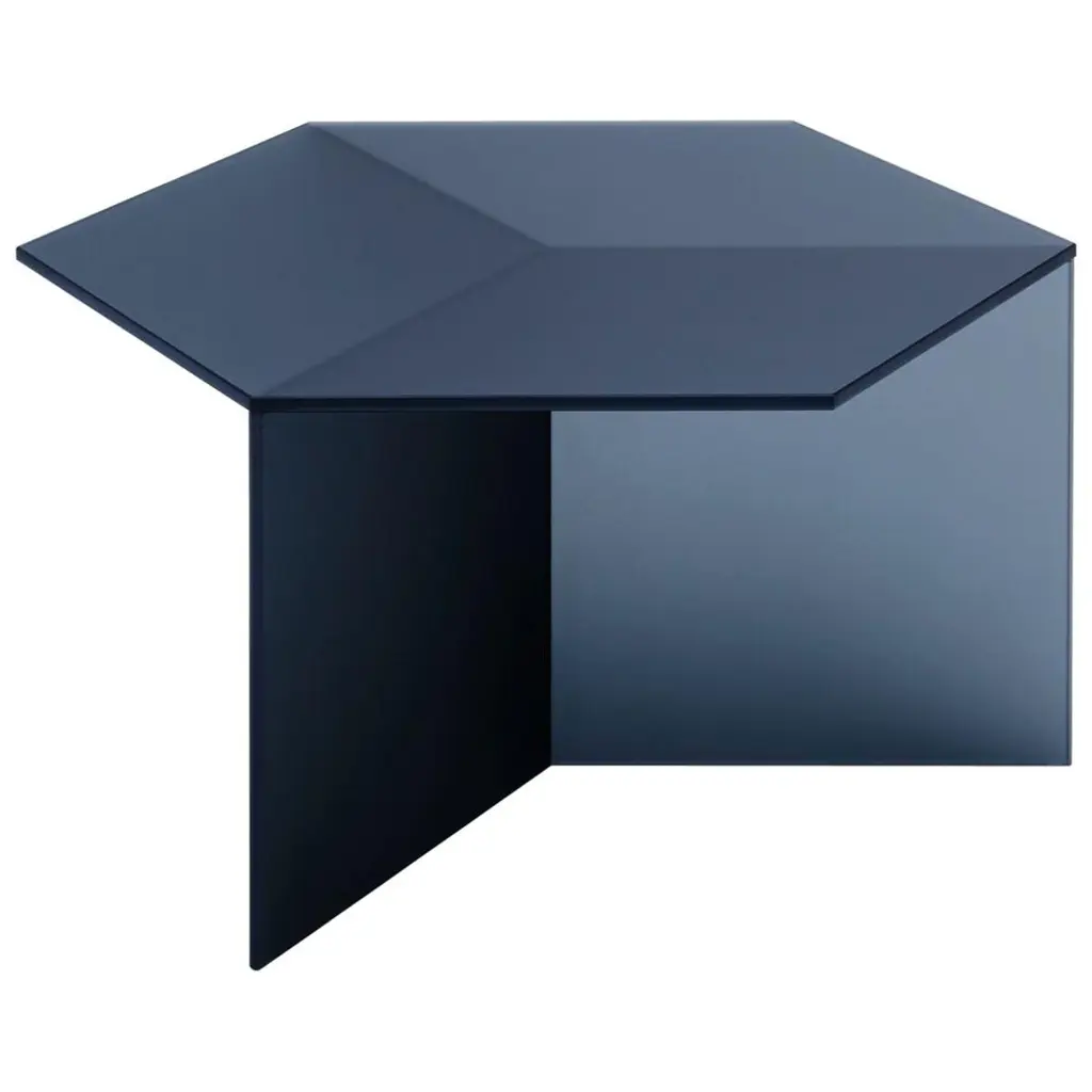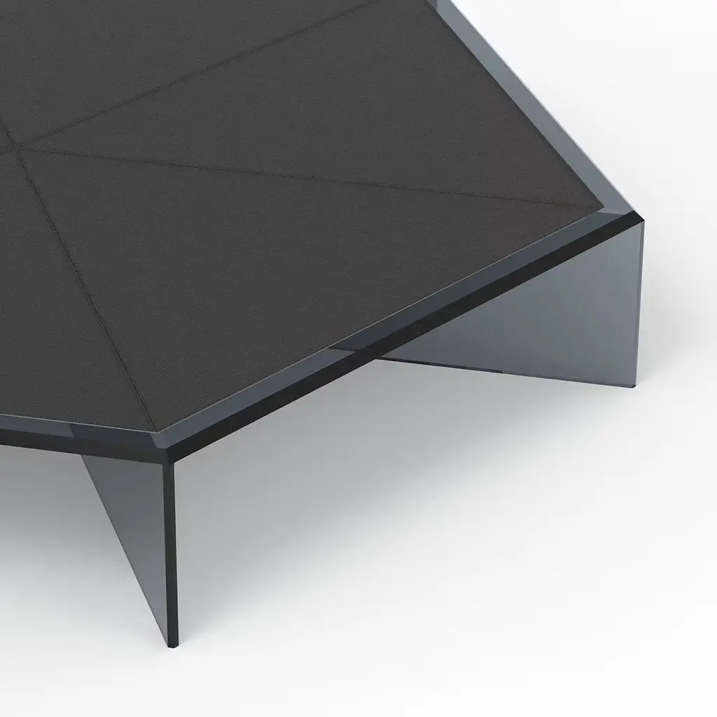 A sophisticated smoky gray hexagonal crystal table by Marc Krusin, featuring a black coffee leather insert. Available also in bronze or extra-clear glass, it offers customization with leather inserts in black coffee, beige, prussian blue, and salmon red. Its unique hexagonal shape and premium materials make it perfect for enhancing any space. Please ask the Concierge for other info.
