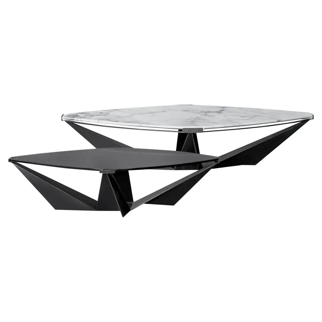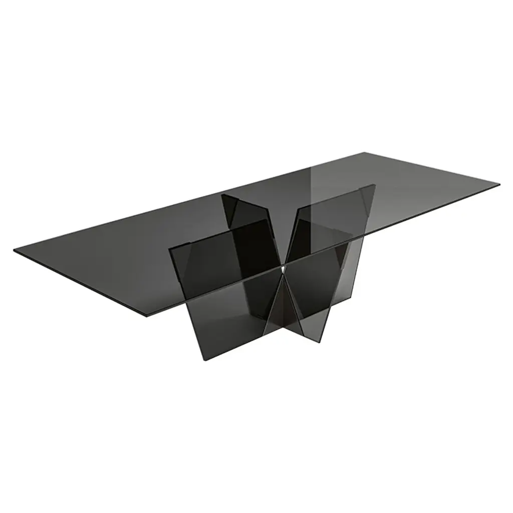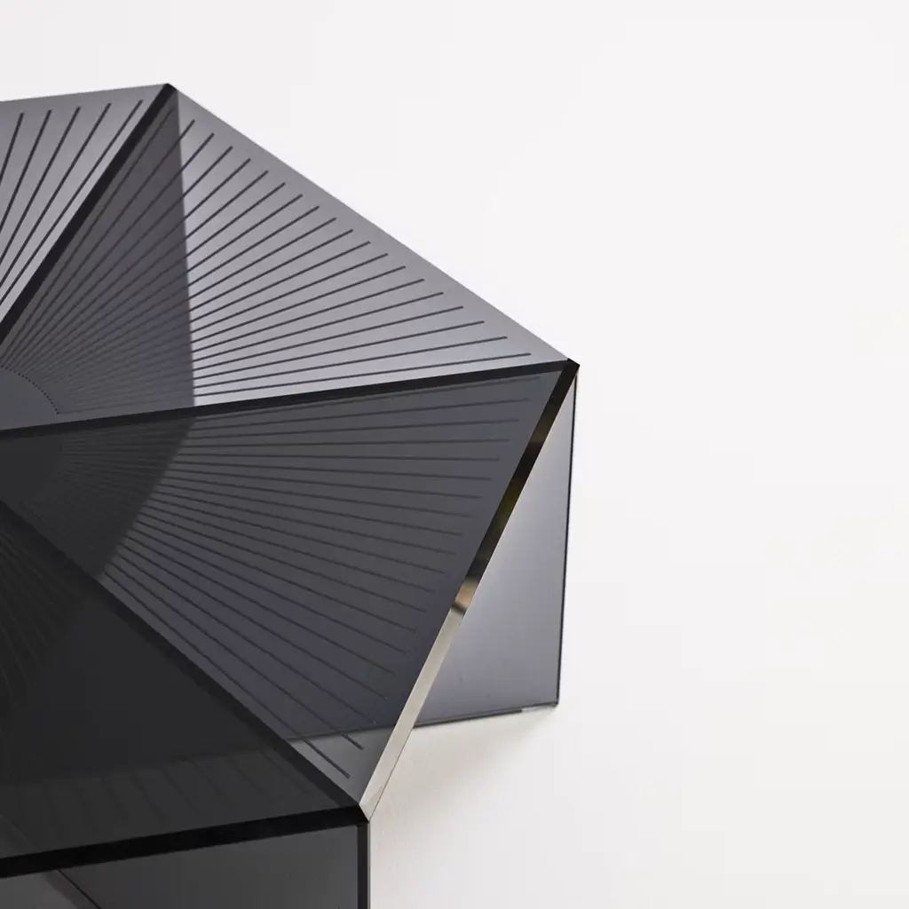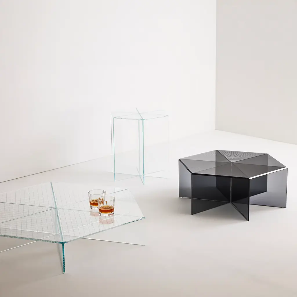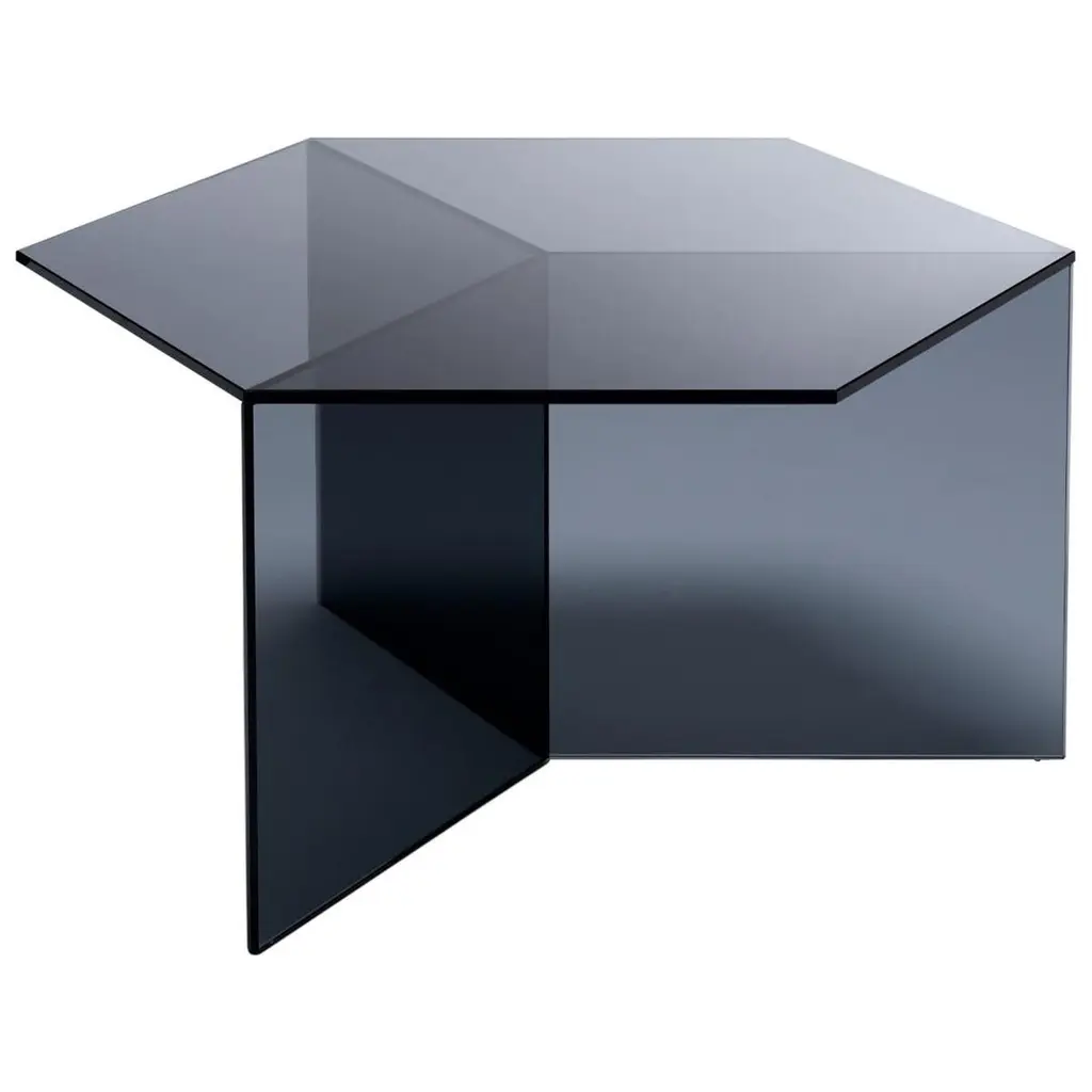 Presenting the Hexagonal Glass Table by Marc Krusin, featuring a smoked gray glass top with a sophisticated Sandblasted Radius Pattern. The elegant table combines modern aesthetics with intricate detailing, perfect for enhancing any contemporary space. Available in different finishes. Please ask the Concierge for other informations.