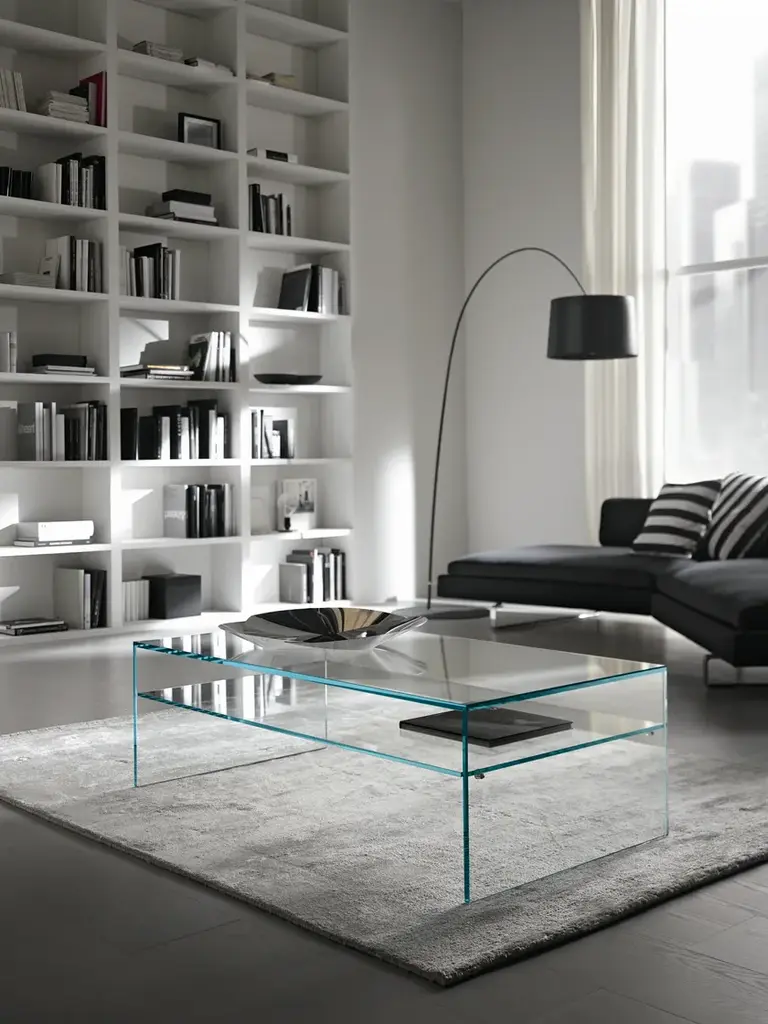 A bridge-like structure that is completed by a practical transparent or acid glass undershelf. Size: 90 x 90 x h 40 cm; 118 x 88 x h 40 cm; 128 x 68 x h 40 cm; 100 x 60 x h 40 cm; Thickness: 15 / 10 mm Load: 50 kg