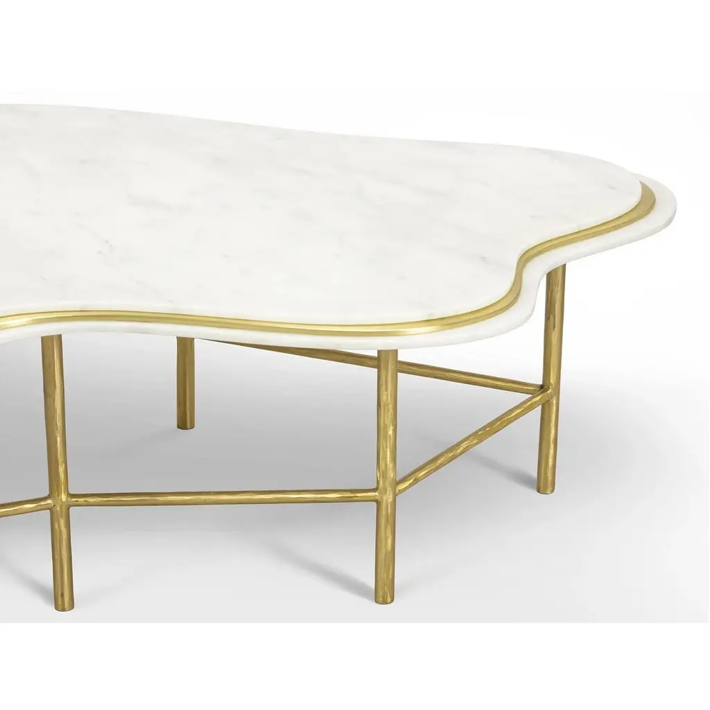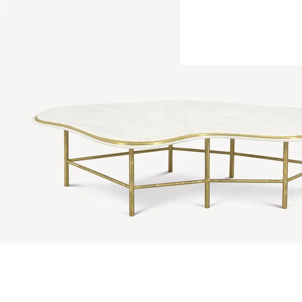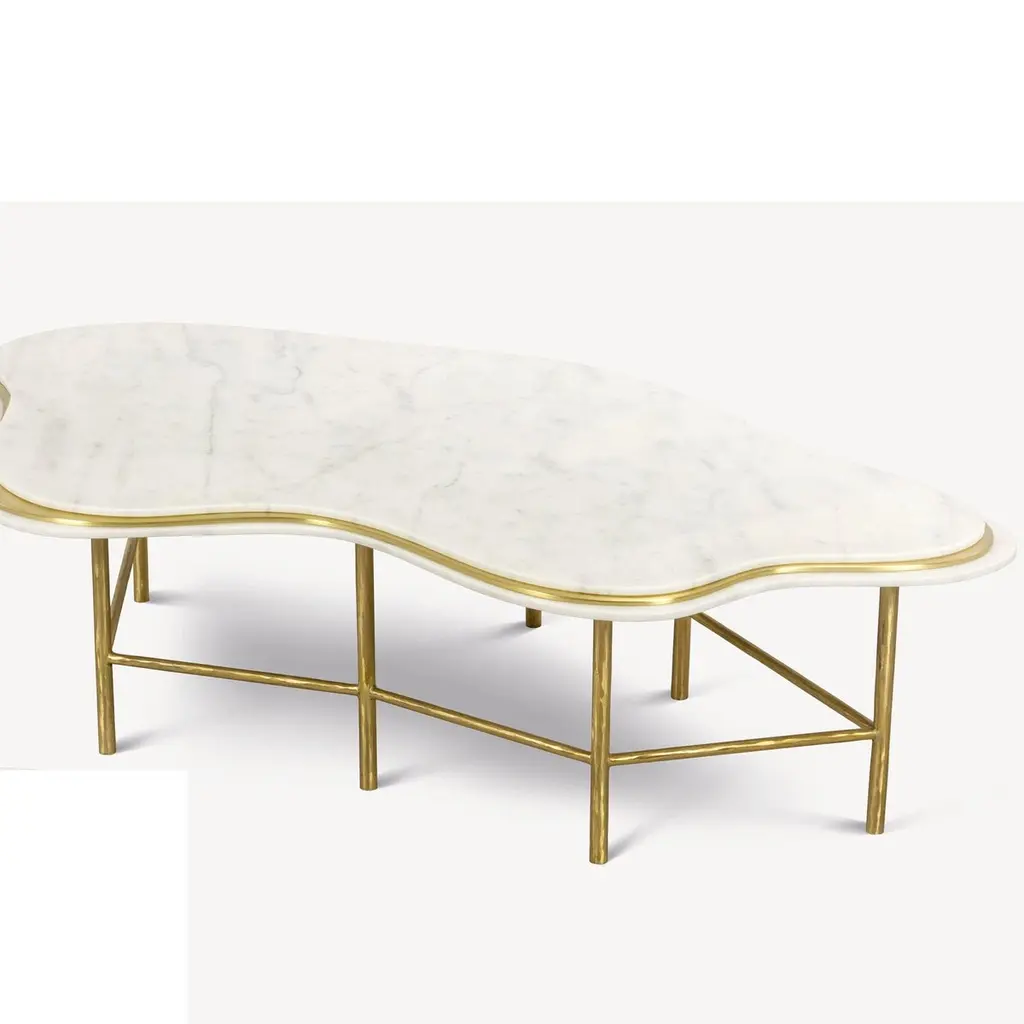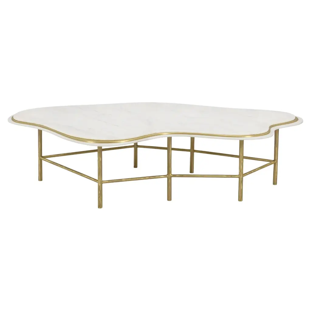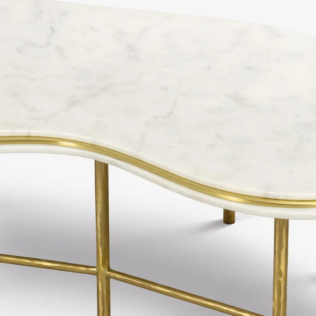 This exceptional coffee table is defined by its clean yet distinctive combination of elements. Its refined elegance comes from the thoughtful architecture of its brass base and a unique three-layered top. This organically shaped tabletop features two layers of beautiful Estremoz marble and one layer of rich brass, all seamlessly integrated. The continuous brass structure flows down to form the table's feet, creating a cohesive and sophisticated statement piece for any room.Contact us for enquire about finish and size customizations.We do our best to expedite production and to ship and deliver product within the listed lead time, however current lead times might be longer due to global shipping backlog and delays. These delays are out of our control and cannot be a reason to cancel an order.