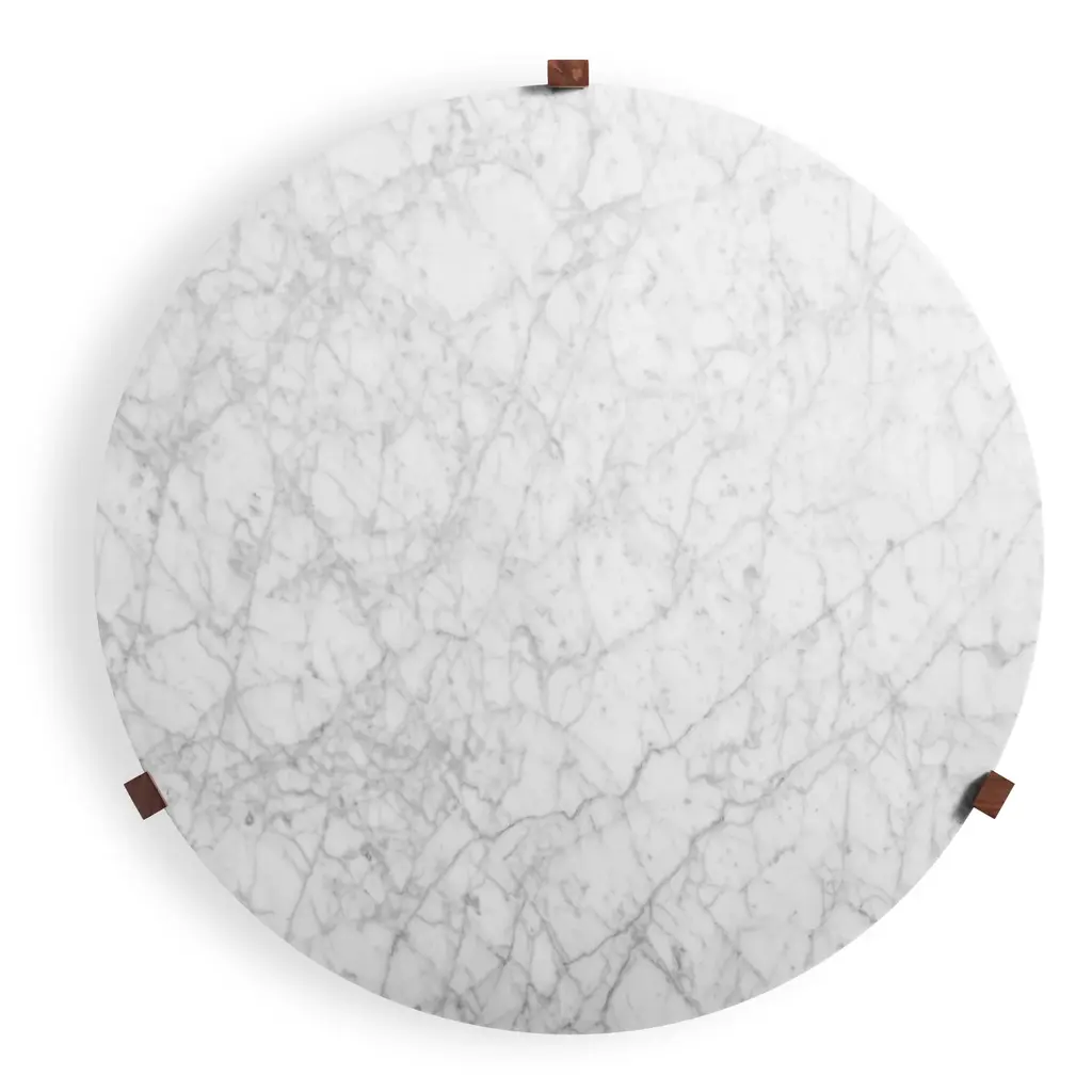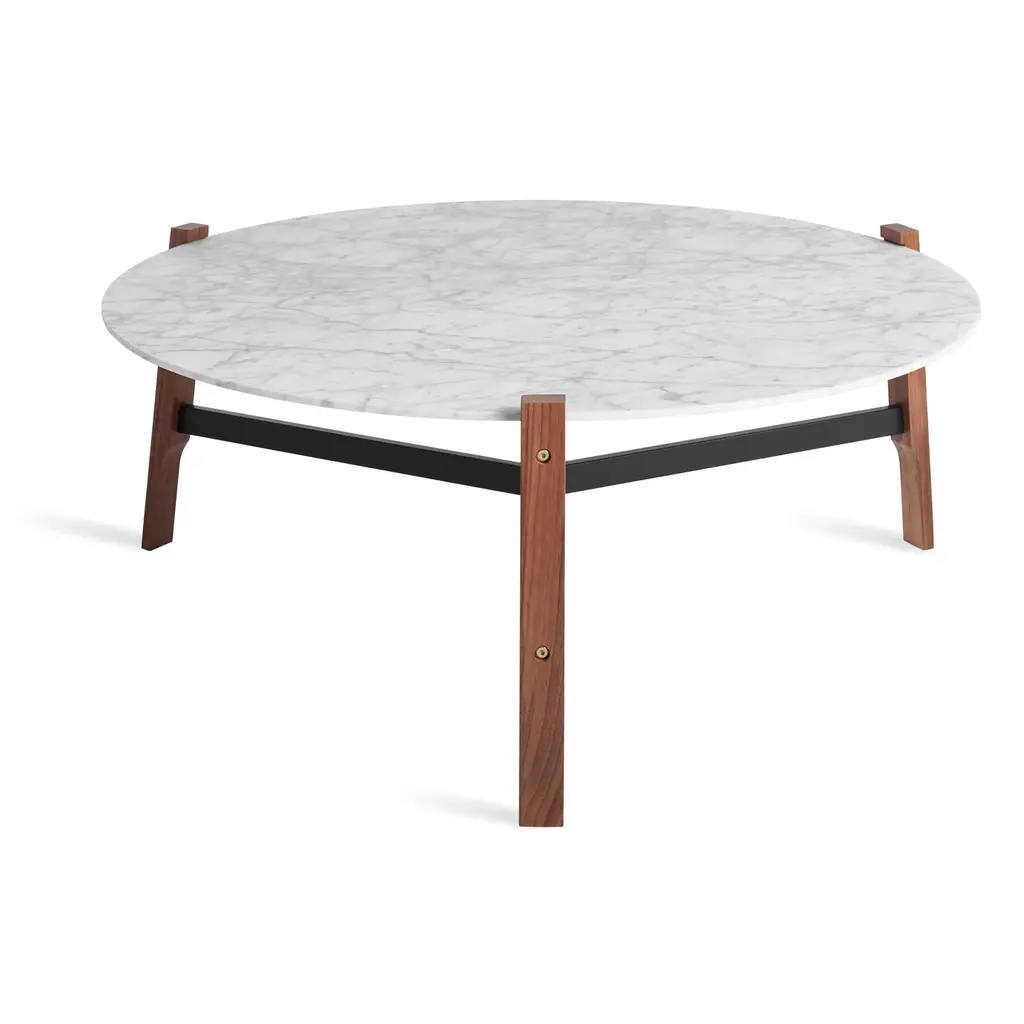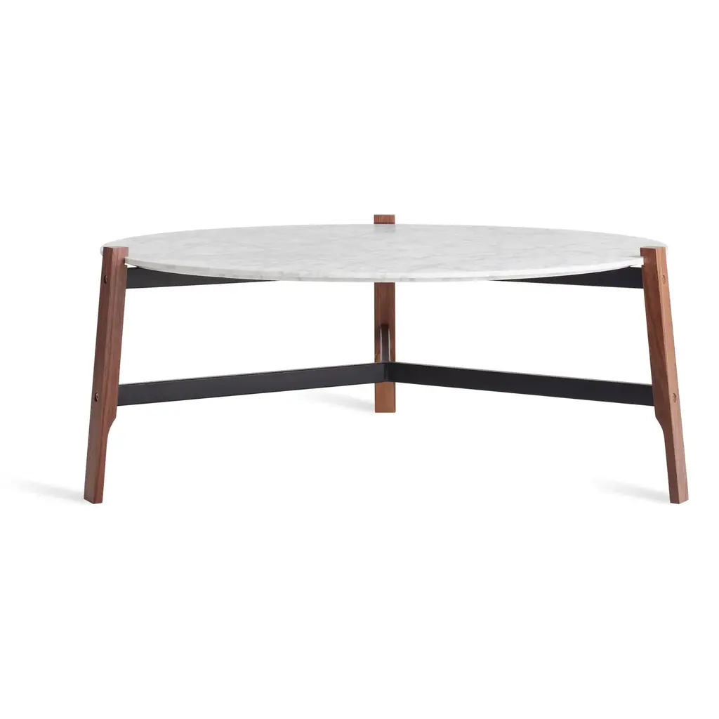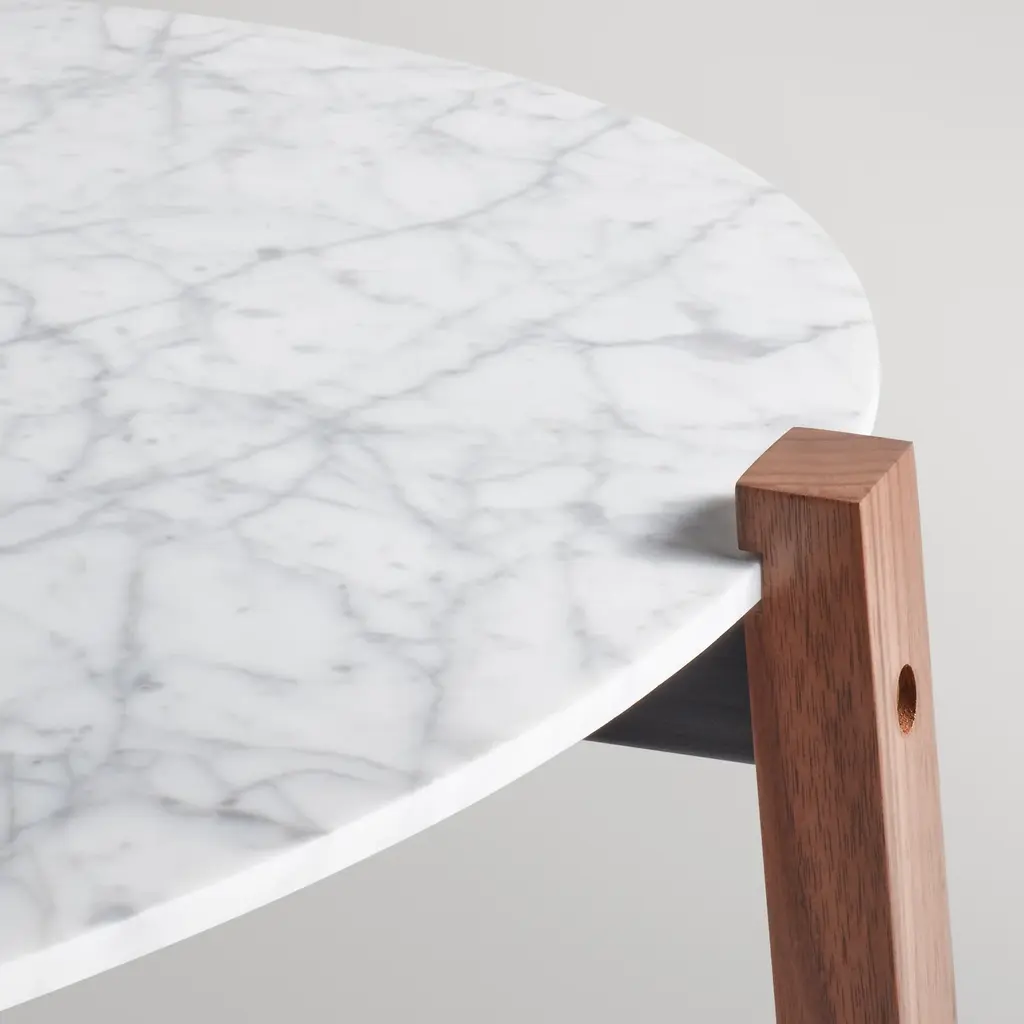 Sophistication unfettered. Solid walnut legs capture a marble top, while brass details and a black steel frame bring a dash of drama. Side table also available.