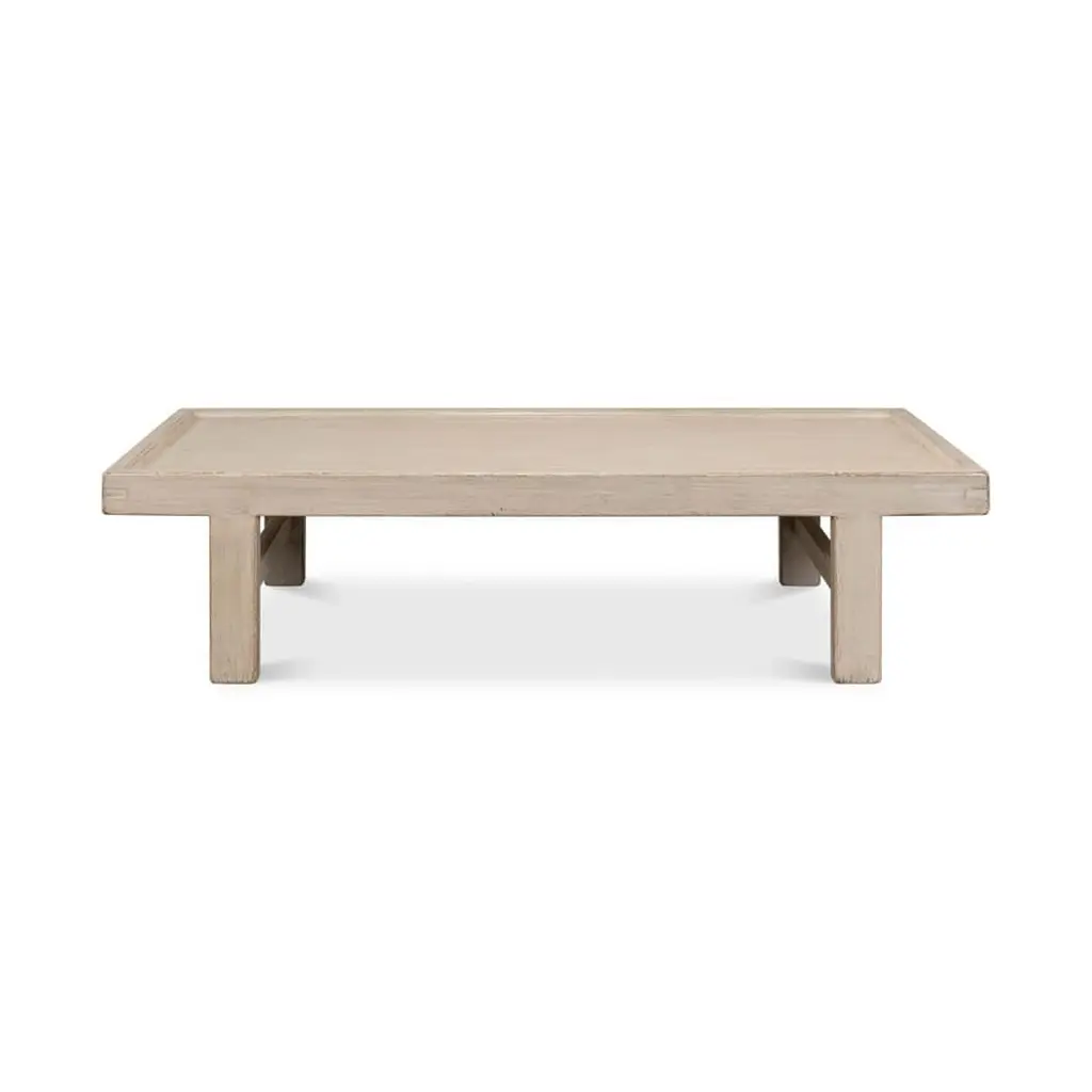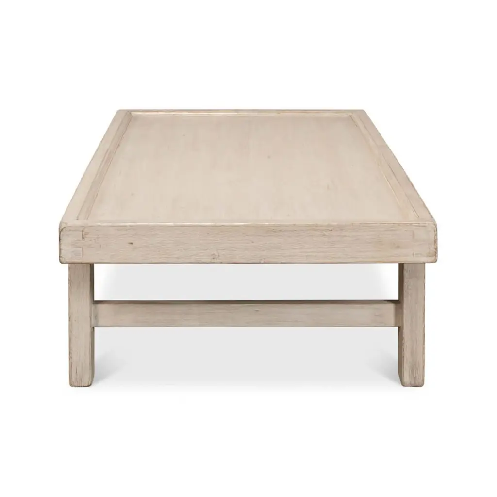 This large table brings the warmth of the countryside into your home with its natural wood top and distressed French-gray painted finish. The sturdy, low-profile design is reminiscent of a vintage farm table, offering a spacious platform for your cozy evening teas or morning coffees. Its broad surface is ideal for displaying your favorite rustic decor or just providing a resting place for your books and remotes. With its authentic country charm, this coffee table invites relaxed living and becomes the heart of your living space, where stories are shared and memories are made.Dimensions: 80" W x 37" D x 19" H