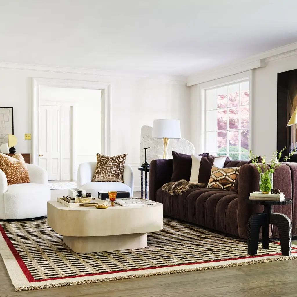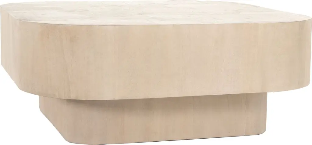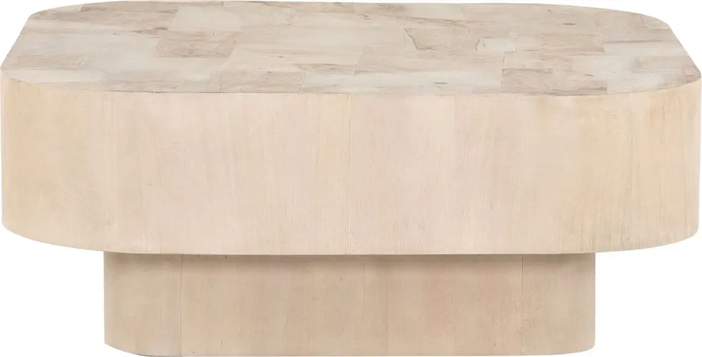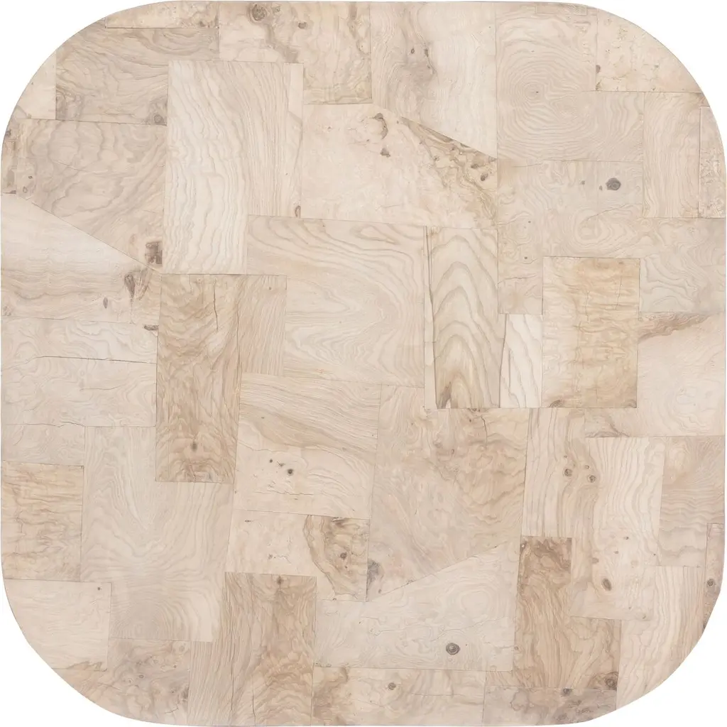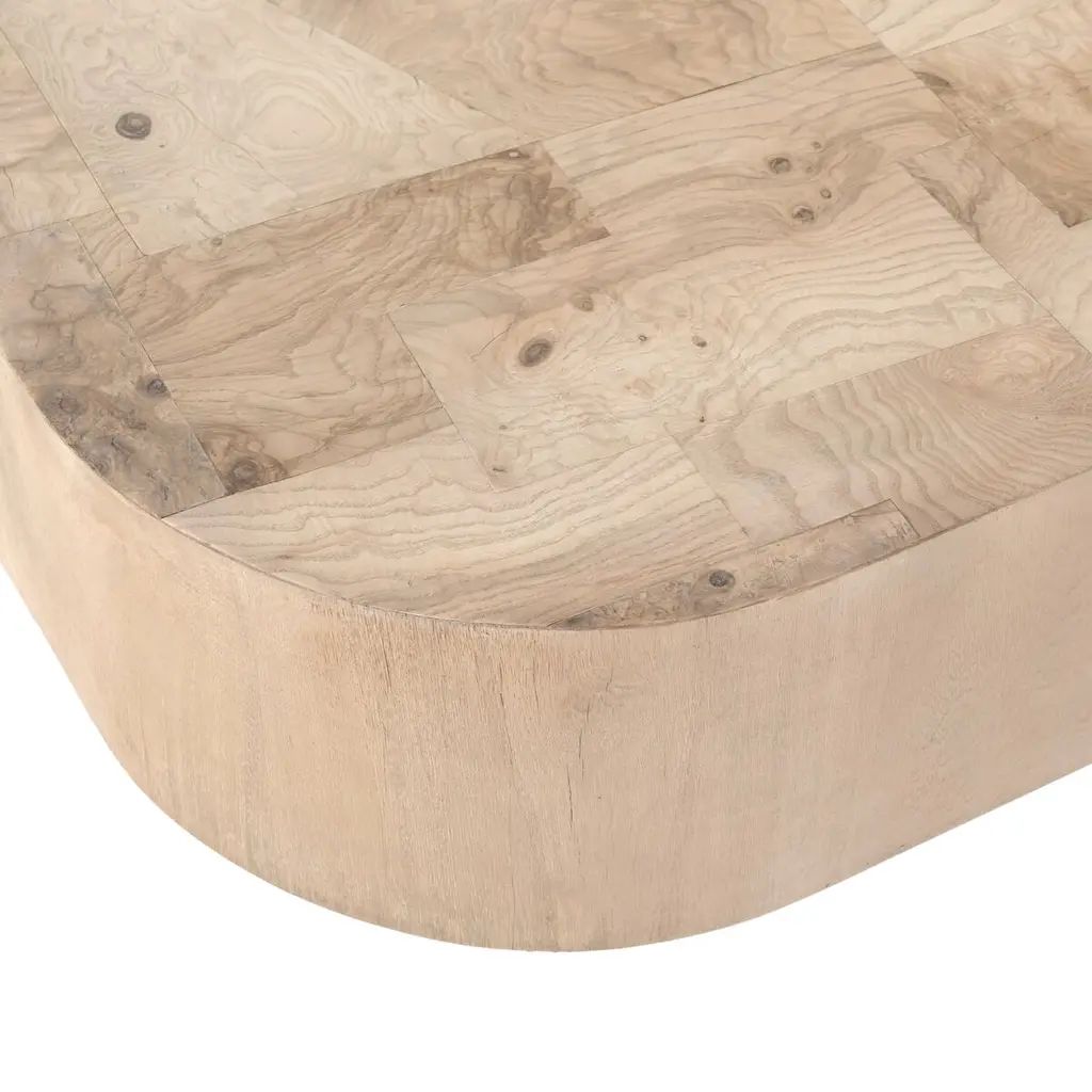 A patchwork pattern of bleached burl ash adds panache to the top of this cocktail table. The sides, with a straight-grain mahogany veneer, are finished in the same pale shade, which along with the rounded tabletop corners gives an unexpected breeziness to the solid shape.
