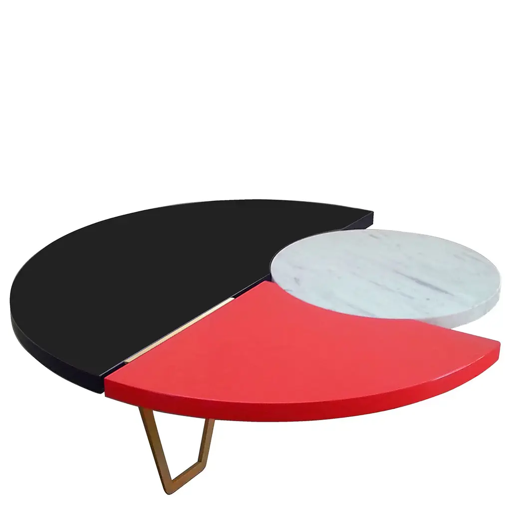 This elegant coffee table belongs both to the Metaphysics Collection and to the Eclipse Series. Its abstract design is a representation of aerial photography, inspired by Art Deco with a modern twist. The brass legs support a top of white marble and wood, decorated with black and red hand-applied premium resistant lacquer.