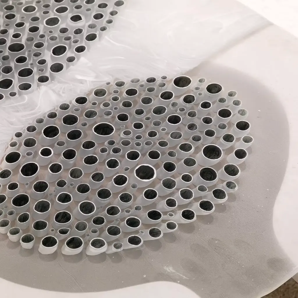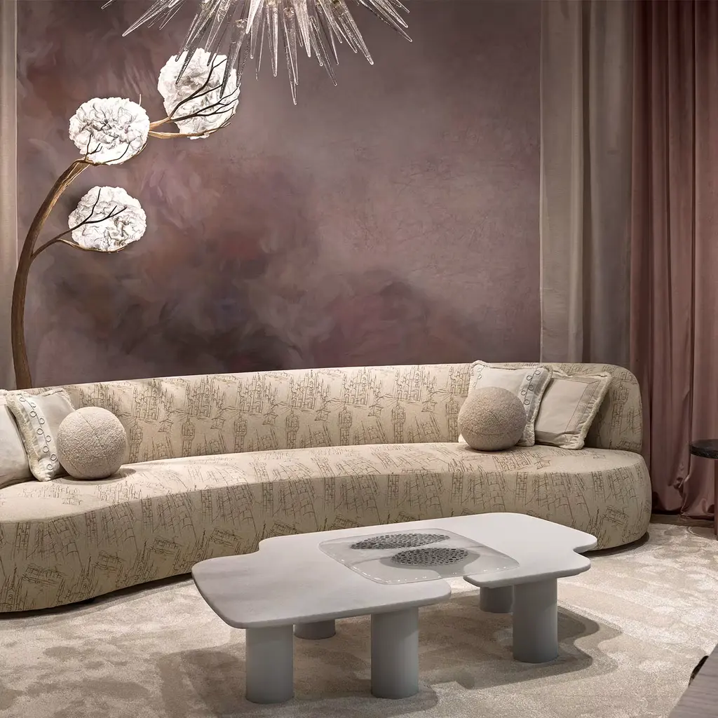 A sophisticated connection to nature distinguishes this superb coffee table. The distinctive irregular profiles seemingly trace a frame for the enthralling glass insert decorating the top. Bold white-lacquered cylindrical metal feet sustain the top, whose unpredictable and delicate traceries imply the uniqueness of every single piece.