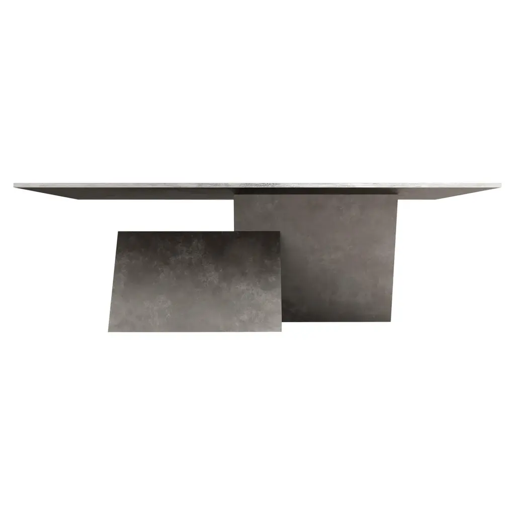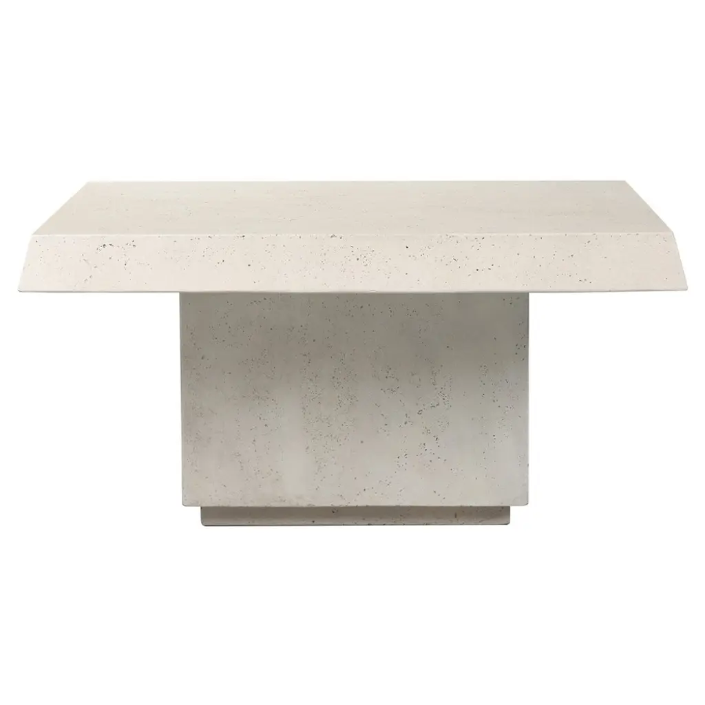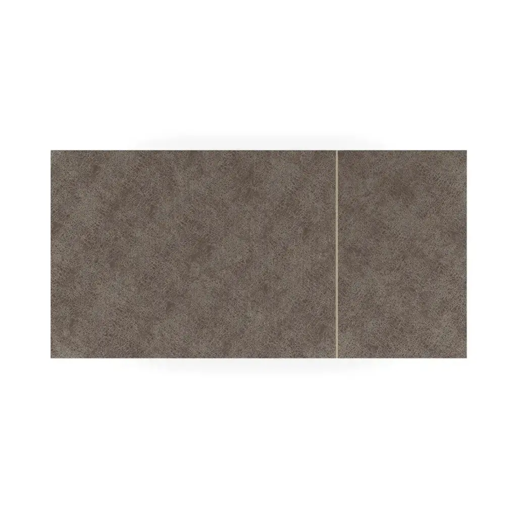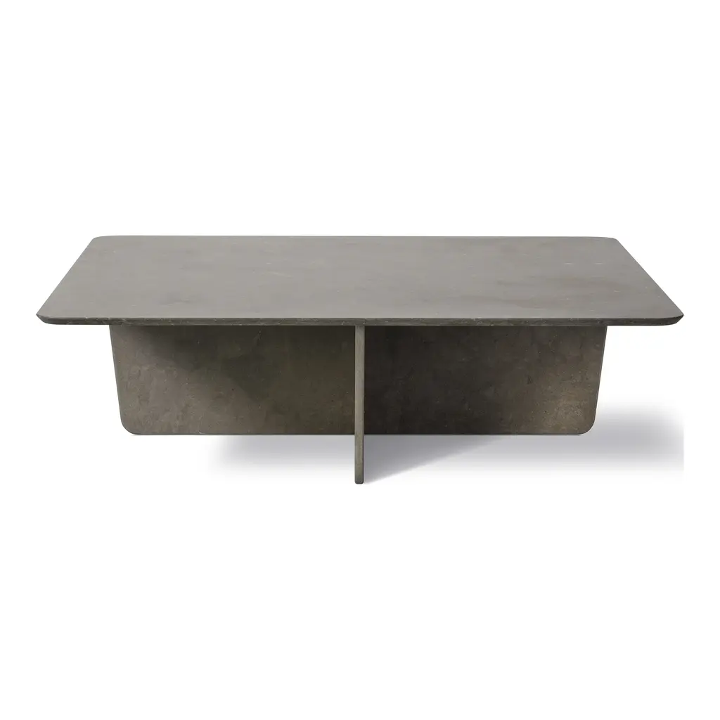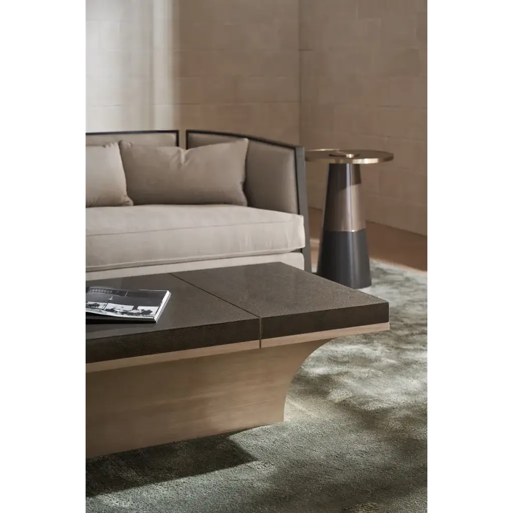 Like a pair of pants precisely tailored to fall just above the shoe, this cocktail table speaks to the delicate tension between texture and material. Features an ample top in a darkly contrasting Forest Craze finish, balanced on a swooping Koto wood base that appears to defy gravity. An asymmetrical beaded spline in Brush Gold lends separation and a luxe finishing touch.