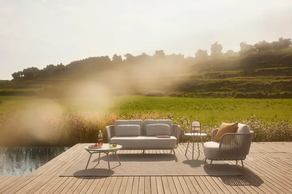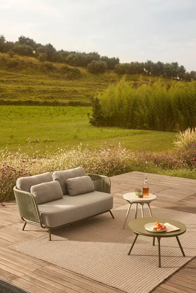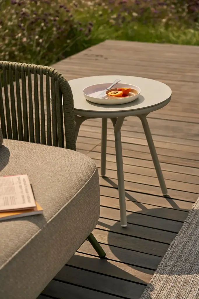 Fune is a four-legged coffee tables entirely in aluminum in round (small), round (large) and square with rounded corners.Colors:6000118 - Fune anthracite coffee table 50 cm6000119 - Fune grey coffee table 50 cm6000120 - Fune green coffee table 50 cmFrom the aluminum frame to the fabric backrest: the Fune collection plays with weaving to its fullest expression.Fune is developed for both dining and lounge areas, declined in two sizes with different sizes and designs, both of which can be combined with the series of coffee tables. The structure is made of painted aluminum tubes: solid and at the same time extremely light. The cushions are padded and drained to provide even more satisfying comfort.The shades evoke the warmth of the earth. The aluminum frame is paired tone-on-tone with fabrics and webbing.