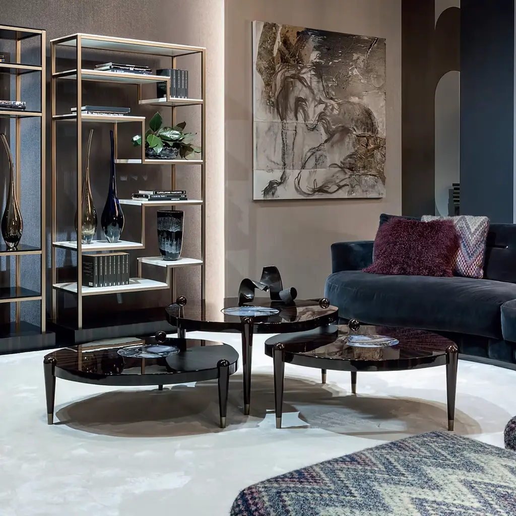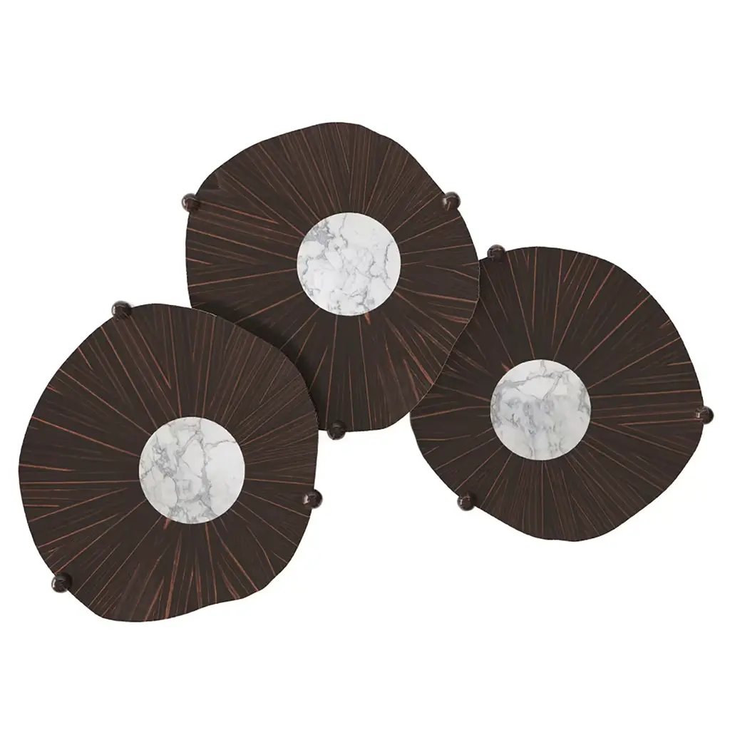 Organic but totally chic, this set of nesting coffee tables is crafted in rich ebony with round Calacatta marble inserts. A stunning centerpiece for formal living rooms, the tables provides ample display space for drinks and hors d'oeuvres prior to an elegant dinner. Bronze colored caps included.