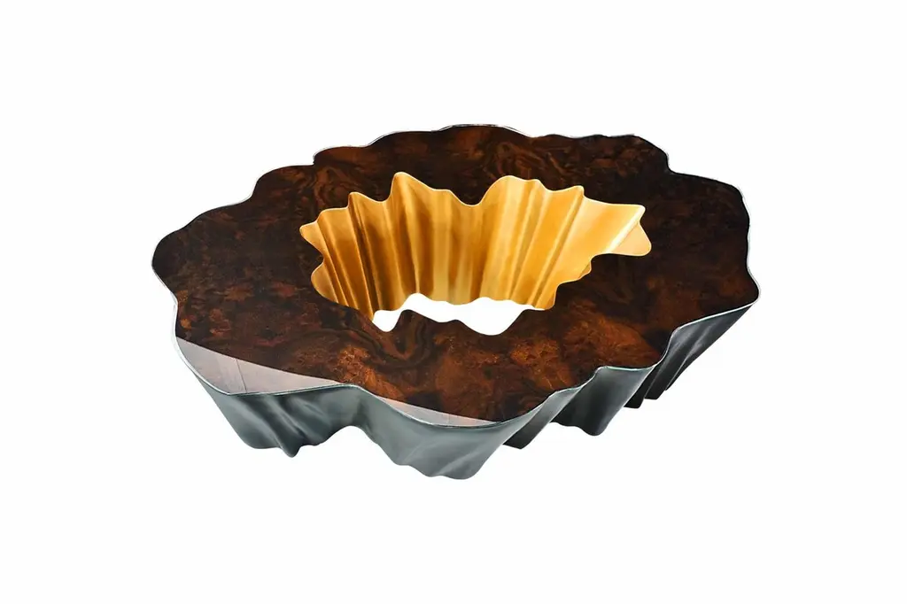 Gaia is a coffee table handmade produced in resin reinforced with fiberglass with a tree trunk inspired shape that combines bold finishes with exclusive textures. Its table top is in walnut root veneer with matte finish with a 6mm colorlessglass. Outdoor finish in bronze color with verdigris effect and interior finish in pale gold color. The wood veneer and its finishes are customizable.