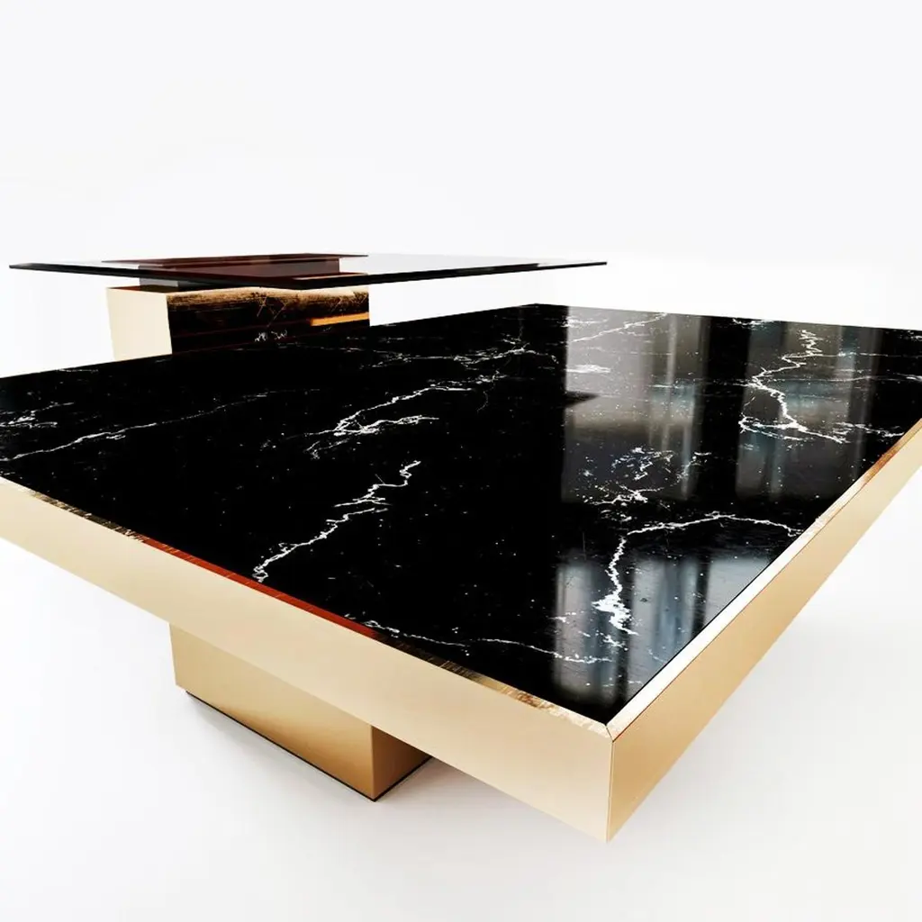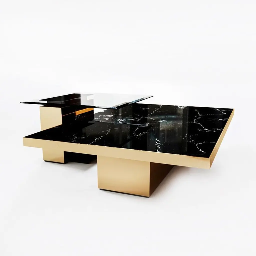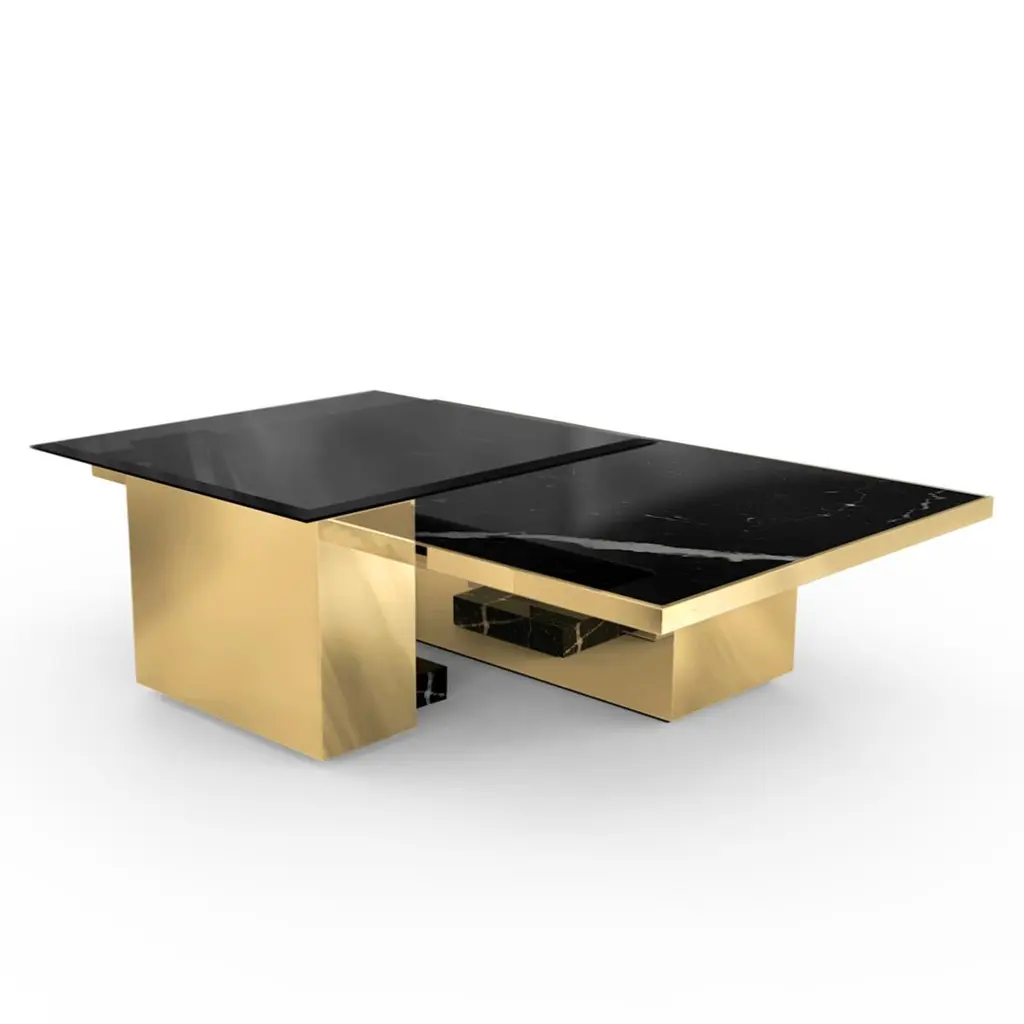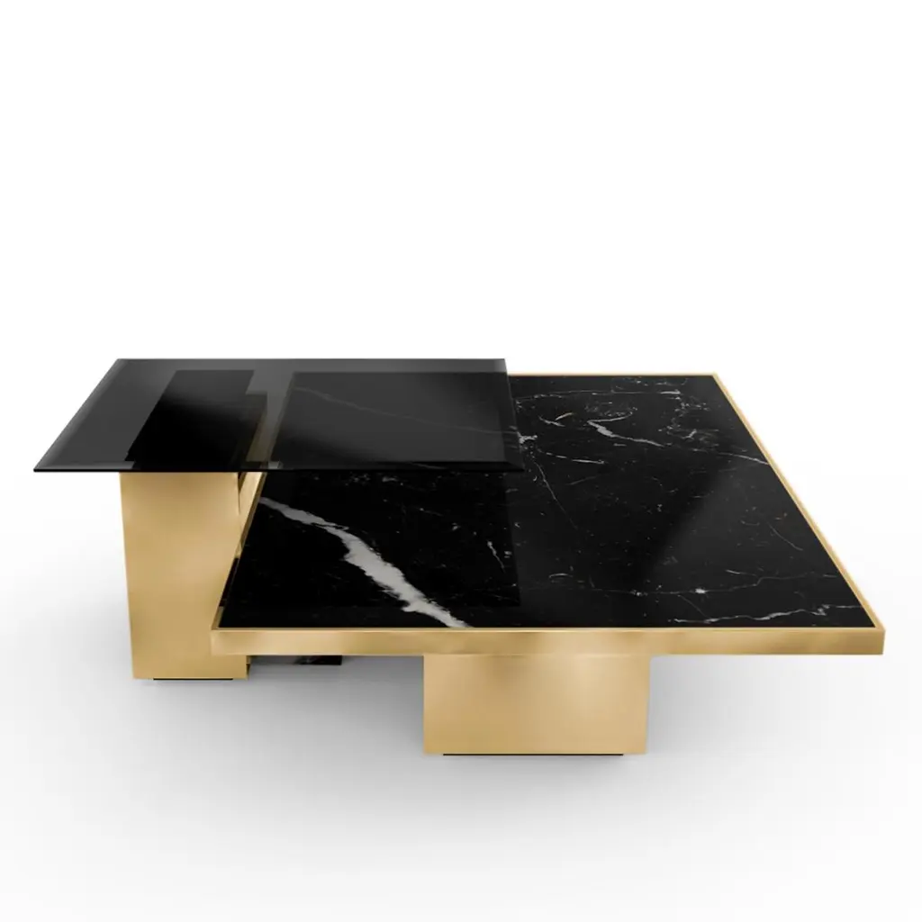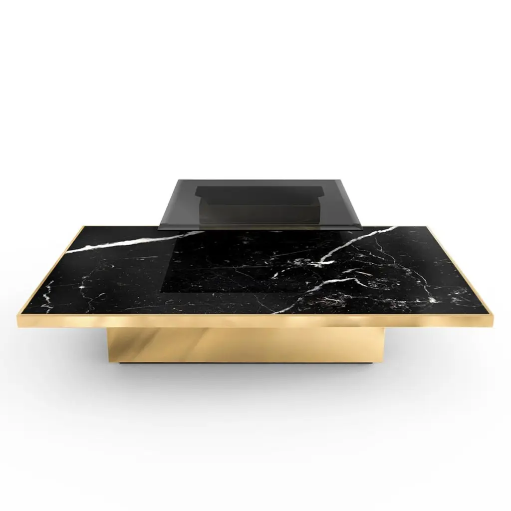Coffee table Gaius with wood structure and polished brass structure. With black marble top and with smoked glass top. On black lacquered wooden base.