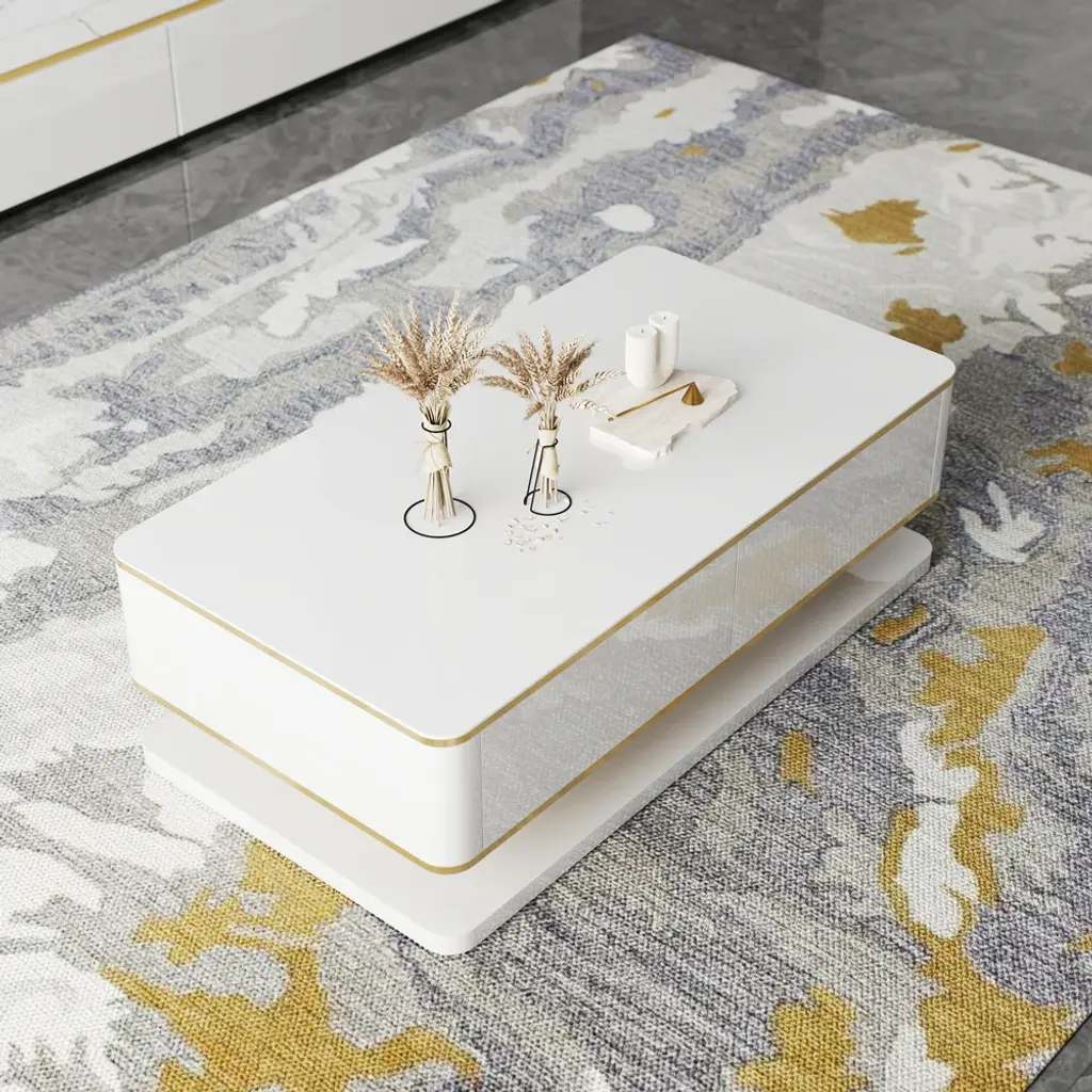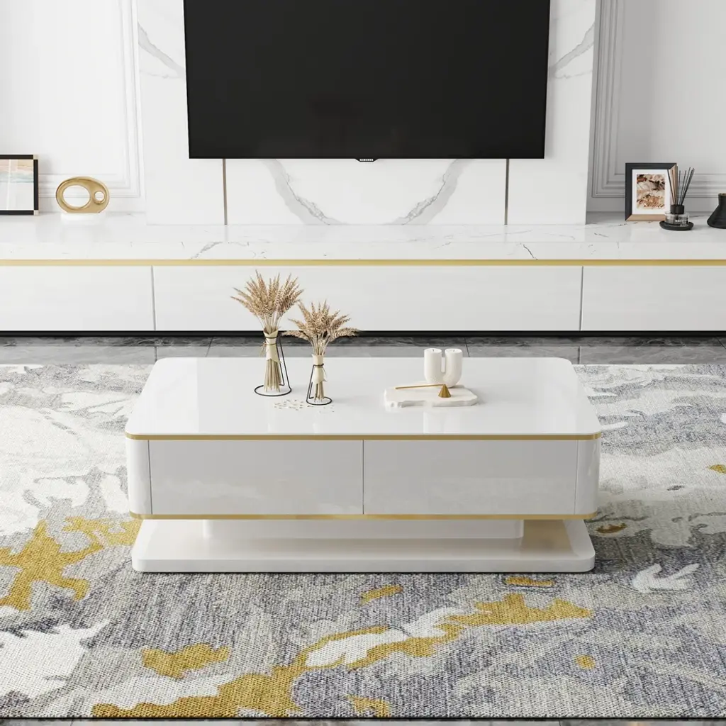 This 51" modern coffee table combines a sleek tempered glass top with 4 spacious drawers. The white/gold finish adds luxury, while the durable MDF and steel construction ensures longevity. Perfect for organizing media and displaying decor in contemporary living spaces.
