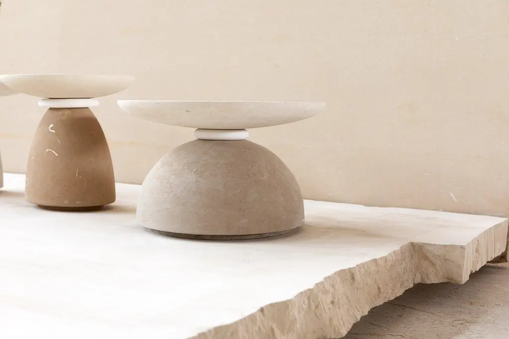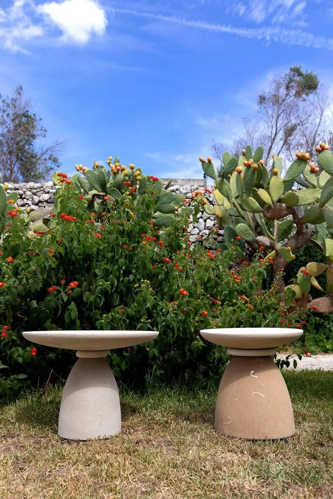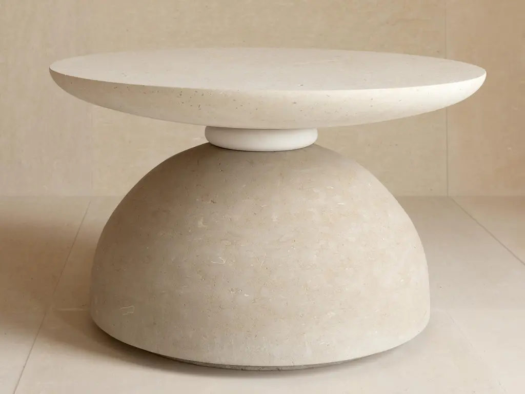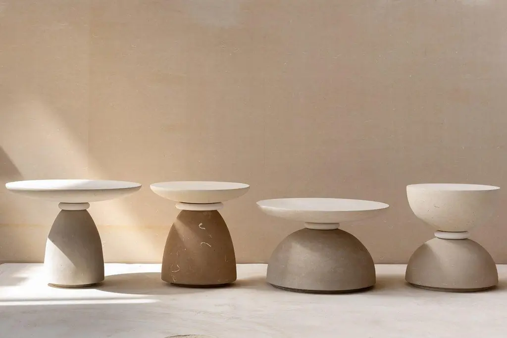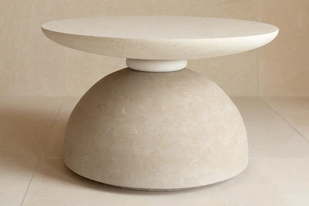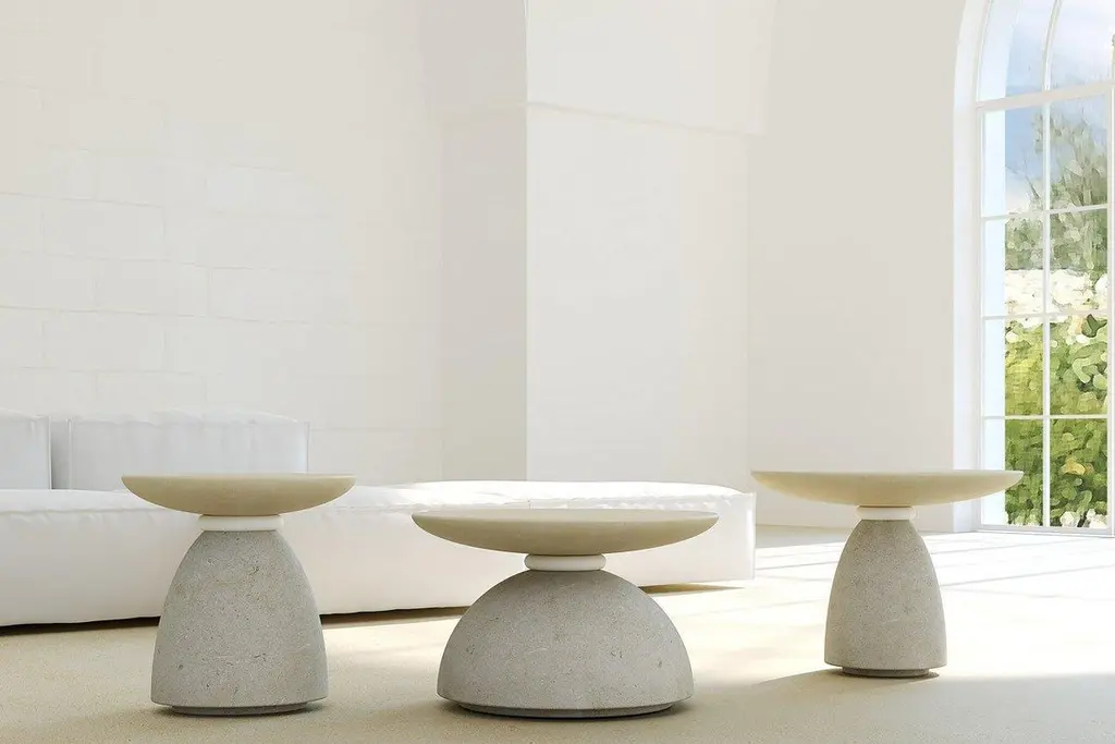 A pair of sculptural white and beige tables crafted of Lime stone.Suitable for both indoor and outdoor environments.?Short: ø 24" x 15" HTall: ø 24" x 18" H.Please contact us if you have any questions about customization and pricing. We will be glad to check with the factory’s technical team if sizes, finishes, and colors can be customized. We do our best to expedite production and to ship and deliver product within the listed lead time, however current lead times might be longer due to global shipping backlog and delays. These delays are out of our control and cannot be a reason to cancel an order.