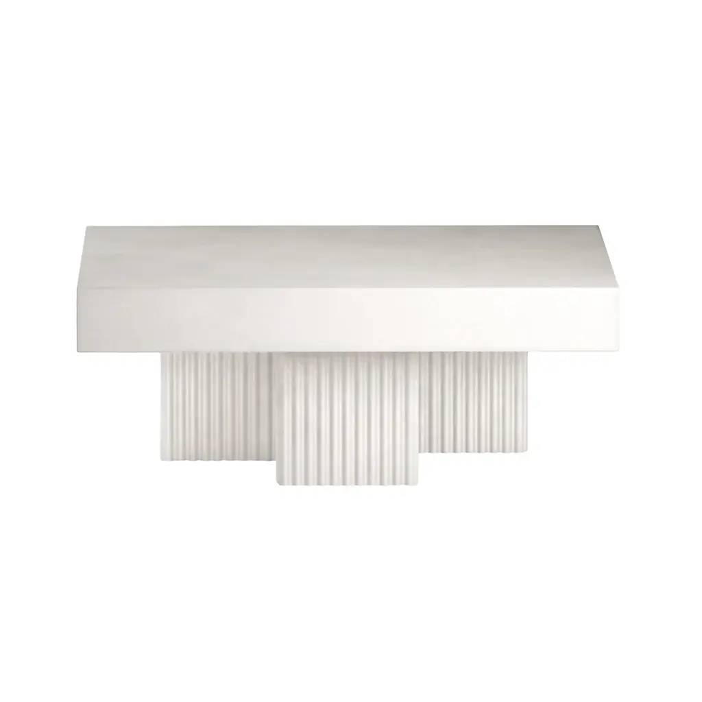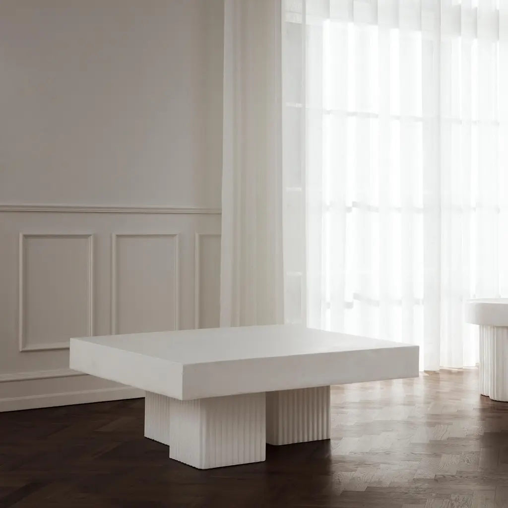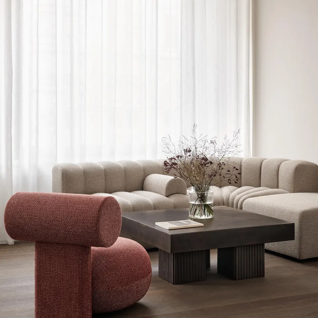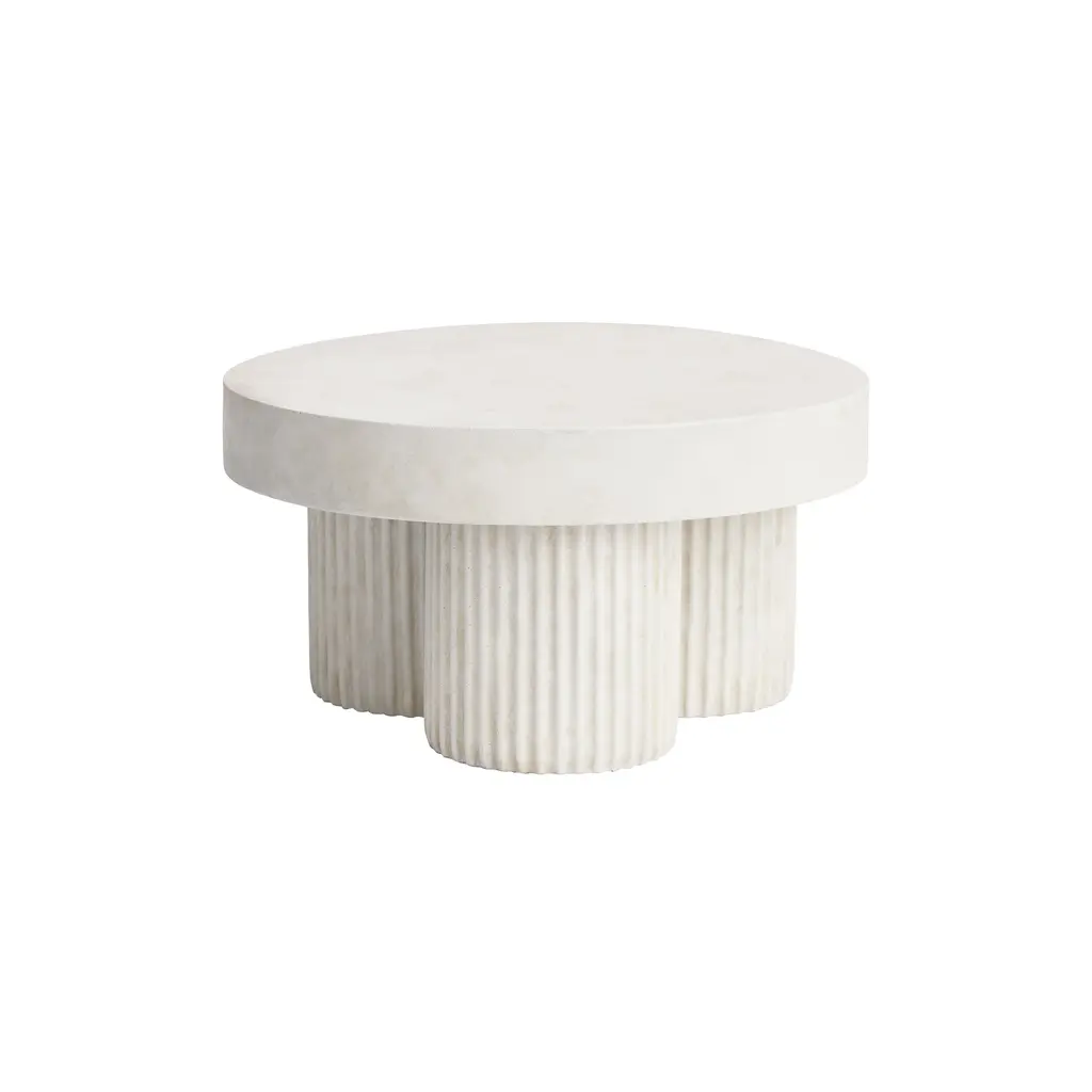 The Gear Coffee Table is a sculptural piece inspired by mid-century Brutalist architecture. Designed by Kristian Sofus Hansen and Tommy Hyldahl, it features a circular top supported by three cylindrical, fluted legs. Made from fiber-reinforced concrete, the table has a tactile, stone-like texture, giving it a rugged yet refined look. Each table is hand-painted and unique, available in earthy tones like Chalk and Earth.
