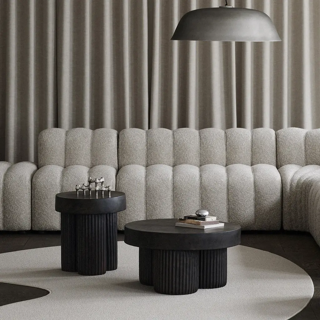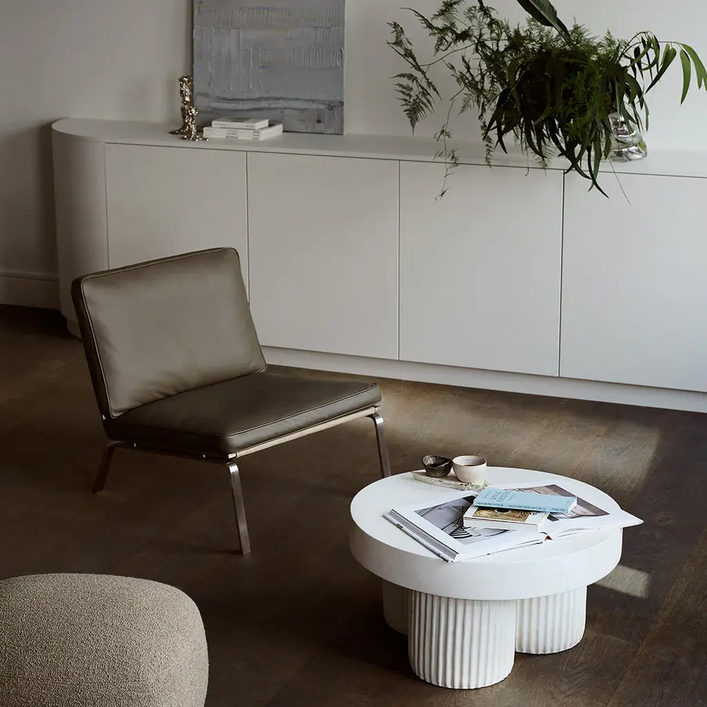 Please note: the table top and base are not attached Gear is a collection of sculptural coffee tables, inspired by Ancient Greek columns. Gear is designed as a simplified block-like structure with three riffled legs, adding a refined detail to the voluminous design. The table is hand painted, adding a unique surface texture to each table.