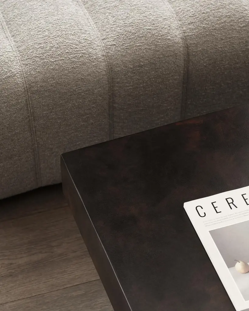 Gear Square Coffee Tableby Kristian Sofus Hansen & Tommy HyldahlGear Square was introduced to the Gear series to fulfill the need for a square coffee table for sofa arrangements, featuring a larger surface.The Gear Square table come with a square tabletop, resting on top of three cylinder shaped legs. The three legs are positioned differently, making the table appear interesting from all angles and allowing for captivating shadow plays when lights pass through them.Gear is a collection of sculptural coffee tables, inspired by Ancient Greek columns. Gear is designed as a simplified block-like structure with three riffled legs, adding a refined detail to the voluminous design.Gear comes in two sizes and is made of cast fiber concrete. The table is hand painted, adding a unique surface texture to each table.Finish: Earth or Chalk.The table is made from a blend of concrete and magnesium oxide. Pads for table legs included.