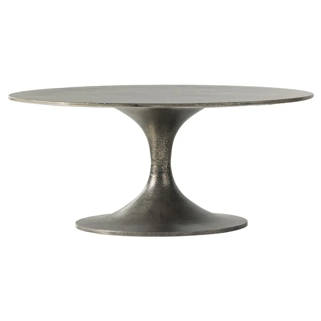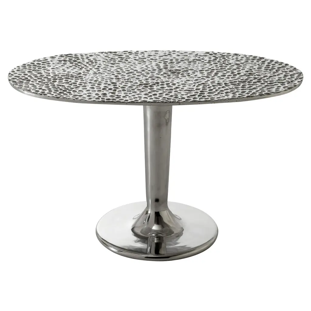 Contrasts of light and reflections characterise the Next 147/148 coffee table family. Made entirely of polished cast aluminium, in different sizes and heights, they are characterised by a single central base that joins an oval top embellished and decorated with a hammered effect. The gloss of the surface allows the light to create different effects every time.Coffee table in cast polished aluminium. Hammered top.Additional Information:Material: Aluminum Frame finish: Cast polished aluminiumTop finish: Hammered topDimension: 110 W x 45 D x 33 H cmQuick ship: Next 147 / 148. Available with shipping the week after the order receipt, upon confirmation of availability.