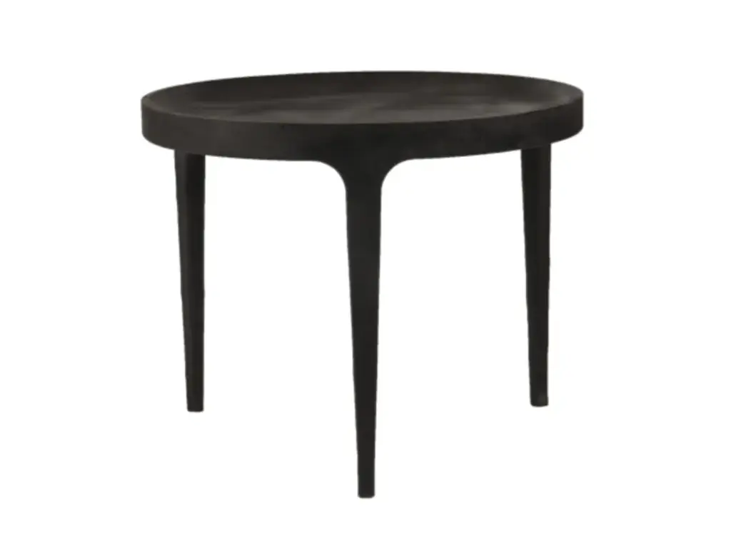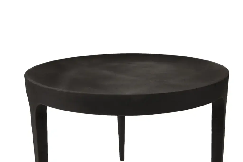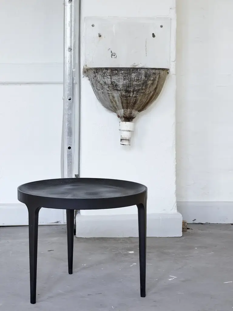 Ghost Coffee Table is a solid table in cast iron. The elegant table is casted with three pointed legs and a table top with a groove in the outline. The table is taken directly from the mould without polishing, which gives it a unique rough surface with texture of the mould. The raw table is powder coated and hand painted afterwards, which gives it a beautiful and diverse surface, with alternation between a matte and a reflective finish.MATERIAL: Aluminium. Powdercoated and afterwards handpainted