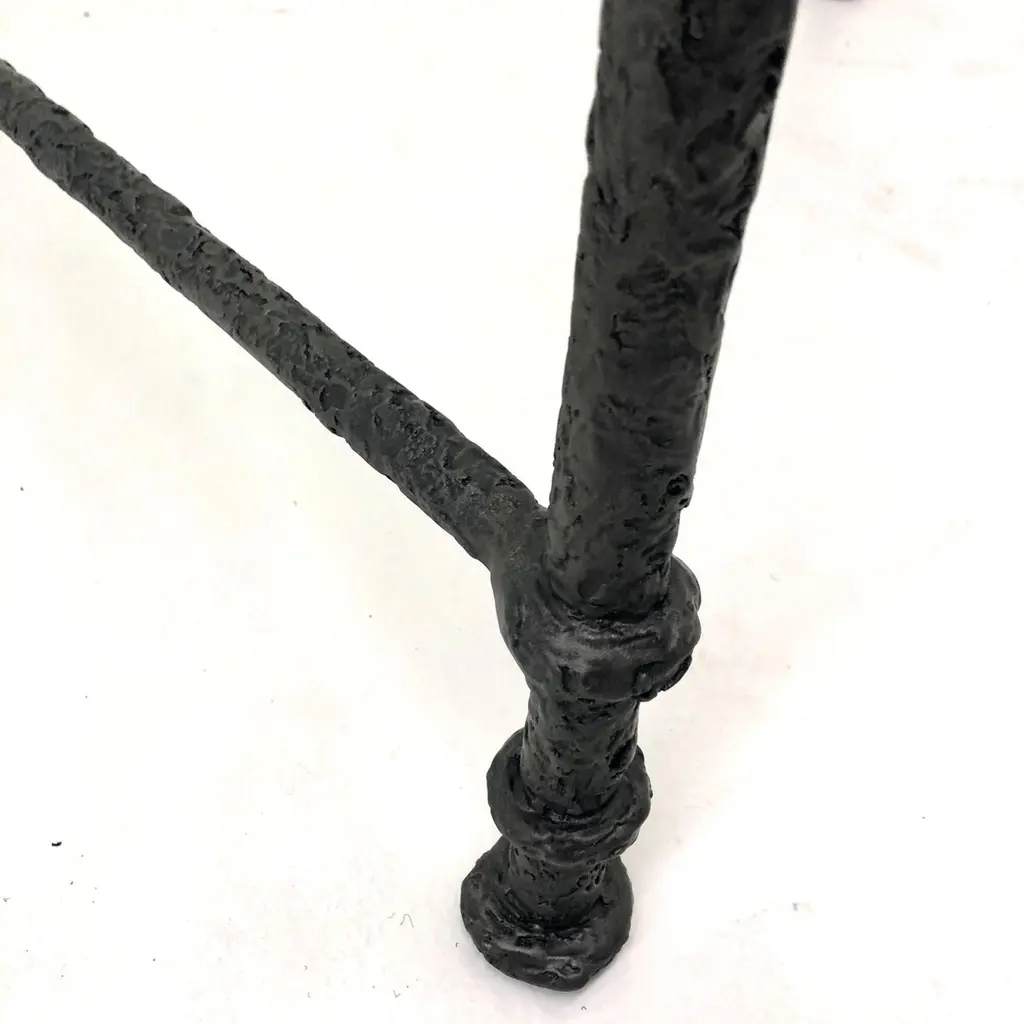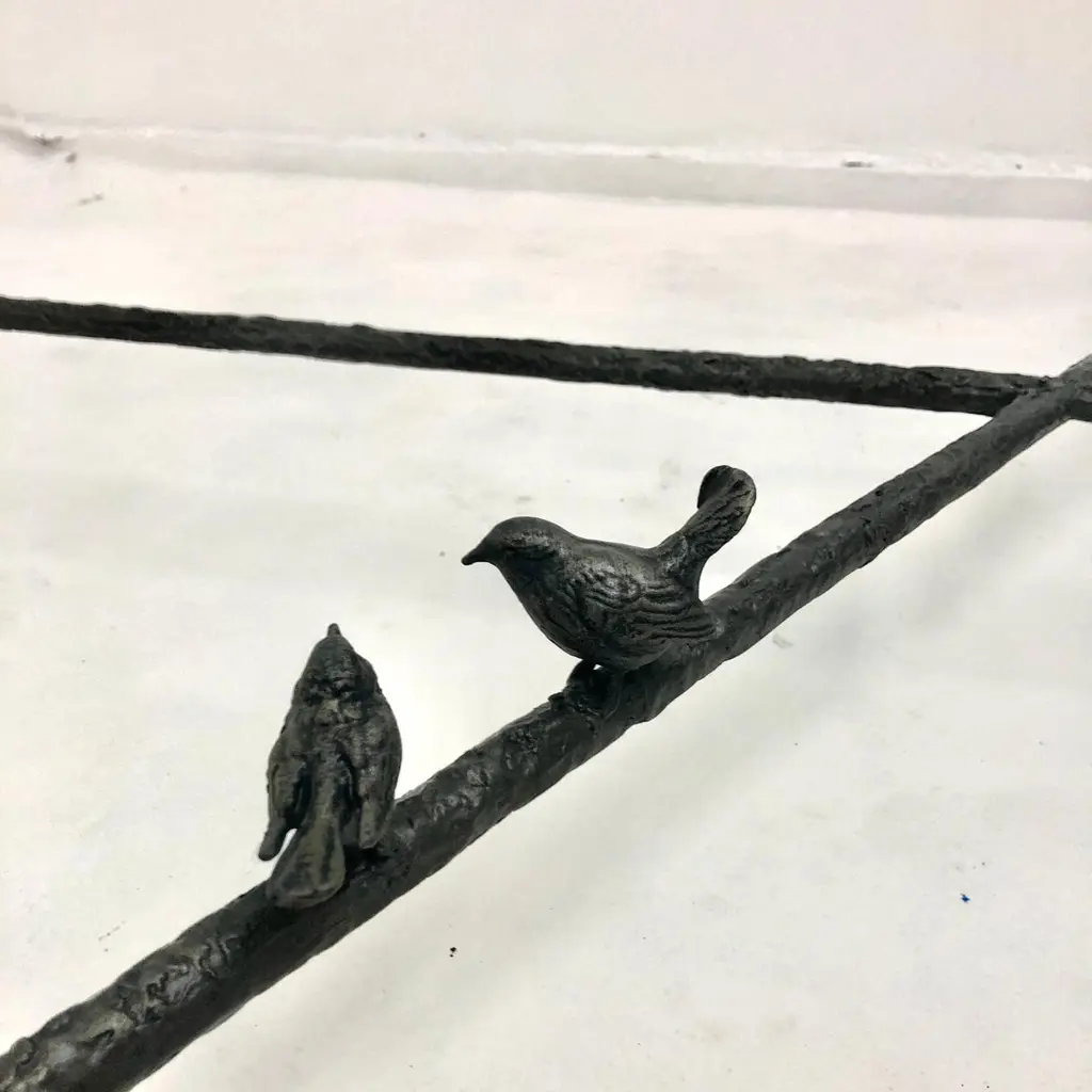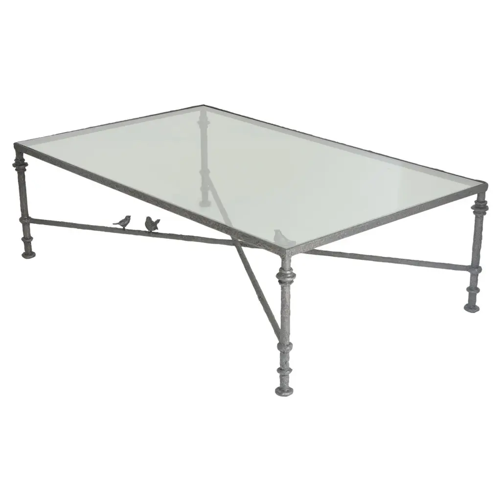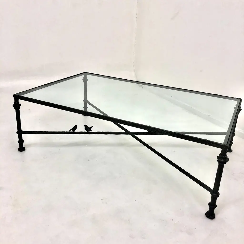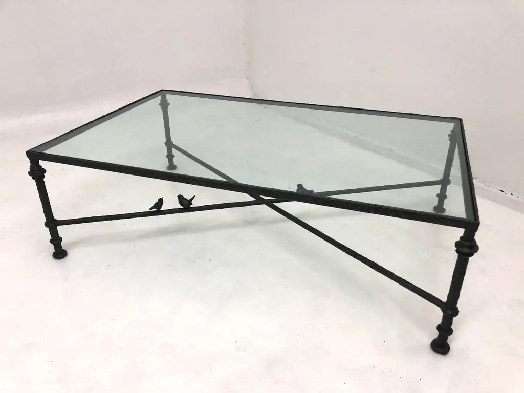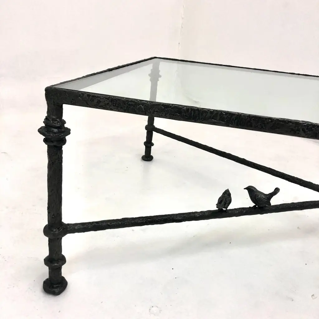 Custom fabricated iron table base with a "Giacometti" inspired applied texture with 3 cast birds on stretcher per individual dimensions including 1/2" thick inset glass top.Pictured Dimensions: 58"L x 36"W x 18"H Painted Finish: Blackened Steel.Ref.71575