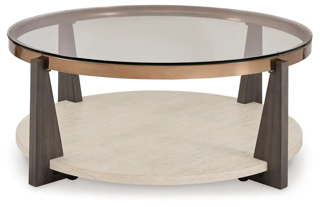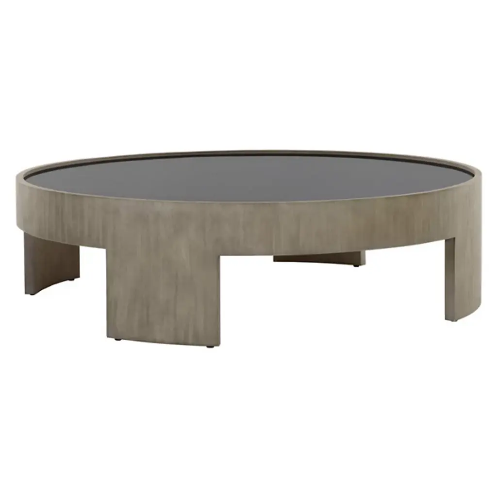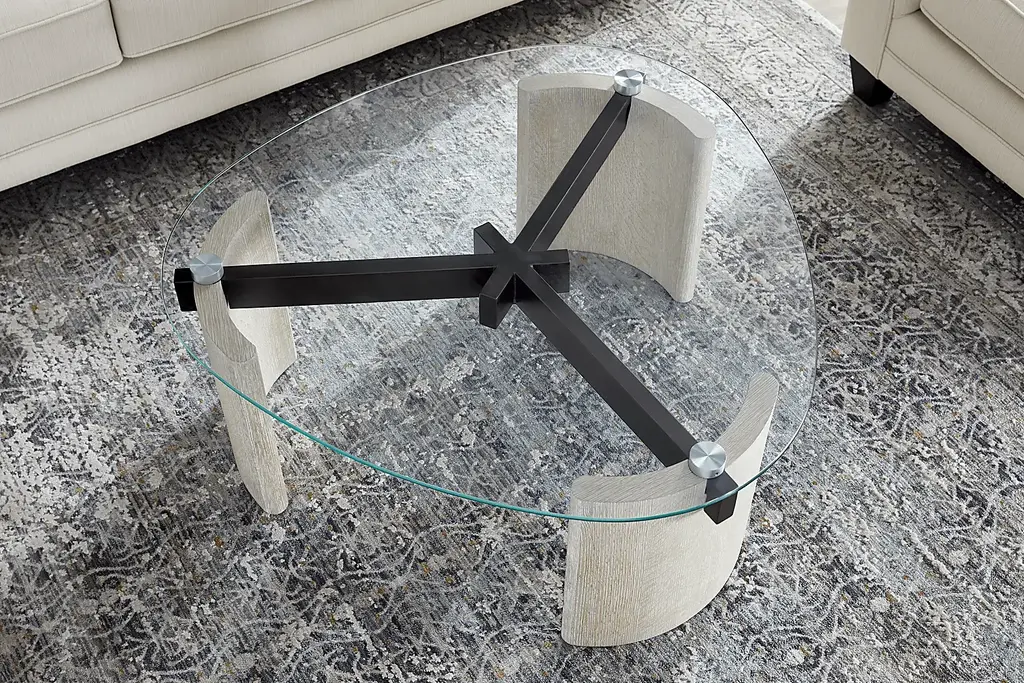An alluring centerpiece for any seating arrangement, the Giannis cocktail table showcases a smooth glass top that brings lightness and clarity to the design. Its sculptural base features bold, angled legs with eye-catching proportions, grounding the airy glass top in a crisp, contemporary silhouette that commands attention from every angle.