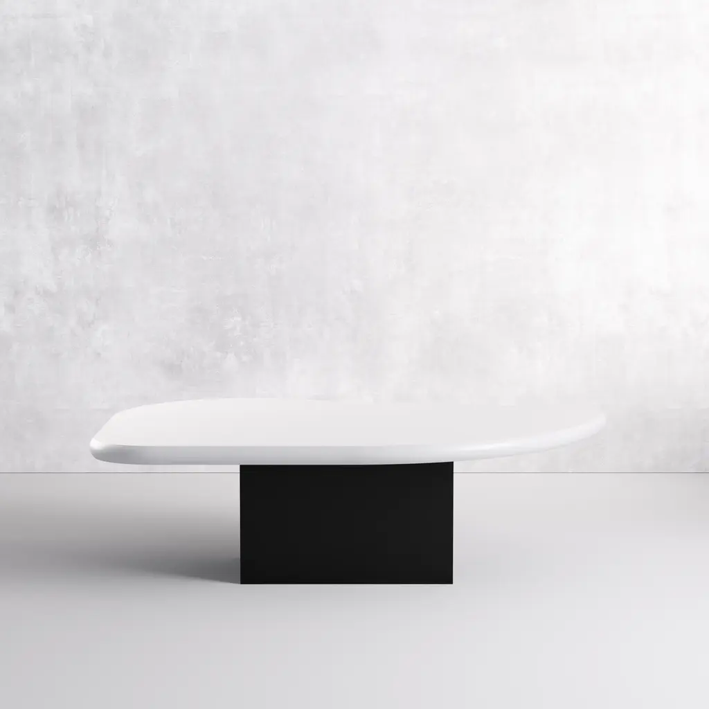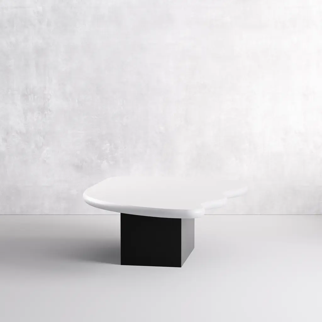 The lacquer surface of our Giethoorn coffee table sits on a metal base. The playful shape of this modern table is both eclectic and elegant. A neutral color palette ensures that our Giethoorn coffee table will blend with your modern interior. Add a lively touch to your commercial or residential living space. Make a bold choice with this sophisticated, wholly unique piece. Dimensions: 53.5''W x 37.0''D x 16.0''H Tear Sheet