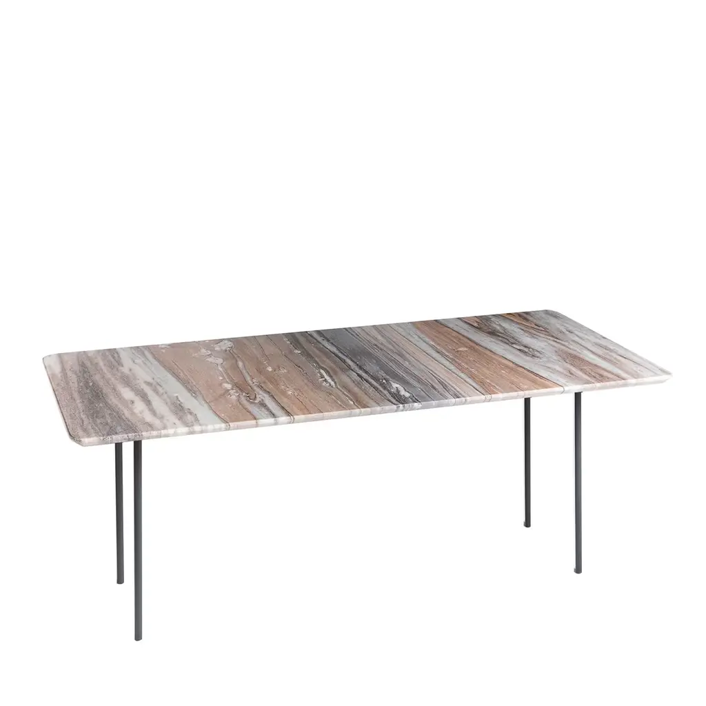 This magnificent coffee table is the perfect example of the mesmerizing and unique features of nature, embodied in the singular shades defining its Palissandro marble top. Rectangular with rounded corners and edges, the large top solidly rests on a gray.lacquered iron base composed of four tubular legs, also available in gold or black. The marble type is customizable.