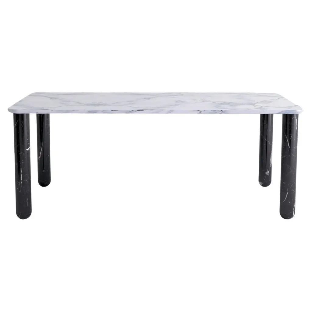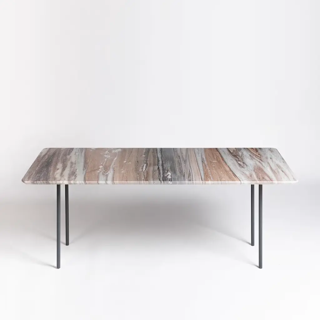 This magnificent coffee table is the perfect example of the mesmerizing and unique features of nature, embodied in the singular shades defining its Palissandro marble top. Rectangular with rounded corners and edges, the large top solidly rests on a gray.lacquered iron base composed of four tubular legs, also available in gold or black. The marble type is customizable, please ask the Concierge for options.