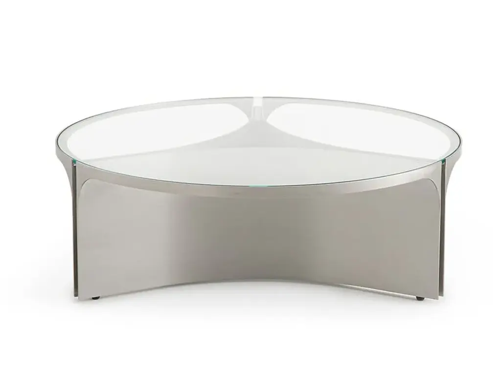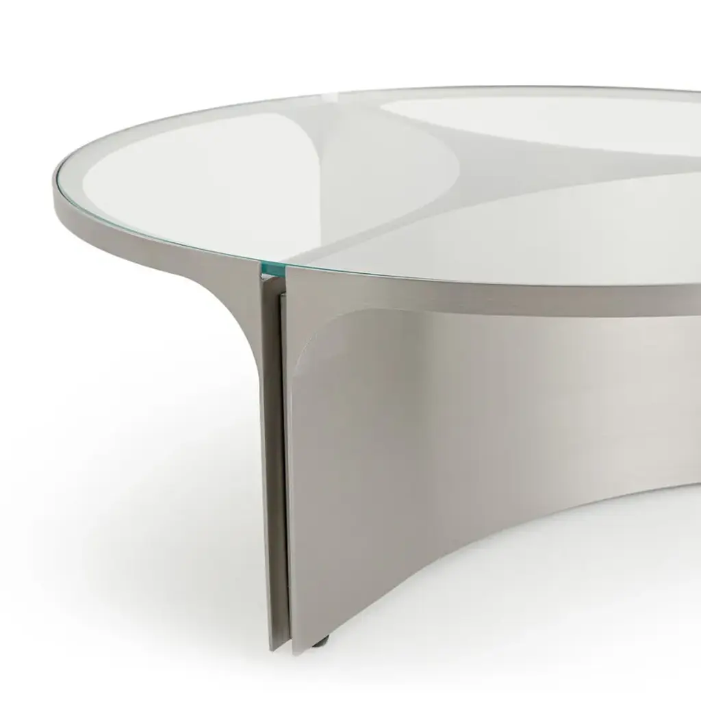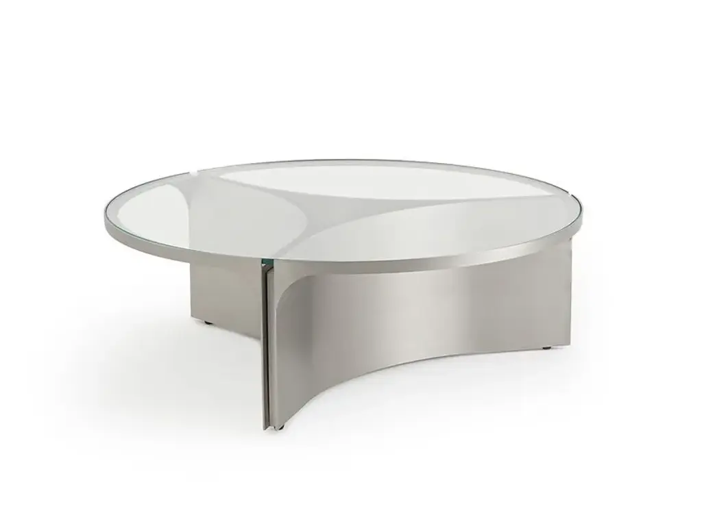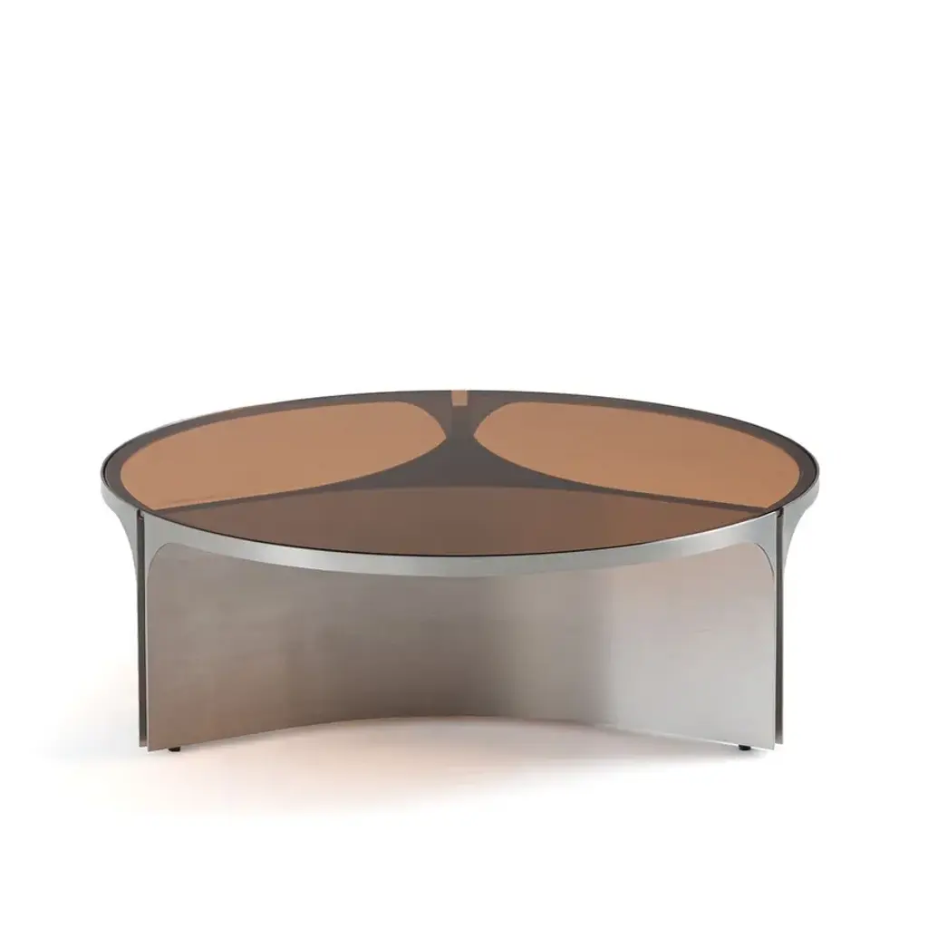 Design and sculpture characterise the Gira low table. The transparent top reveals the curved lines of the satin nickel base. This base made of thin curved steel plates is a true work of balance. A design by AMPM. Can also be used as stackable coffee tables with the large model from the same collection.8 mm thick tempered glass top, available transparent or amber-colouredCurved stainless steel frame with satin nickel finish