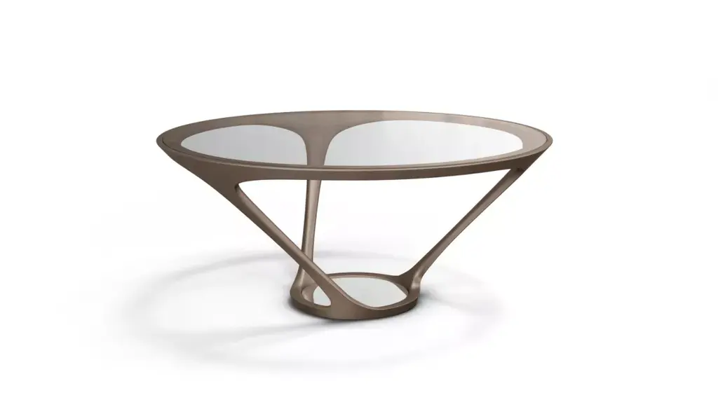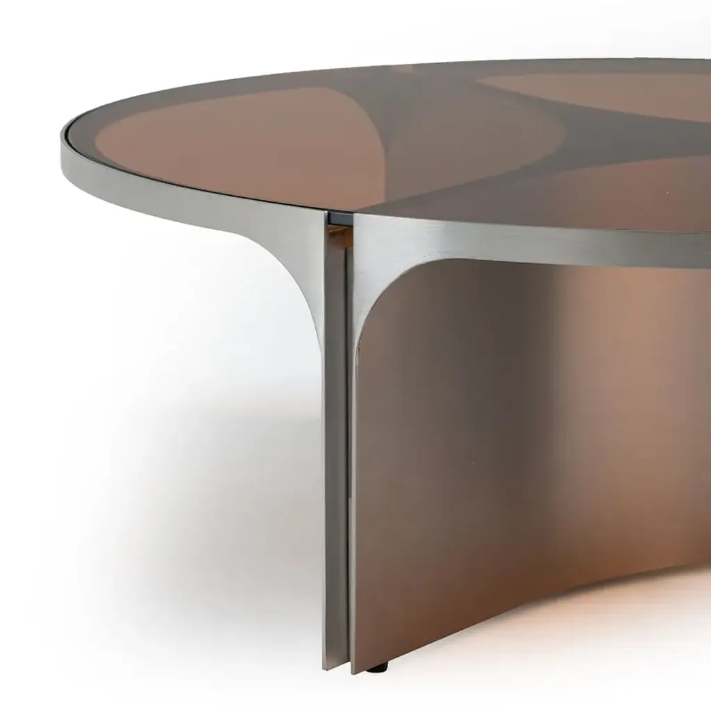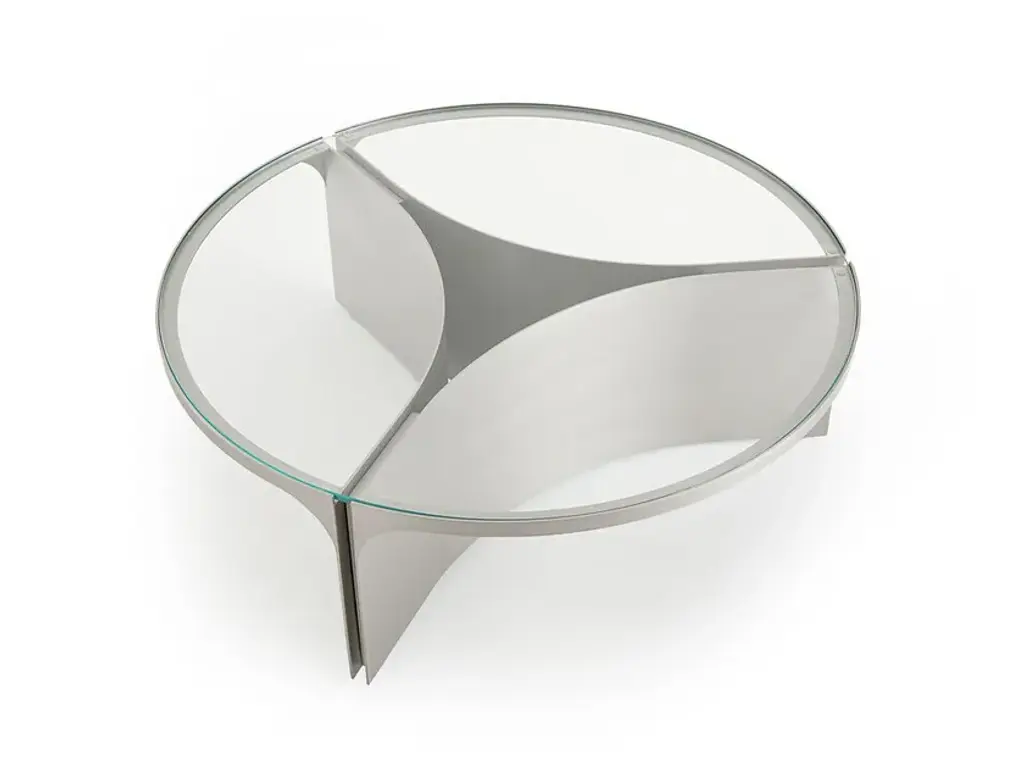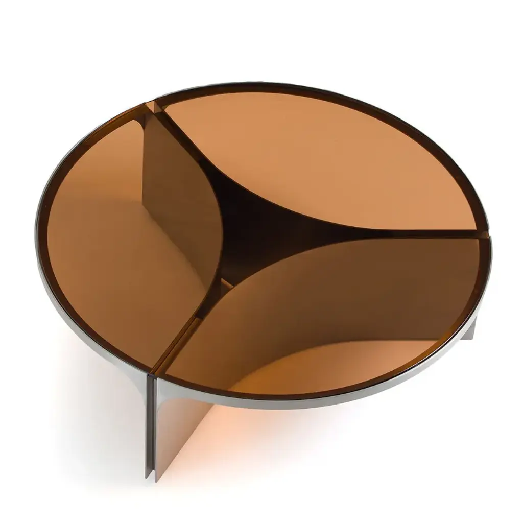 Design and sculpture characterise the Gira low table. The transparent top reveals the curved lines of the satin nickel base. This base made of thin curved steel plates is a true work of balance. A design by AMPM. Can also be used as stackable coffee tables with the large model from the same collection.8 mm thick tempered glass top, available transparent or amber-colouredCurved stainless steel frame with satin nickel finish