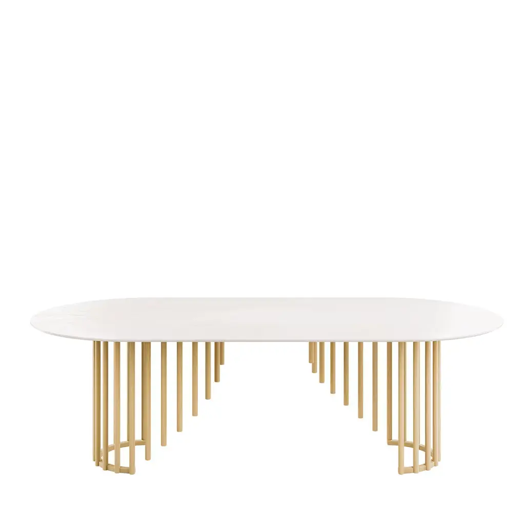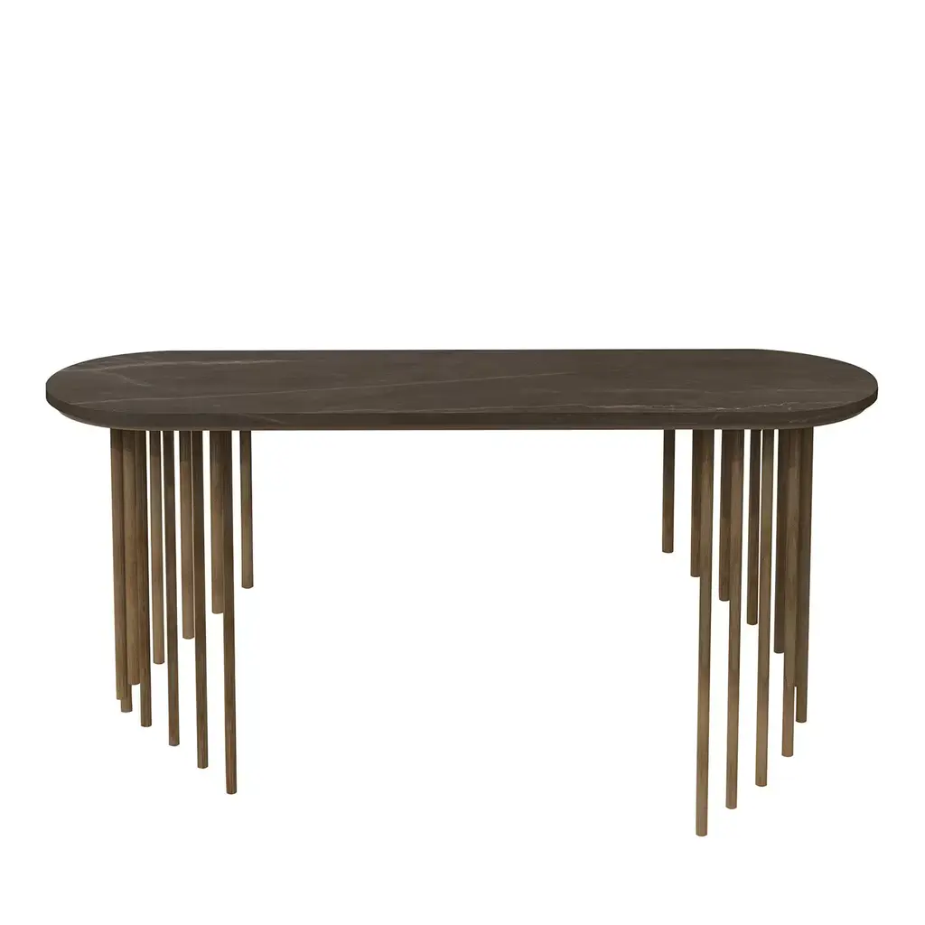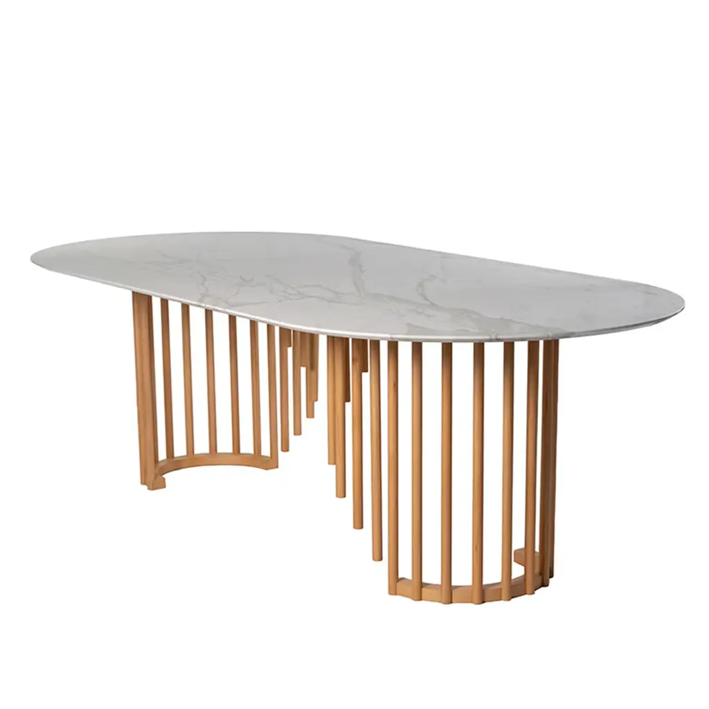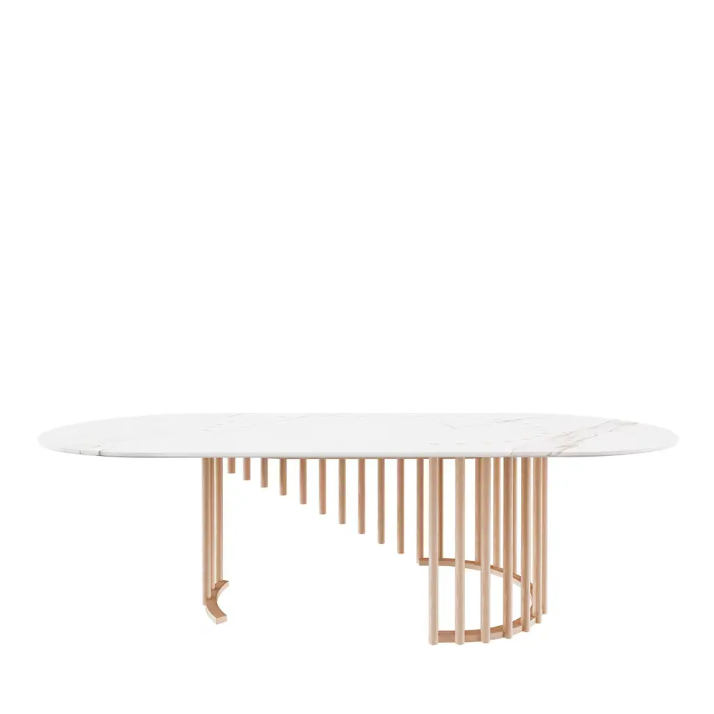 Exuding a sculptural flair, this coffee table draws inspiration from the simple and elegant silhouette of canes ("giunchi" in Italian). The ellipsoidal top in white marble is efficiently sustained by a neat ensemble of parallel shafts in cedar wood that trace a smooth structural profile. Please check with the Concierge the availability of the variants with a Calacatta or Bronze Armani marble top, inlaid top, and Canaletto walnut structure.