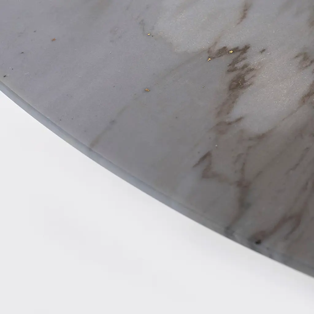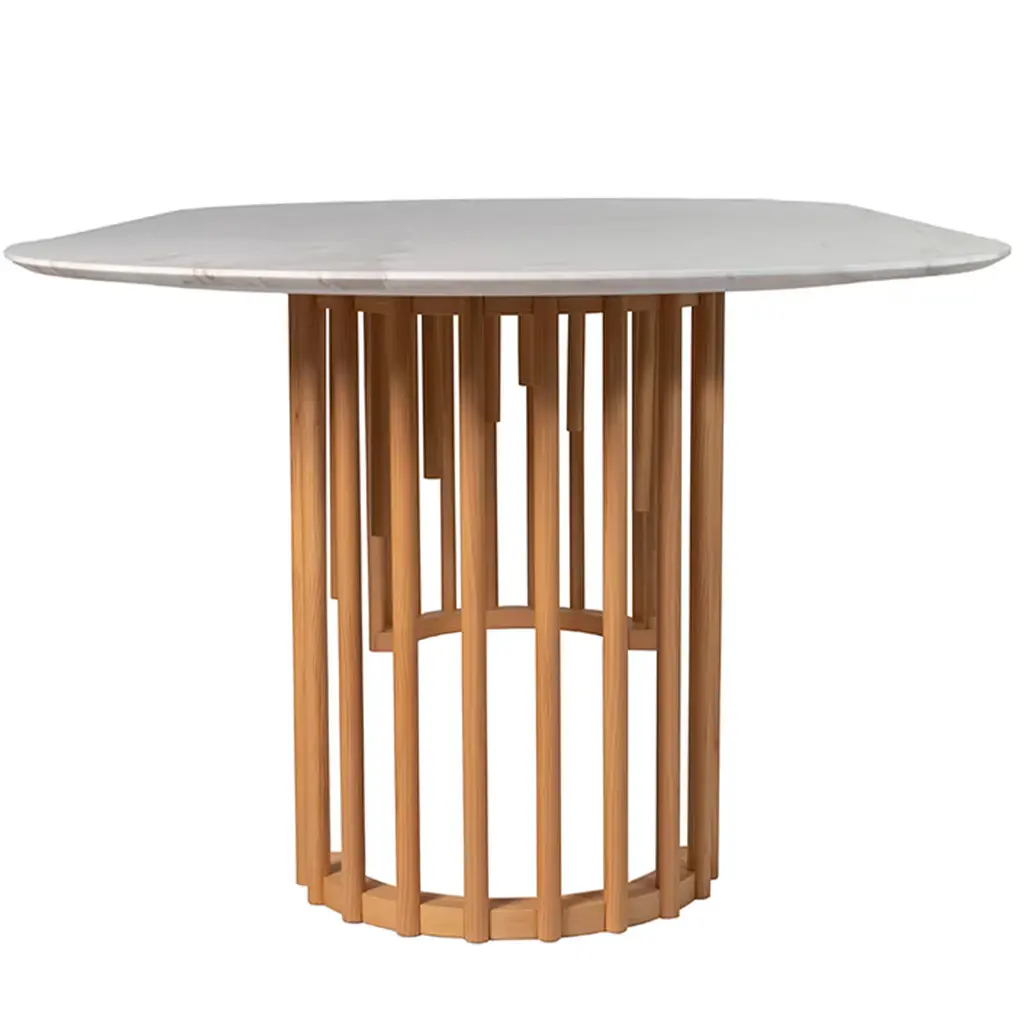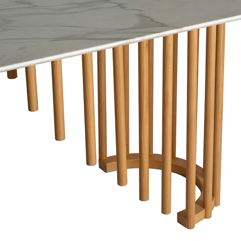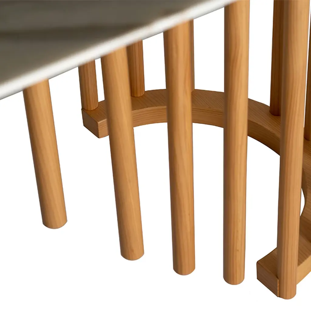 Exuding a sculptural flair, this coffee table draws inspiration from the simple and elegant silhouette of canes ("giunchi" in Italian). The ellipsoidal top in white marble is efficiently sustained by a neat ensemble of parallel shafts in cedar wood that trace a smooth structural profile. Please check with the Concierge the availability of the variants with a Calacatta or Bronze Armani marble top, inlaid top, and Canaletto walnut structure.