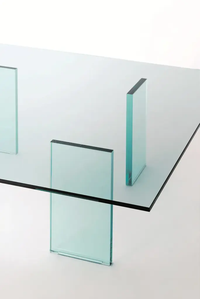 Low table characterised by the very refined minimal aspect with feet in mm 24 thick transparent glass thermo-welded to the top in mm 12 transparent tempered glass.Historical and iconic product of the international design, designed in 1976 by the great master Shiro Kuramata.