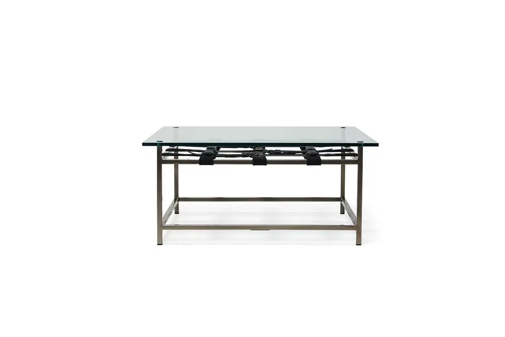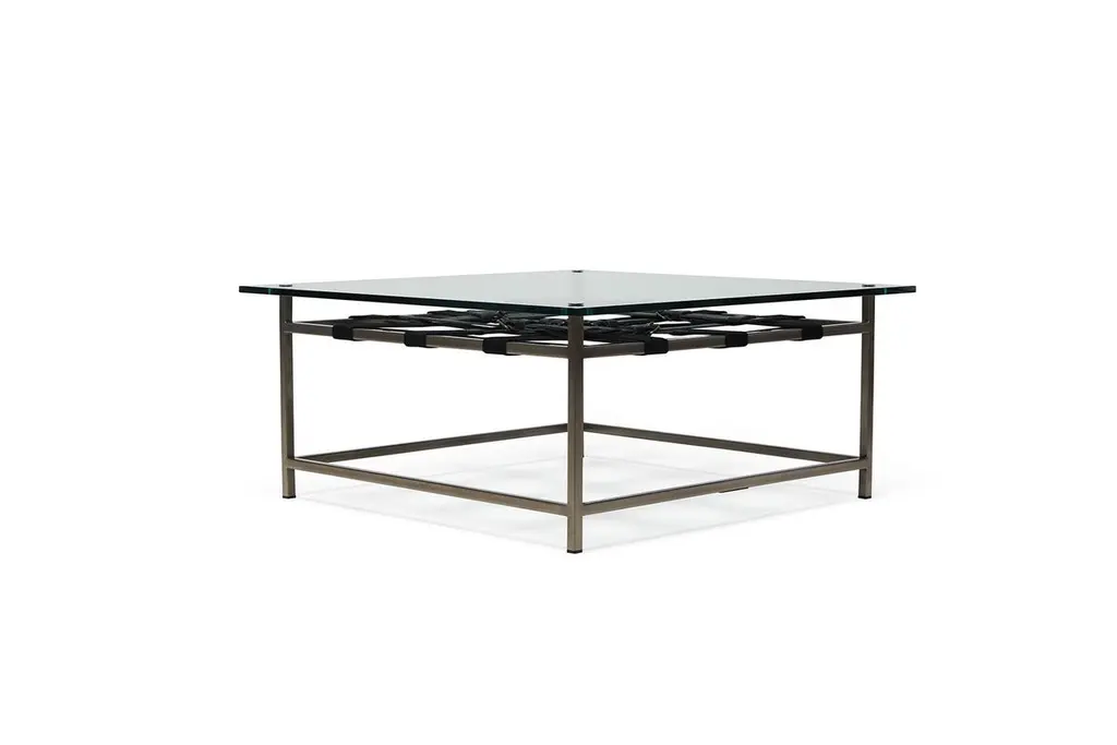 This glass-topped coffee table utilizes the signature belts from the Stephen Kenn Inheritance Collection stretched across an antique nickel-plated steel frame. Every Stephen Kenn piece is made to order through our Los Angeles studio. We create these pieces utilizing a number of small businesses and fabricators in the LA area. We welcome inquiries about custom dimensions or custom material combinations to best fit your space and personal aesthetic.
