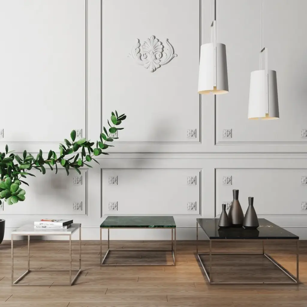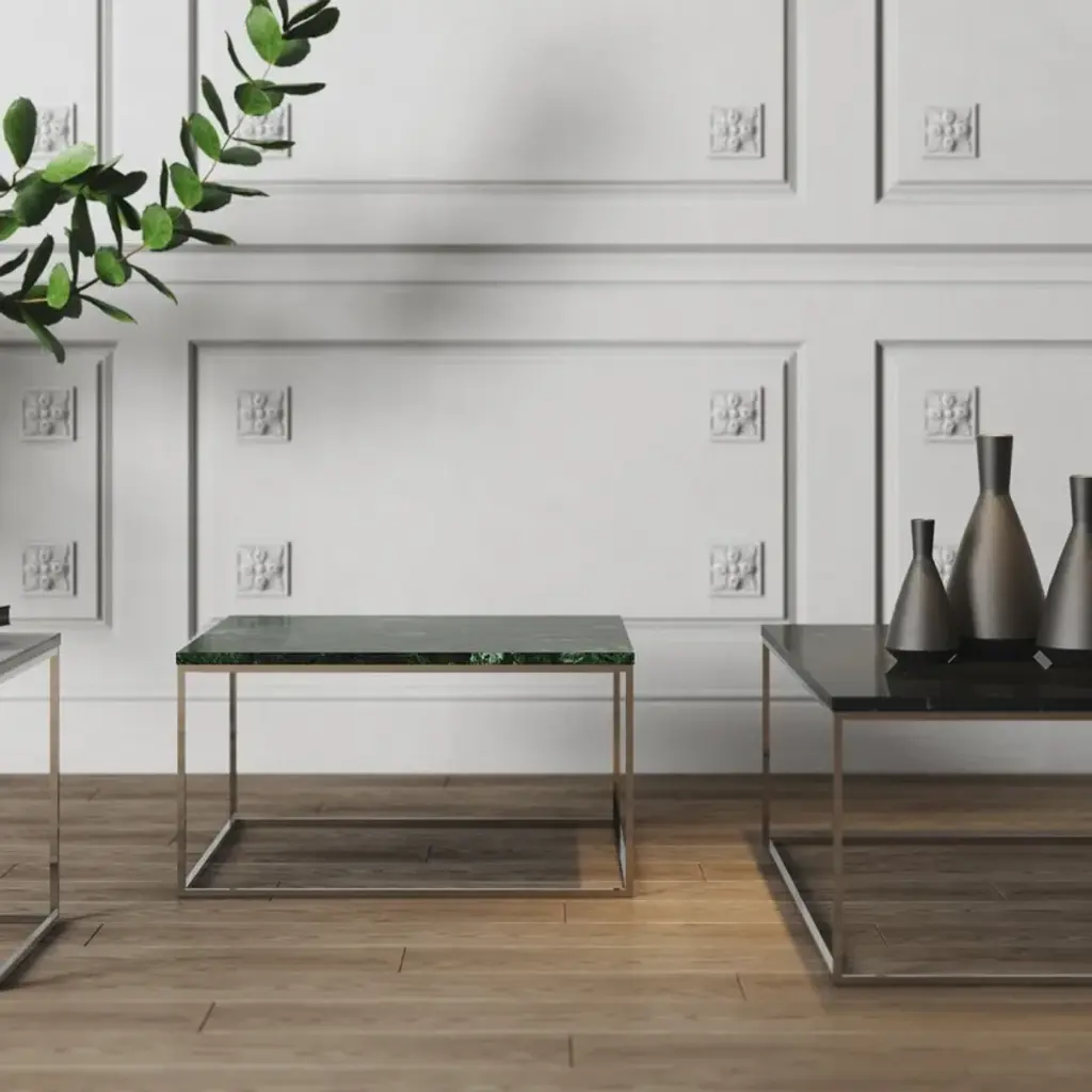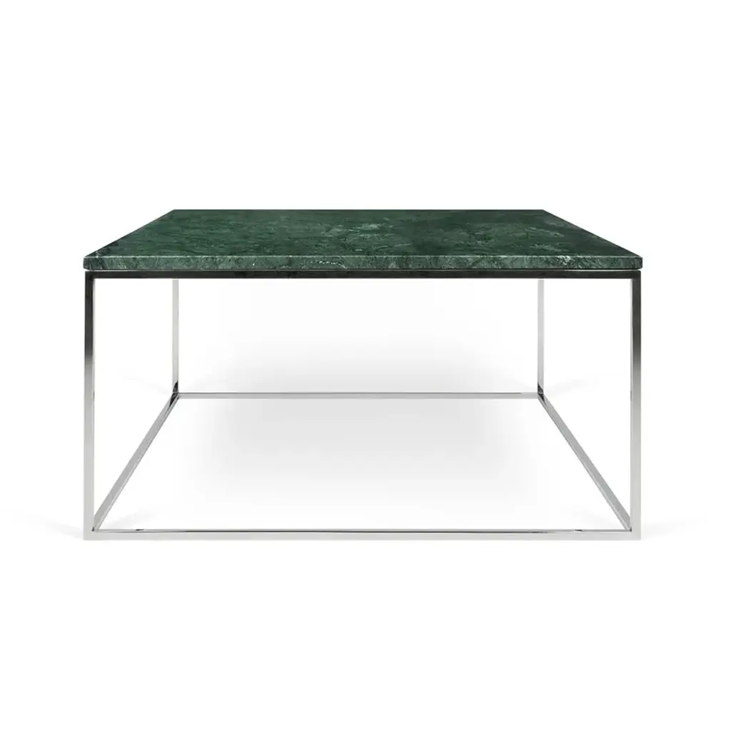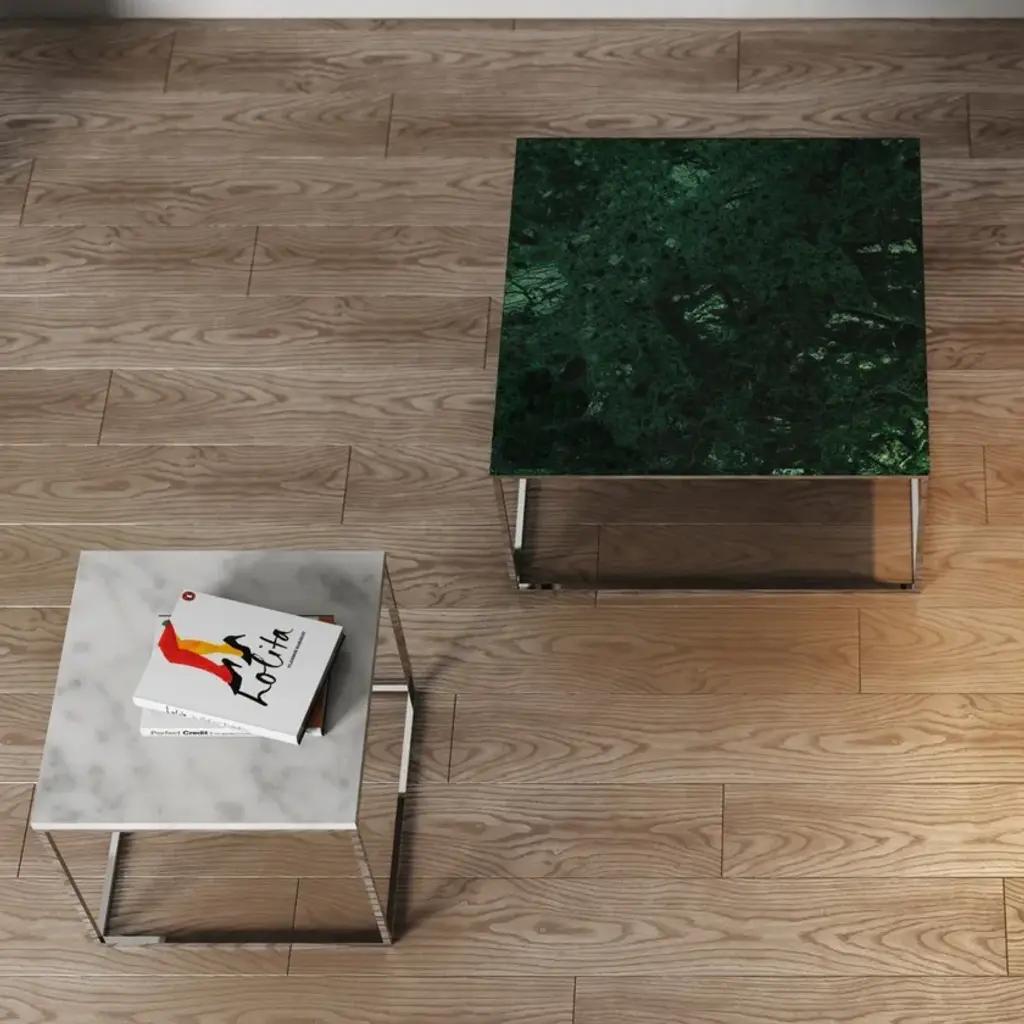 The Gleam system of accent tables is a modular system consisting of wood or marble tops available in a variety of different finishes and colors. Paired with elegant metal legs that are either lacquered black or chromed, there are dozens of different combinations available. Available in a square or rectangular coffee table and in a side table.