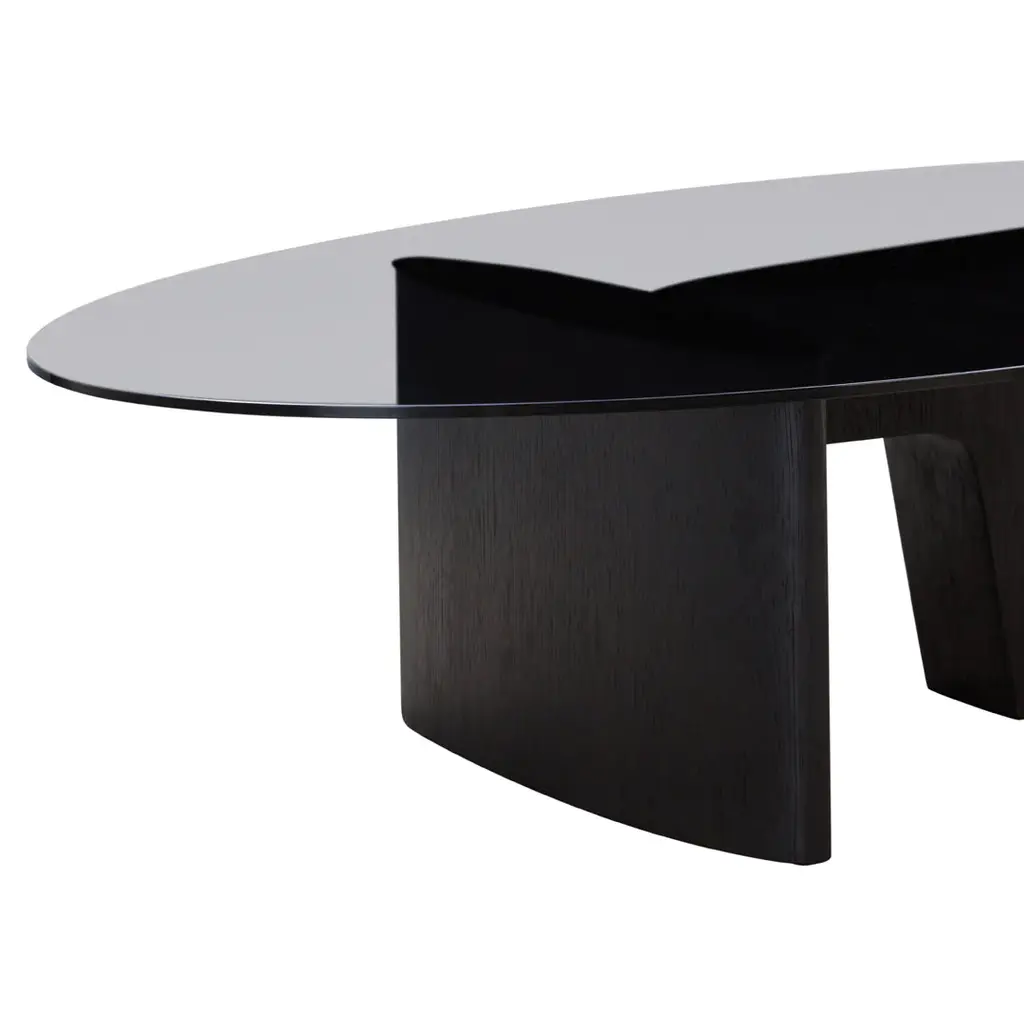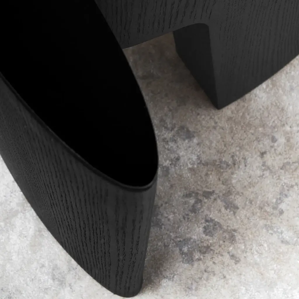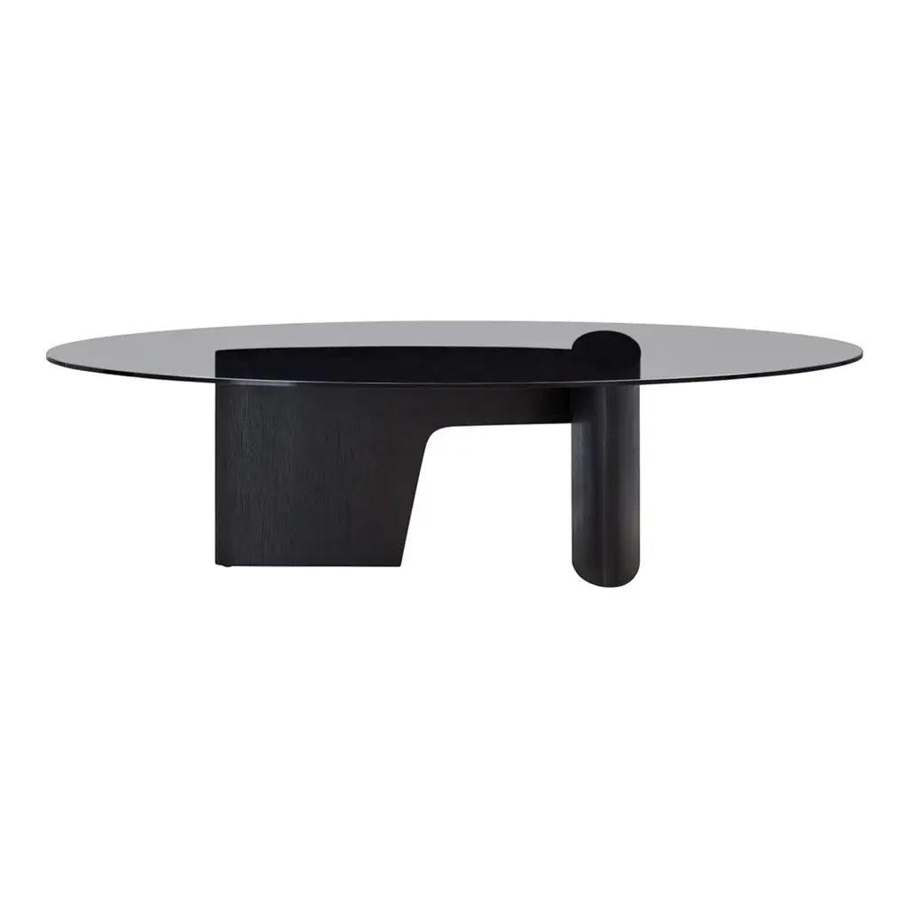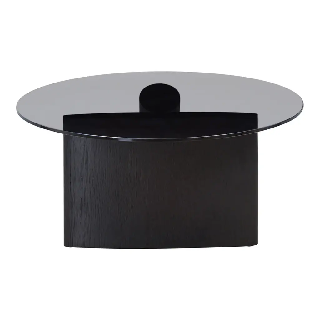Symbolic, archaic references and a sculptural silhouette define the Glyph Occasional Table. A slightly translucent tabletop in black-tinted glass appears to be floating while revealing the characteristic cross-sectional view of the base components in black-stained oak veneer.