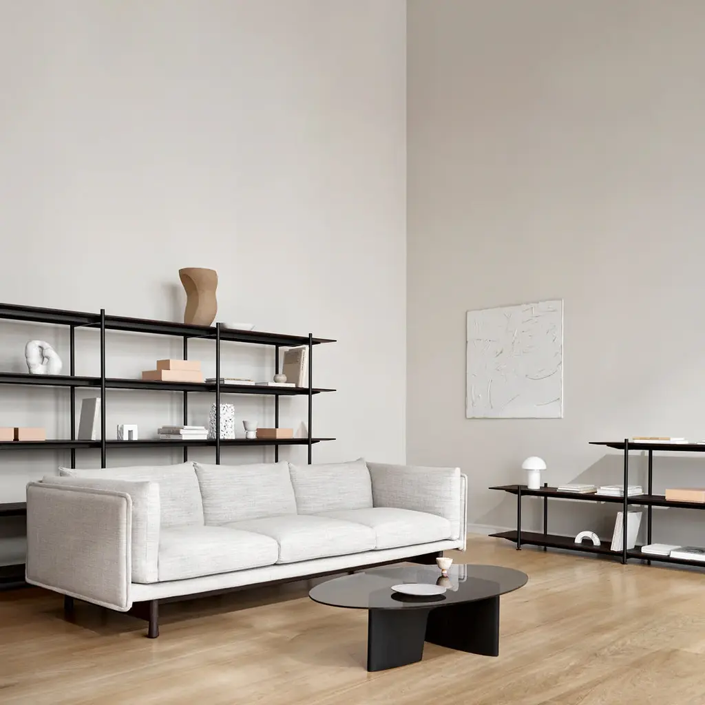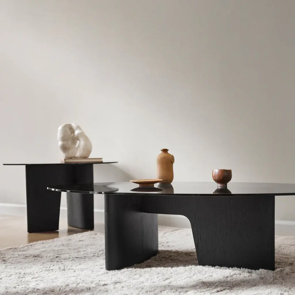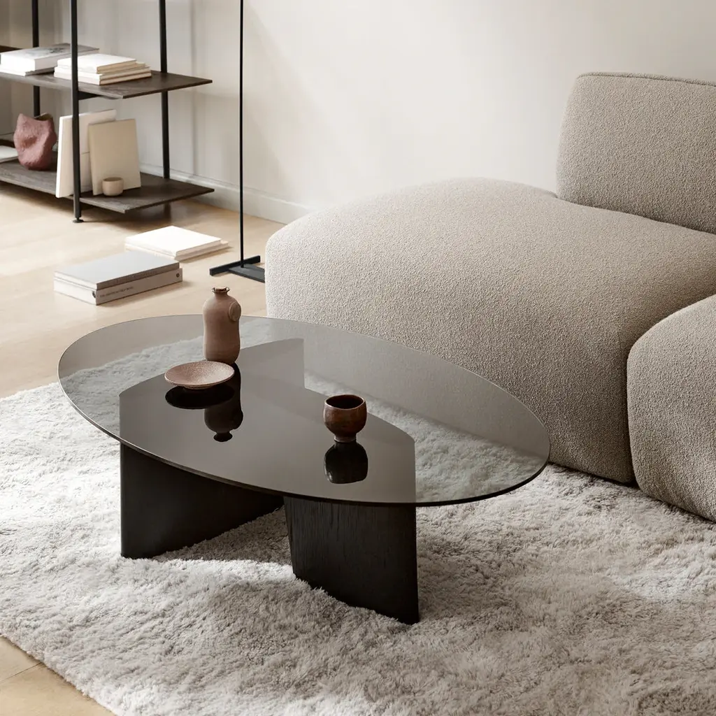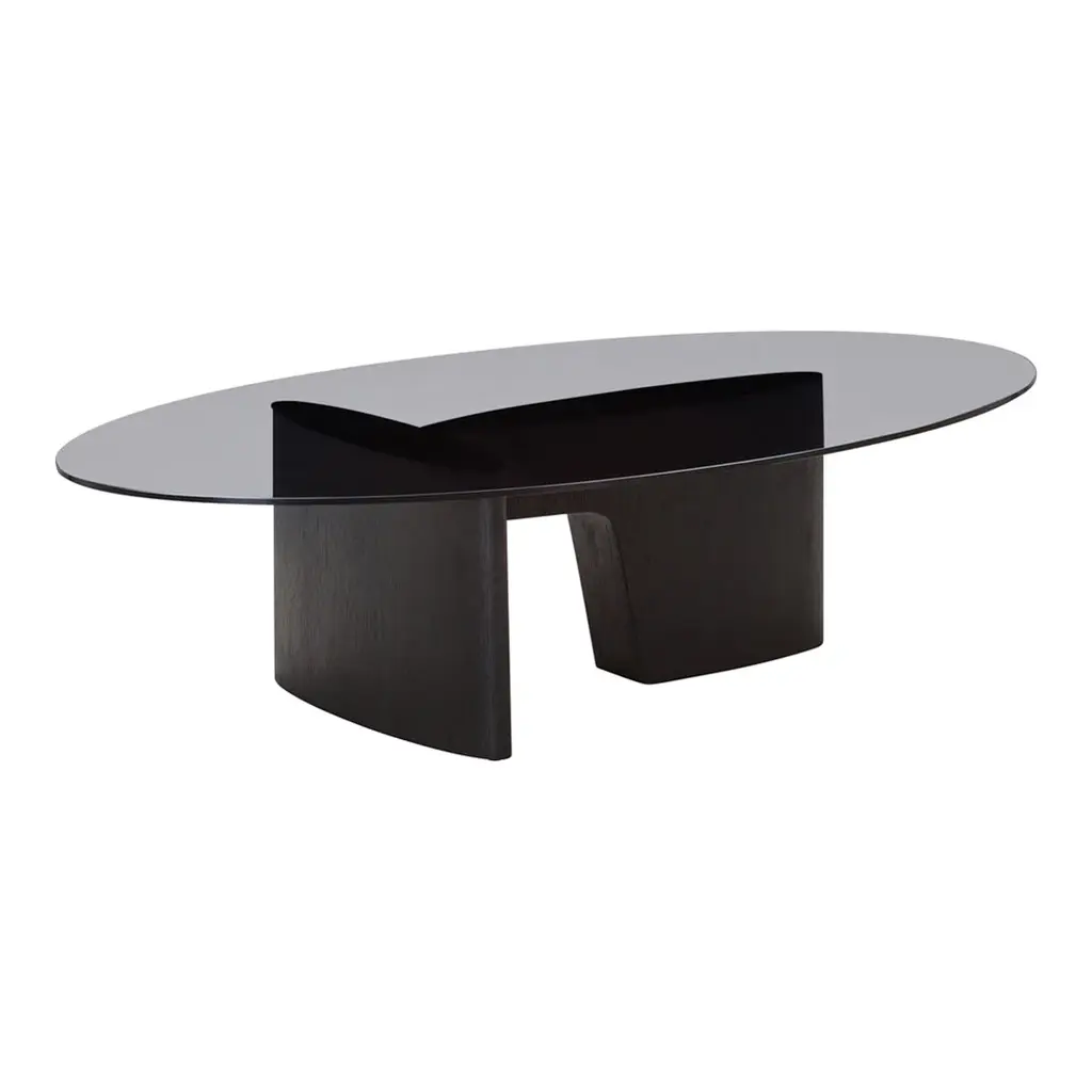 Symbolic, archaic references and a sculptural silhouette define the Glyph Occasional Table. A slightly translucent tabletop in black-tinted glass appears to be floating while revealing the characteristic cross-sectional view of the base components in black-stained oak veneer.