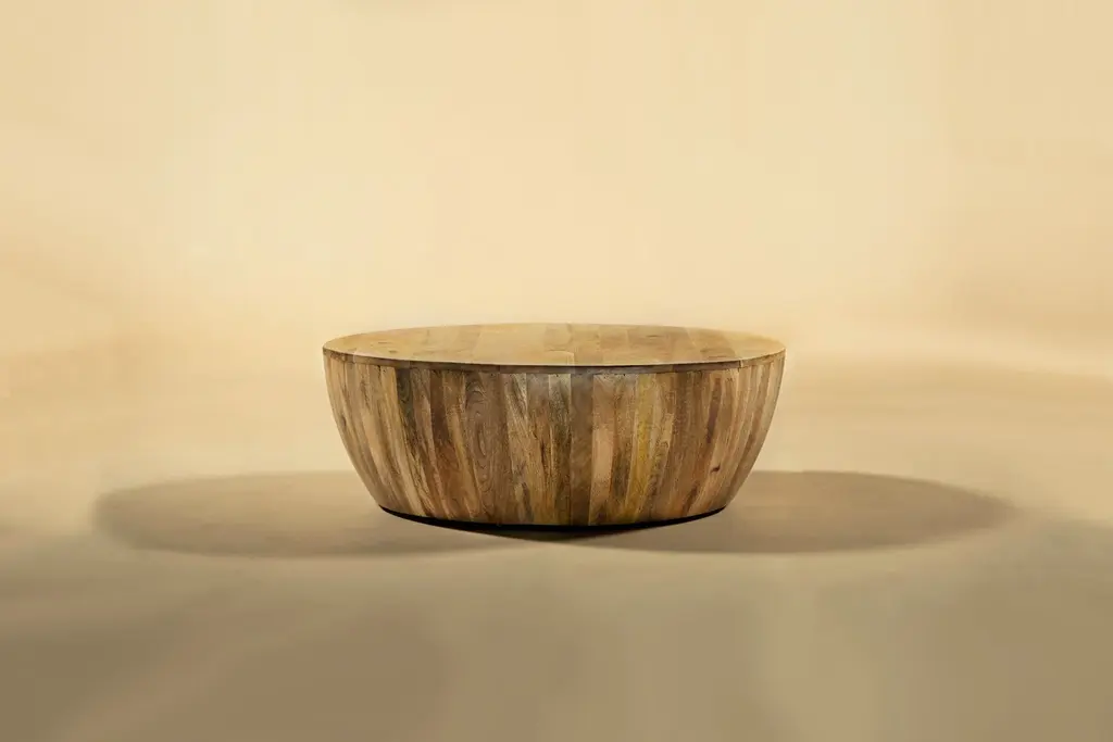 Anchor your favorite sitting spaces with the natural beauty of our Goa Coffee Table. With its ultra modern drum profile formed of kiln-dried mango wood, it offers irresistible natural-toned wood grain with shading variations that make each table a one-of-a-kind piece. Your floors and rugs are protected by stabilizing non-marking rubber feet. Crafted in India, this sleek piece brings worldly charm to your home.