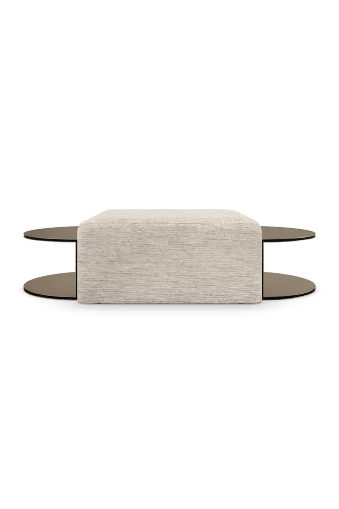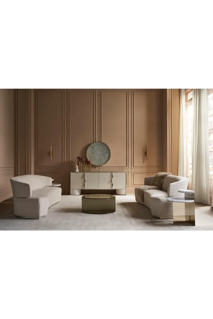 Inspired by the elegance of geometry, the Caracole All Together Cocktail Table is a dual-function masterpiece designed in a semi-circular shape. Pair two of these tables to create a perfect circle. Its innovative design features a double wall of bent metal, creating a captivating, cantilevered structure with upper and lower shelves. It showcases a Champagne Gold finish, elevating any space with its luxurious industrial allure. Pair it with our Bridge the Gap table for a unique cocktail ensemble or use it as individual end tables.Download Assembly Sheet