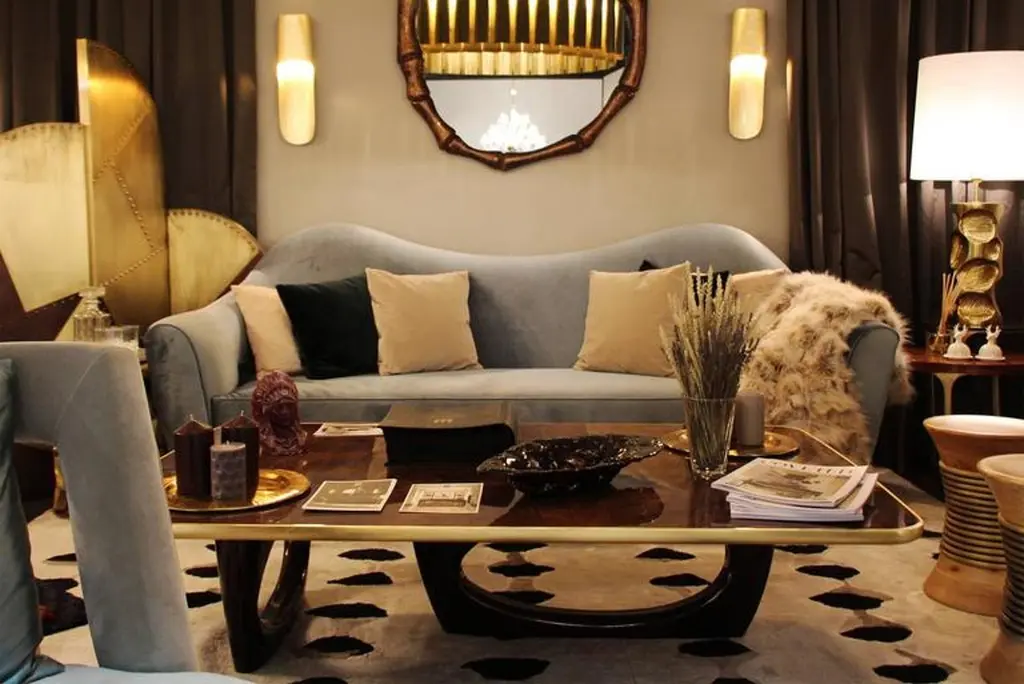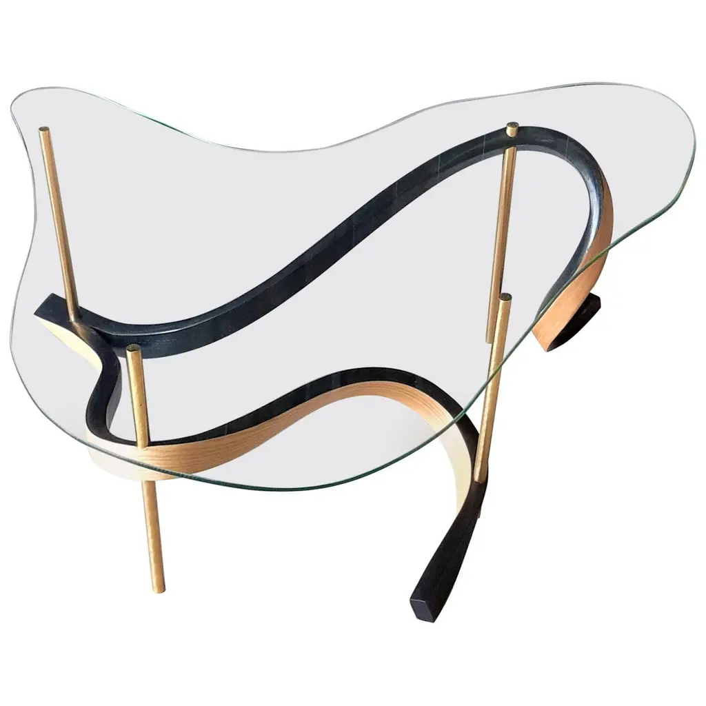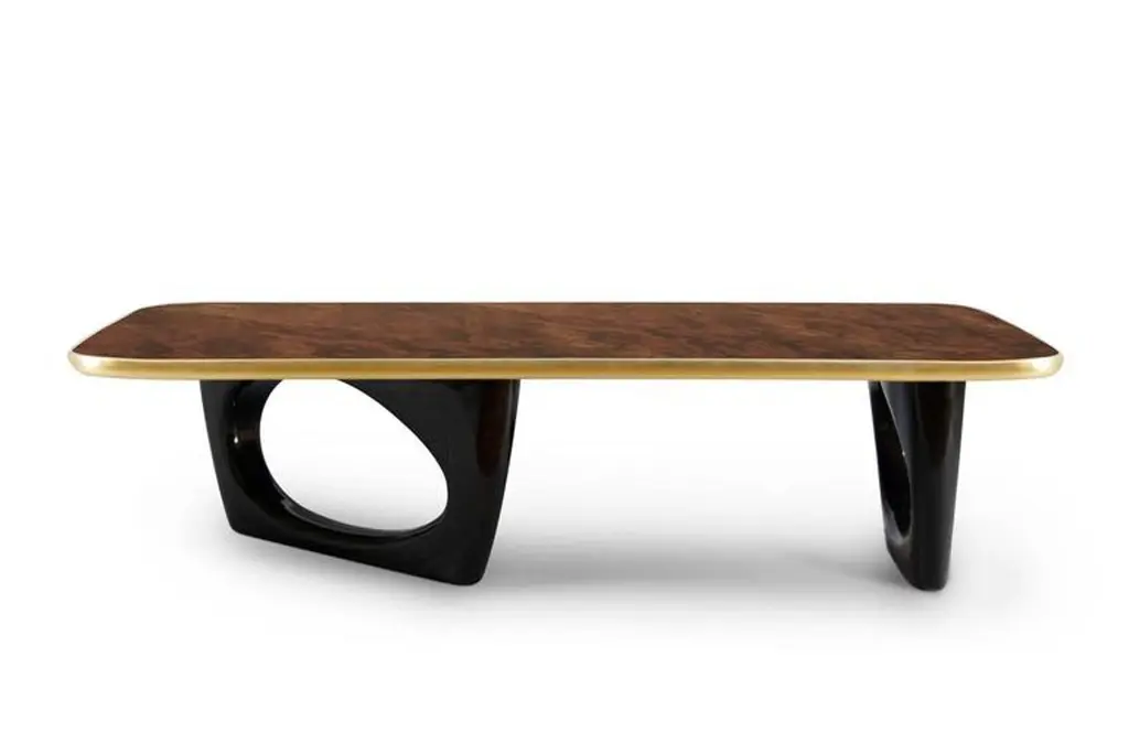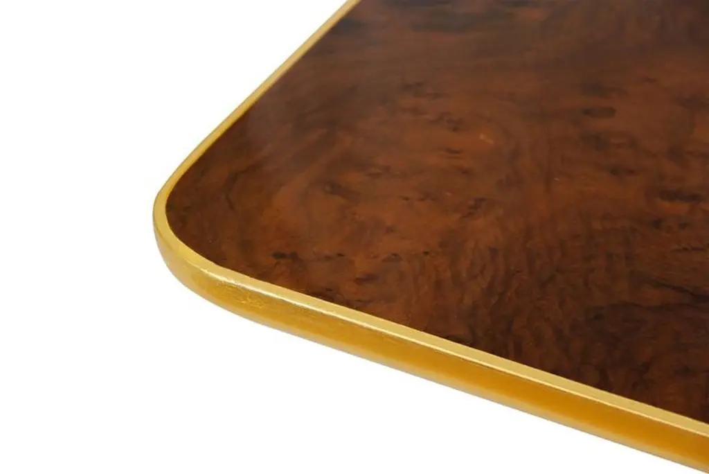 Coffee table gold walnut root with solid walnut topwith a gold leaf frame and black varnished walnut wood base.
