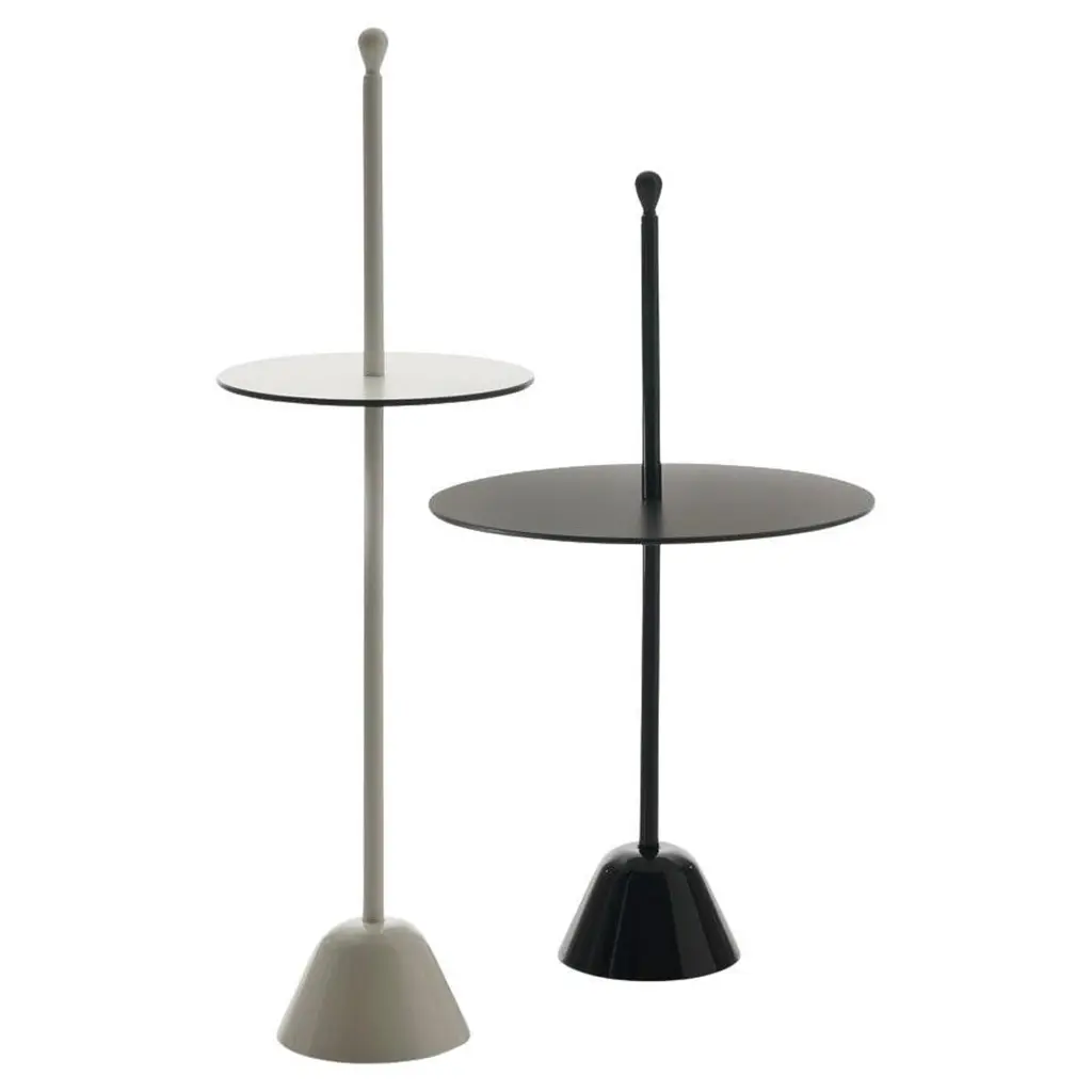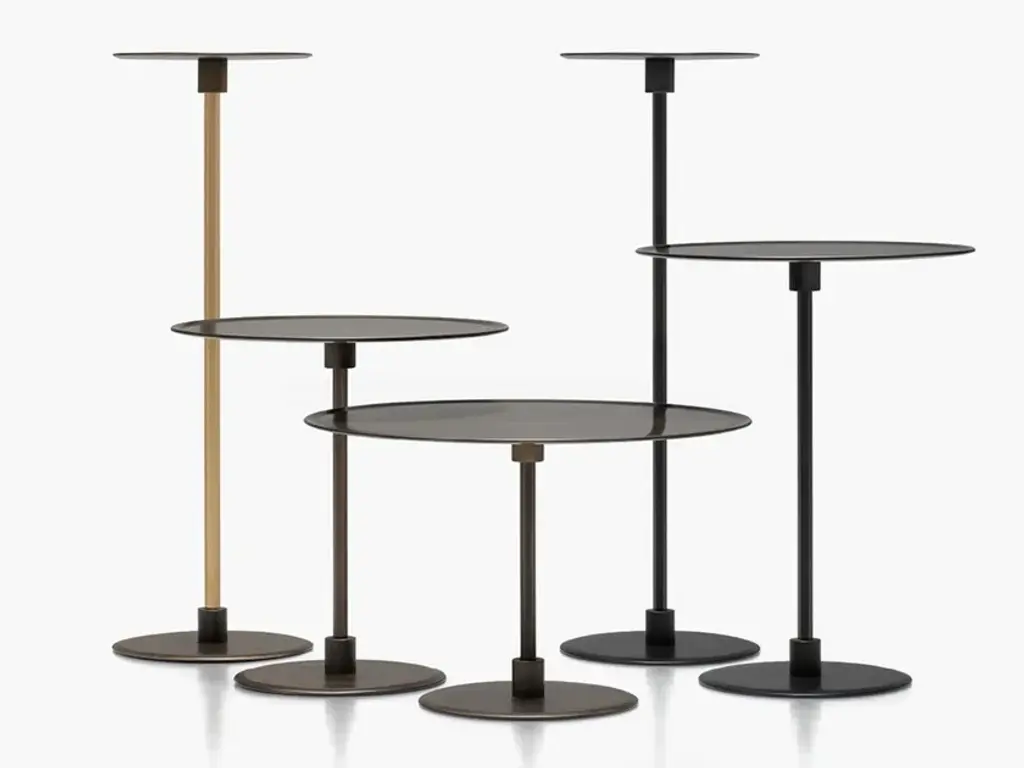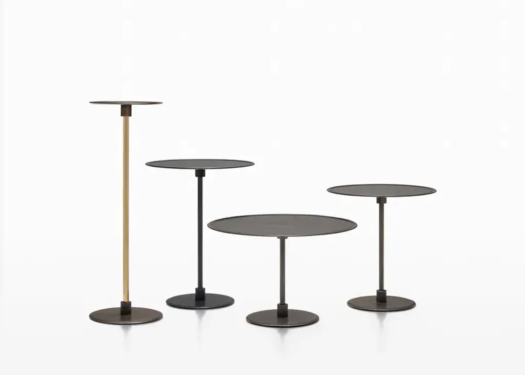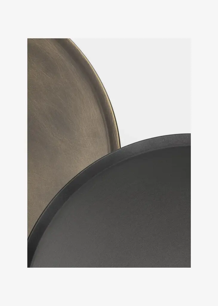 Architect Gianfranco Frattini signed Gong, which was unveiledfor the first time in 1987.Gong is a range of round metal tables of formal simplicity and clean lines, which are available in various sizes and heights, and can be used individually or in groups.Today the collection is enriched with more contemporary finishes and an elegant two-colour version. Top and standThe two metal disks of different widths, one for the base and the other for the slightly concave top, are joined by a hexagonal stand through small metal spools.The side tables are entirely painted in gunmetal or an orbital bronze finish. The stand is in brushed brass for the two- coloured version and sharply contrasts with the two finishes. Orbital bronze: hand-brushed handcrafted finish to create the “scratched” effect.