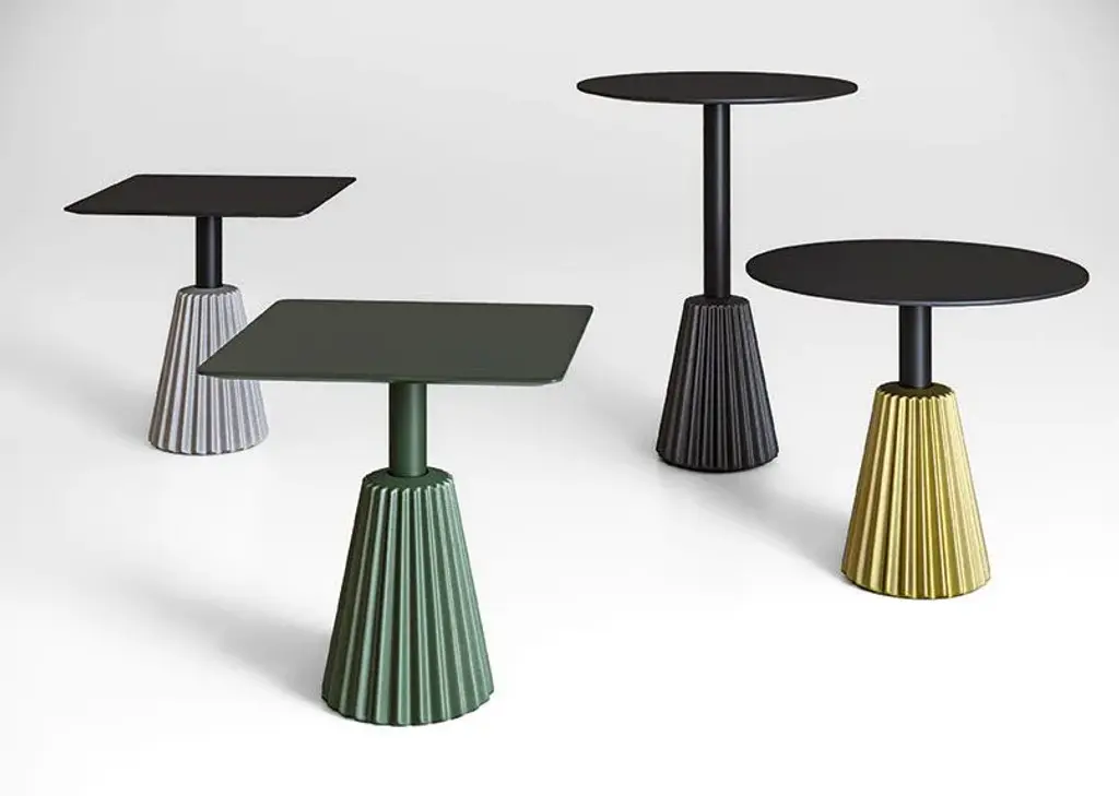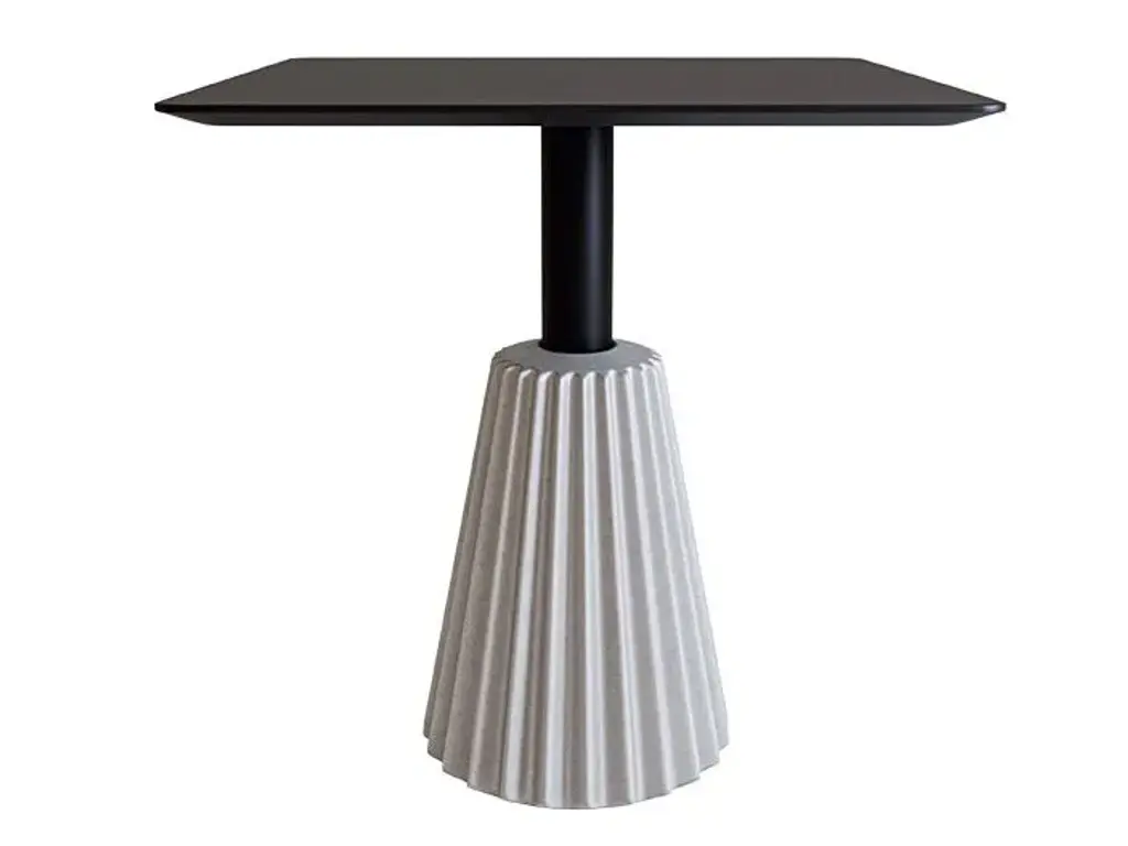 Table with base made of concrete agglomerate natural or painted and metal stand. The version with metal plate at the ground has the purpose to support tops of larger size. The top to match with can be round or square in all types and finishes proposed in the catalogue and in the sample bookAn iconic accessory of the aristocratic wardrobe of the XVI and XVII century. In this collection of tables the pleated process becomes the distintive element that enanches and refines the concrete base. Suitable both for indoor, contract or residential, and outdoor