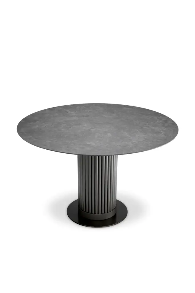Table with base made of concrete agglomerate natural or painted and metal stand. The version with metal plate at the ground has the purpose to support tops of larger size. The top to match with can be round or square in all types and finishes proposed in the catalogue and in the sample bookAn iconic accessory of the aristocratic wardrobe of the XVI and XVII century. In this collection of tables the pleated process becomes the distintive element that enanches and refines the concrete base. Suitable both for indoor, contract or residential, and outdoor