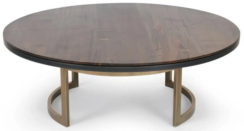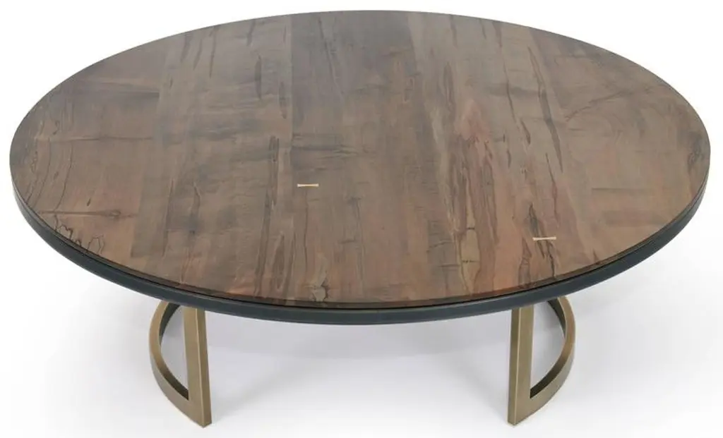 The luxurious Gotham coffee table features a two-tiered tabletop and an elegantly curved architectural bronze base. The top layer is handcrafted oxidized ambrosia maple bookmatched planks with bronze butterflies, and the bottom is blackened bronze encased in epoxy resin.Standard size options- 10-12 week lead time (price varies by size):D: 42 in. / H 17 in.D: 48 in. / H 17 in.D: 54 in. / H 17 in.D: 60 in. / H 17 in.Available Gotham wood species and finishes:Black walnut: Natural, medium brown.White oak: Charcoal brown, black.Hard maple: Oxidized.Available Gotham Pb-R (metal encased in epoxy resin) and finishes:Zn-R (zinc): Blackened/burnished, light patina/burnished.Cu-R (copper): Blackened/burnished, light patina/burnished.Brz-R (bronze): Blackened/burnished, light patina/burnished.Other available Pb-R finishes:Zn-R (zinc): Brushed.Cu-R (copper): Brushed.Crs-R (cold rolled steel): Blackened, burnished.Al-R (aluminum): Burnished.Custom sizing and finishes available. Please inquire.
