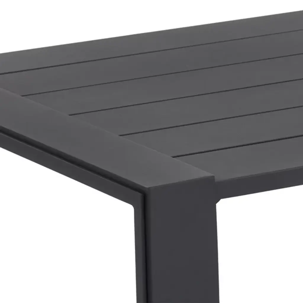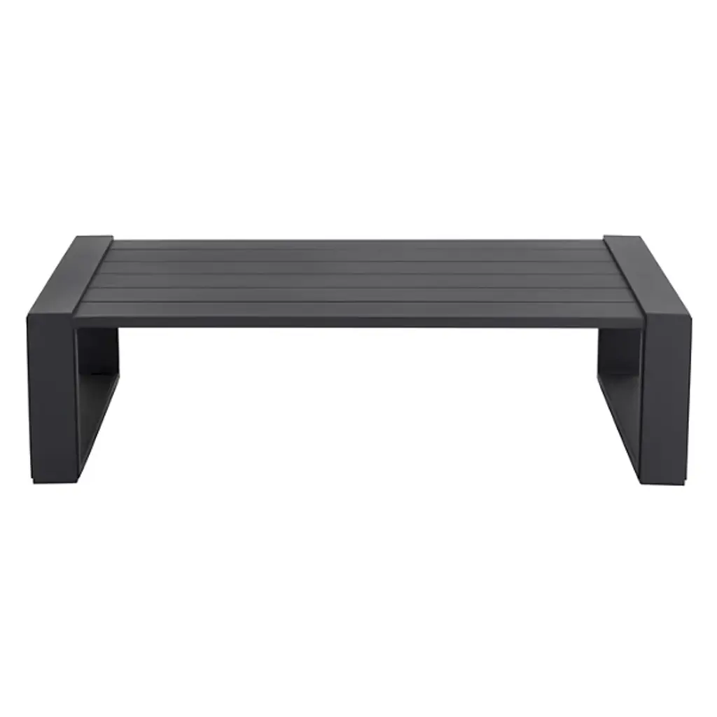 Bold and beautiful. The Grado Outdoor Coffee Table from Sunpan anchors the home’s aesthetic out on the patio as a solid construction of geometric shapes. The piece creates an inviting feeling thanks to its short and open frame structure. This rectangular structure is crafted from a resilient powder-coated aluminum. Giving off a floating quality above, the tabletop sports slats that help filter water or spills. The tabletop’s linear pattern recalls classic outdoor tables for a familiar touch.