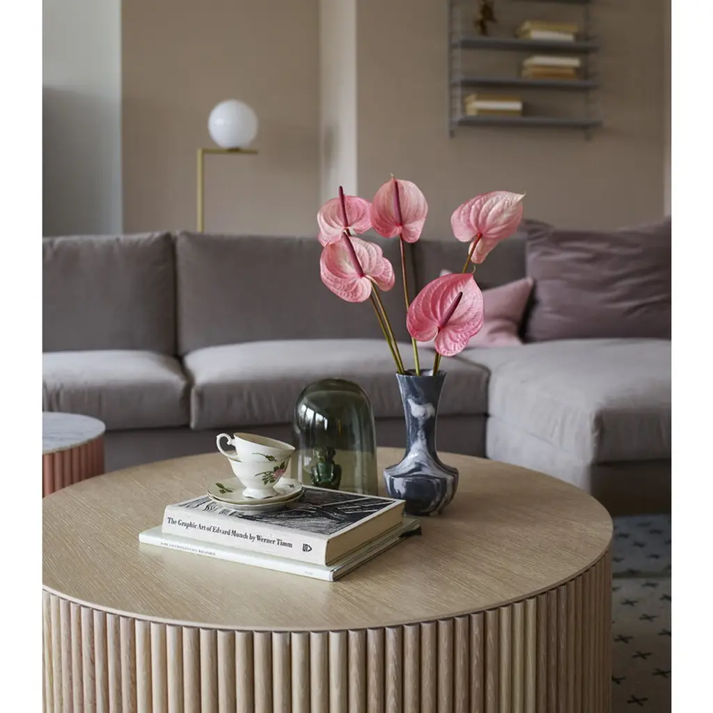 The Grand Palais coffee table stands out with all its majestic grandeur. The top of the round table does not come over the stand, allowing the wooden paneling to attract all the attention. The Grand Palais coffee table is part of the Palais collection designed by Anya Sebton & Eva Lilja Löwenhielm for Asplund. Although the collection is a prime example of modern Scandinavian simplicity, it also has an air of luxury and elegance of ancient palaces, as the collection was inspired by the splendor of castles and palaces of bygone days with their columns, pedestals and wooden panelings. The forms and names of the furniture have also been inspired by Daniel Buren’s art installation called Les Deux Plateaus located in the inner courtyard of the Palais Royal in Paris.