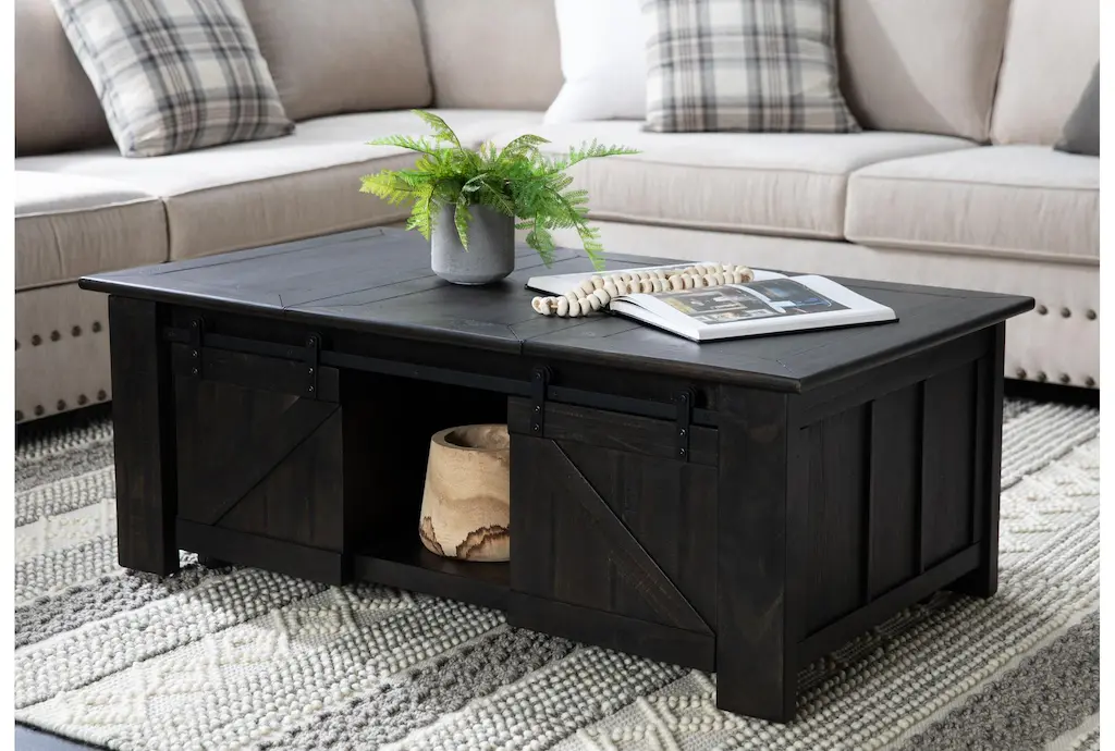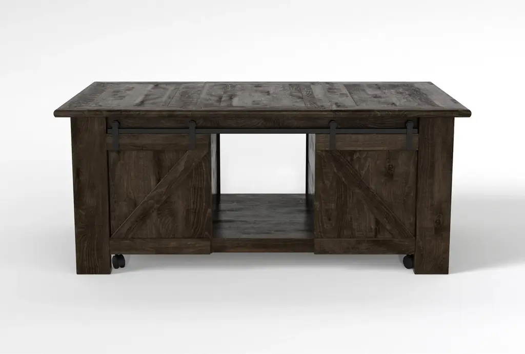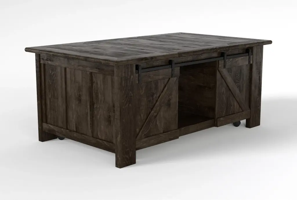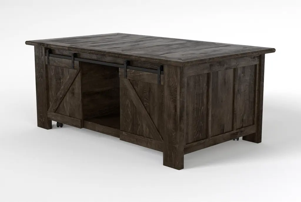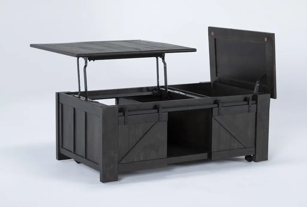 When it comes to furniture with character, our Grant cocktail table delivers that and more. From the paneled pine construction and industrial metal details, to the charming weathered charcoal finish, this piece will bring rustic warmth to your home. In addition to casters and a lift-top design, it boasts unique sliding barn door detail on both sides. Shop coffee tables like this one and find the perfect design for your space.